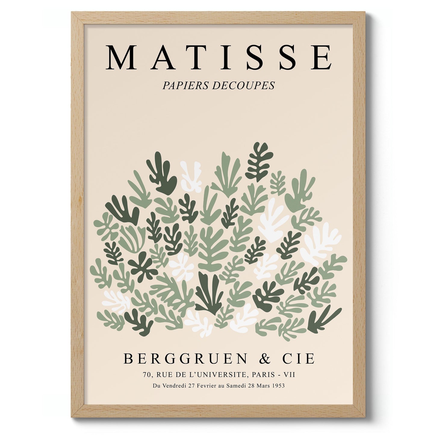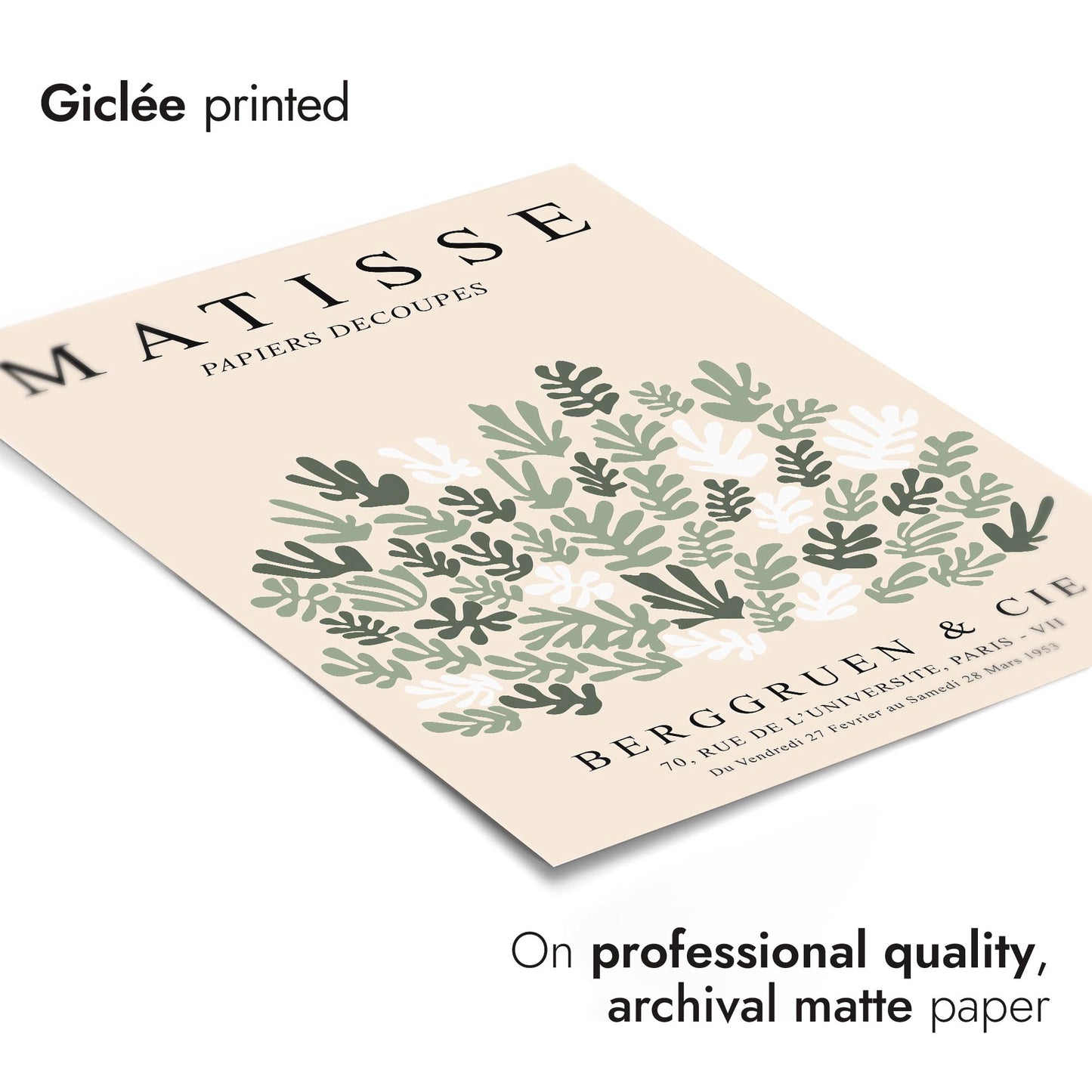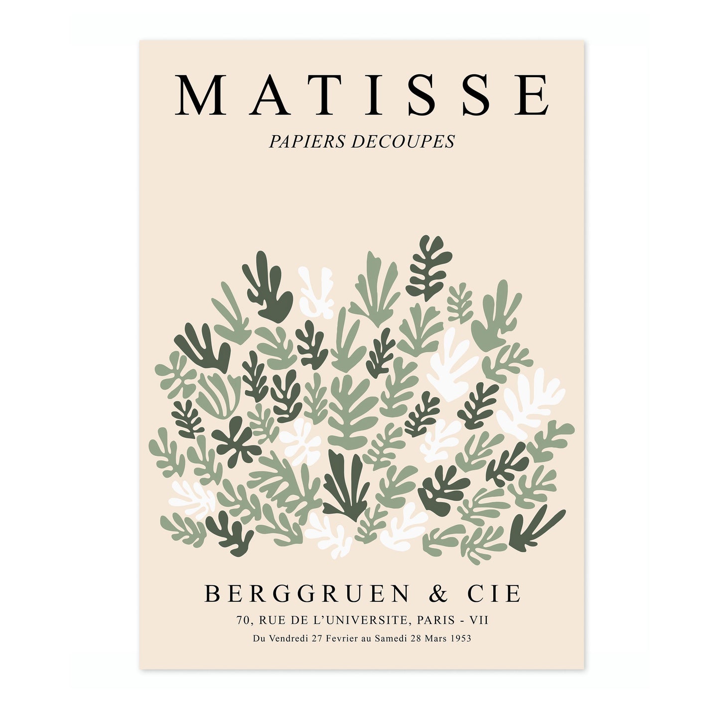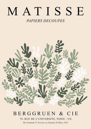 This "Green Leaves" exhibition poster features Henri Matisse's iconic cutout style, showcasing an array of green and white foliage. Graphically arranged, the leaves form a delicate pattern on a neutral background, capturing the essence of Matisse's masterful work. Perfect for adding a touch of nature-inspired art to your space. Ideal for fans of Matisse and modern collage art.