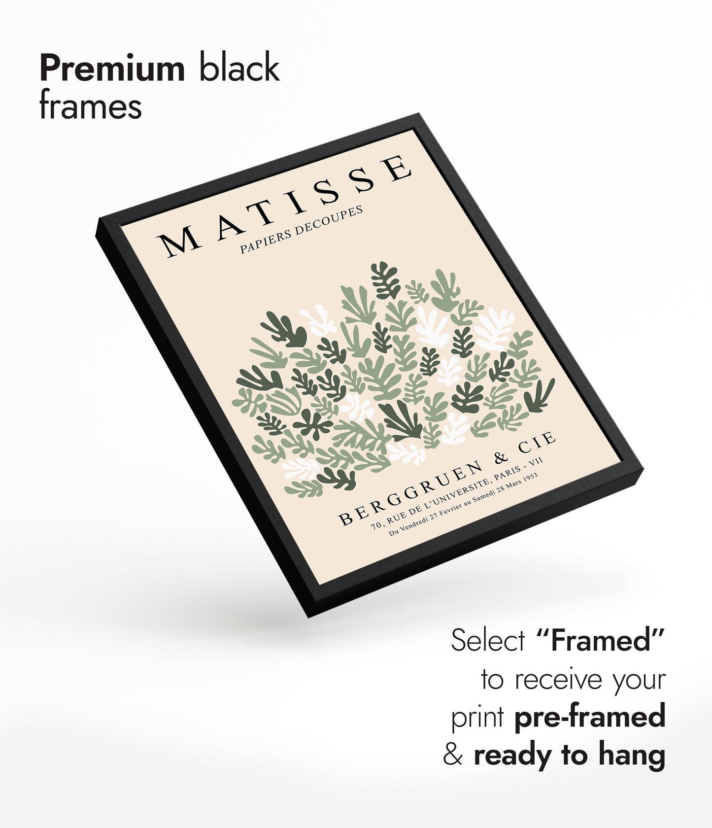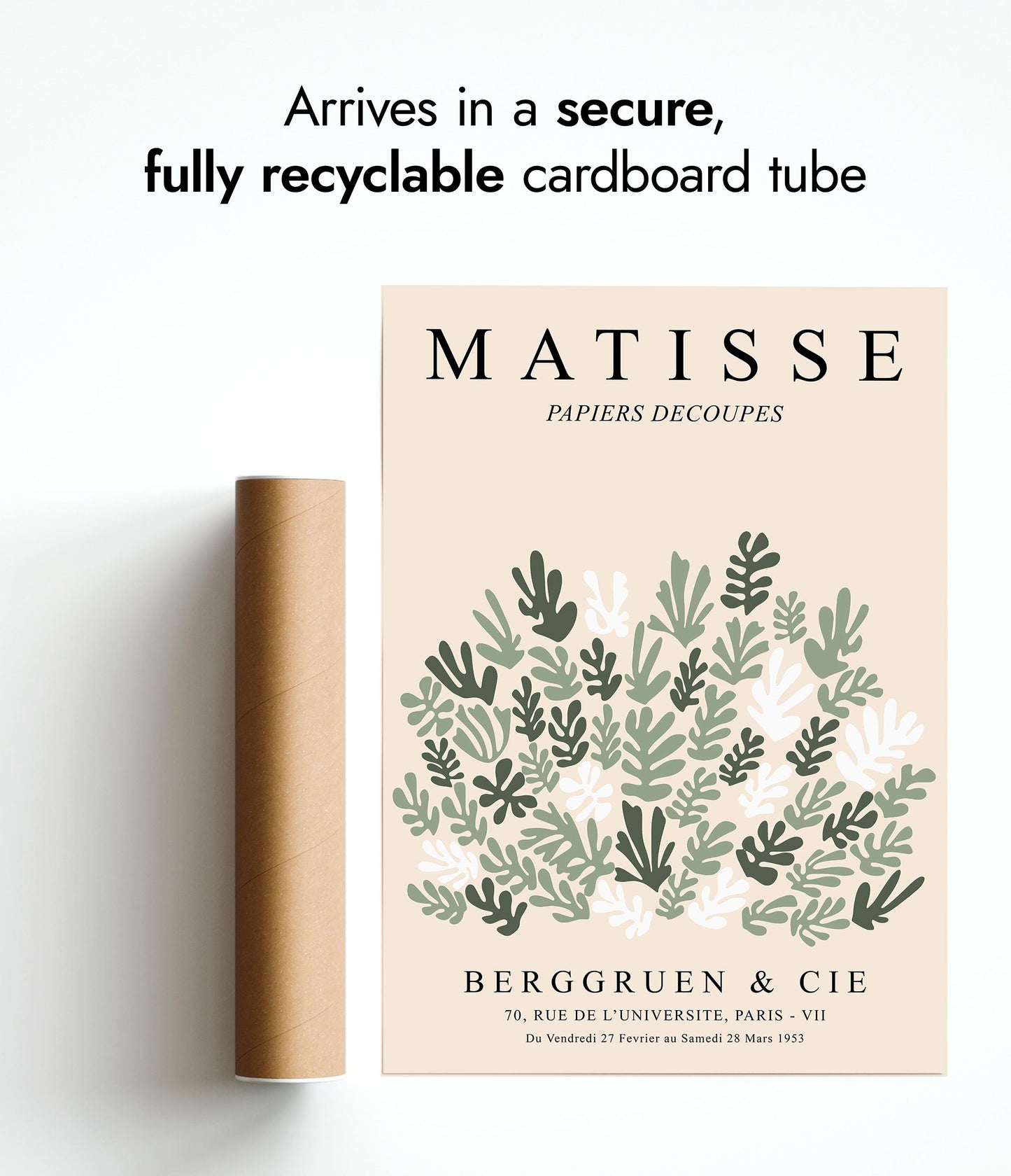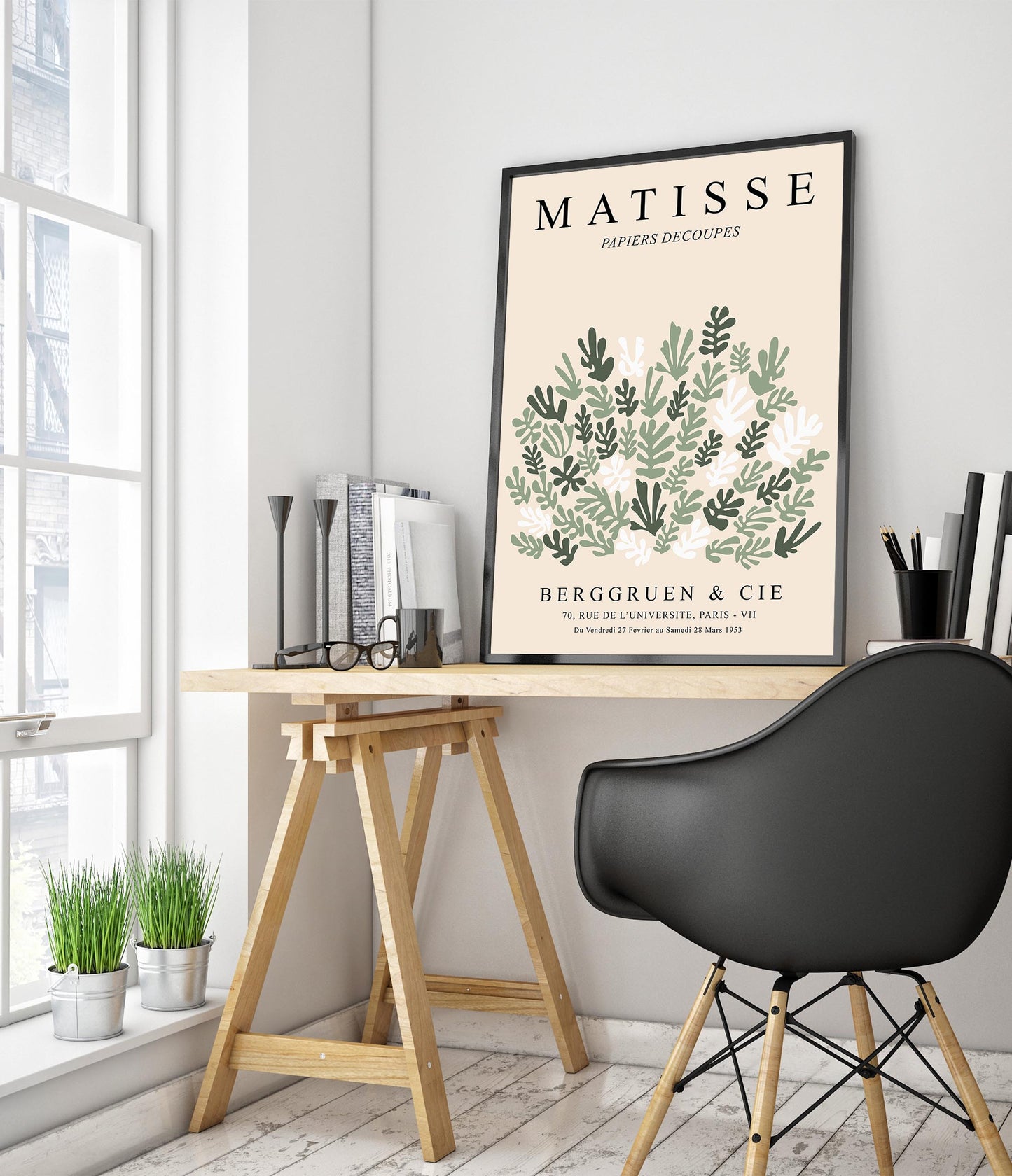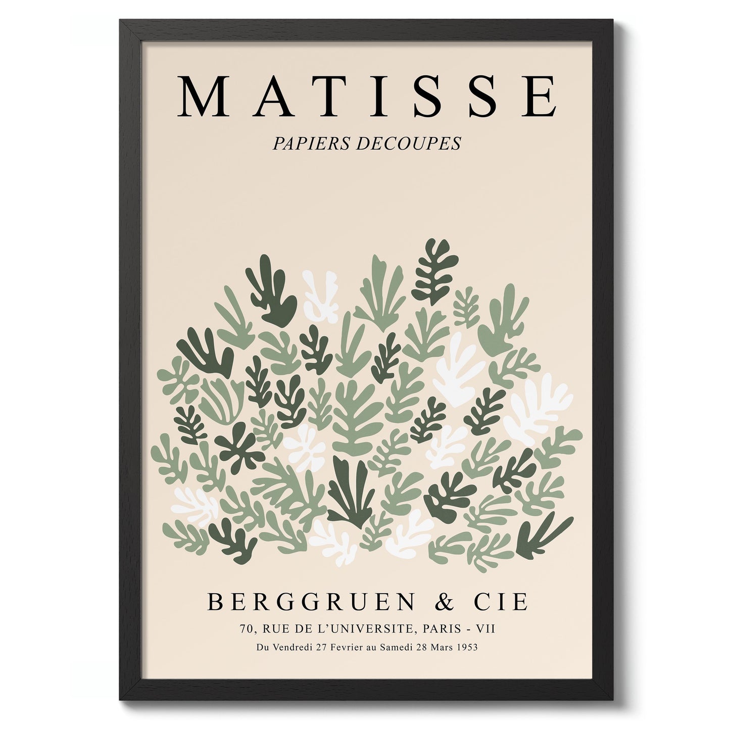 This "Green Leaves" exhibition poster features Henri Matisse's iconic cutout style, showcasing an array of green and white foliage. Graphically arranged, the leaves form a delicate pattern on a neutral background, capturing the essence of Matisse's masterful work. Perfect for adding a touch of nature-inspired art to your space. Ideal for fans of Matisse and modern collage art.