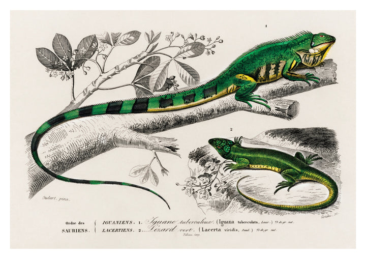 "Green Lizards" is a vintage-style illustration poster by Charles D'Orbigny, showcasing two vibrantly coloured green lizards on a branch. This zoological artwork blends scientific accuracy with artistic detail, highlighting the intricate patterns and natural habitat of these reptiles. Perfect for nature enthusiasts and animal lovers, this poster adds a touch of classic illustration to any space.