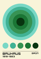 Green Triptych wall art set features three posters in a Bauhaus and modern style. The graphic illustrations include geometric shapes and abstract flower motifs. Each print combines green hues with distinct forms, offering a cohesive gallery wall aesthetic. Ideal for modern interiors looking to incorporate classic design elements through high-quality prints and posters.