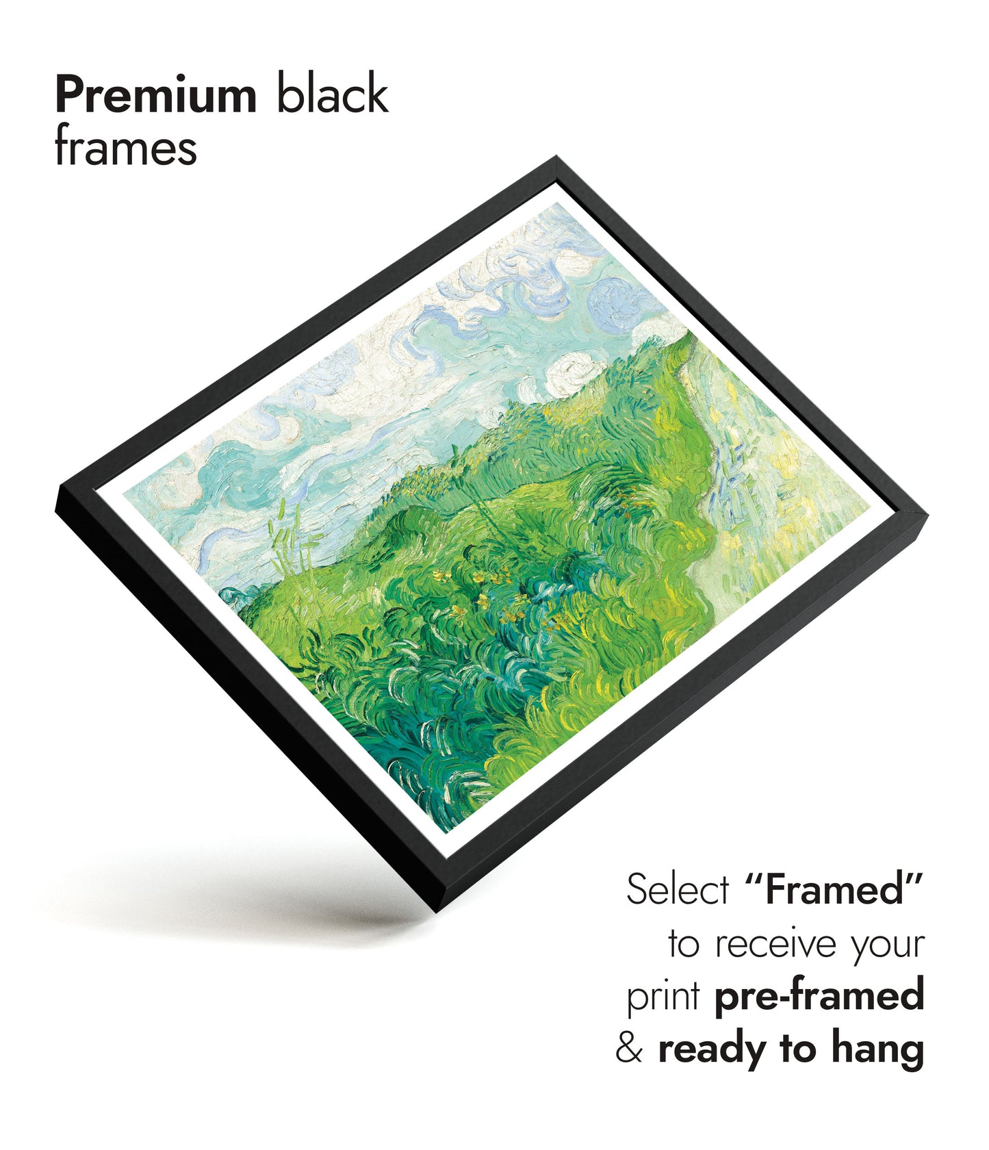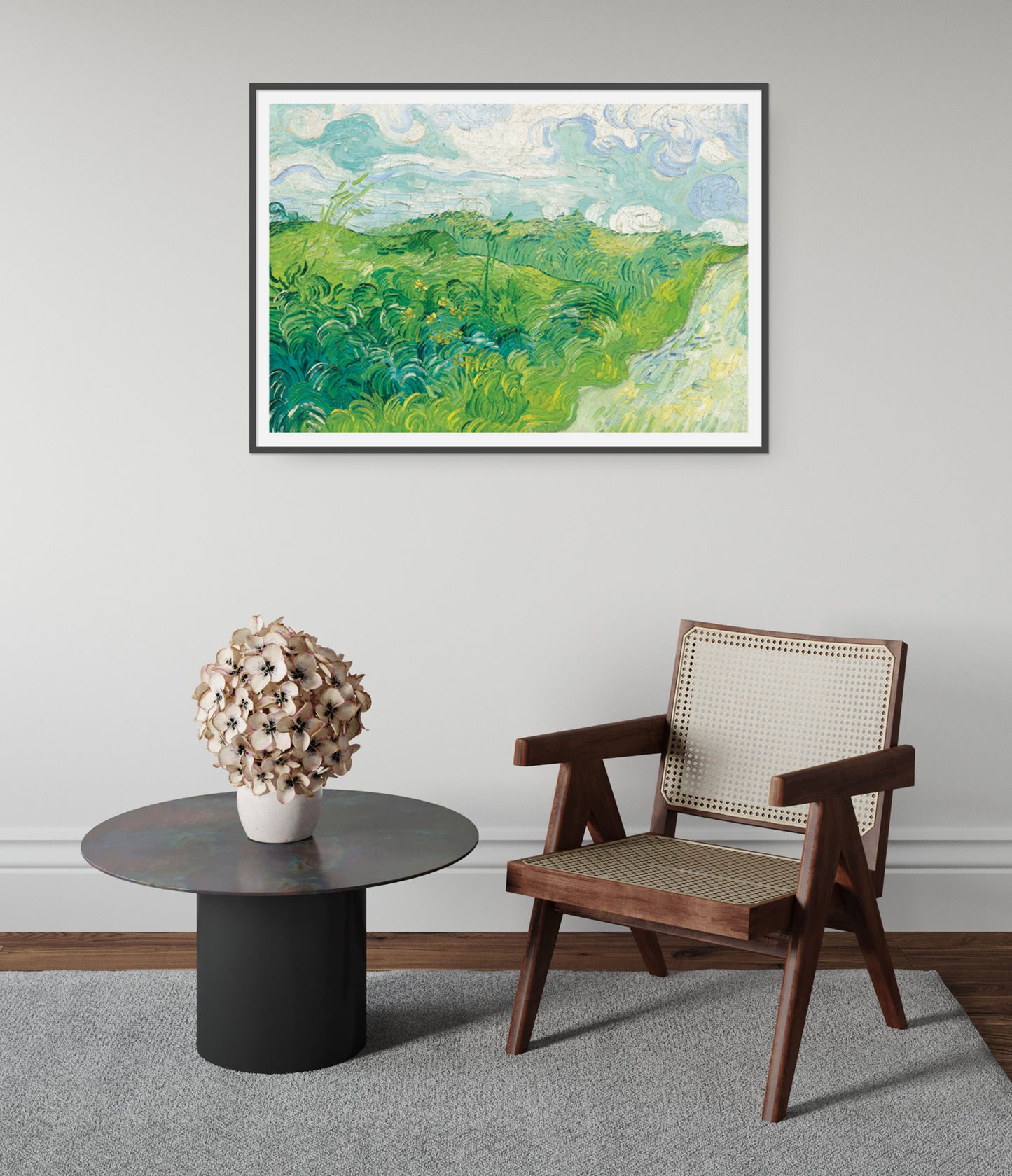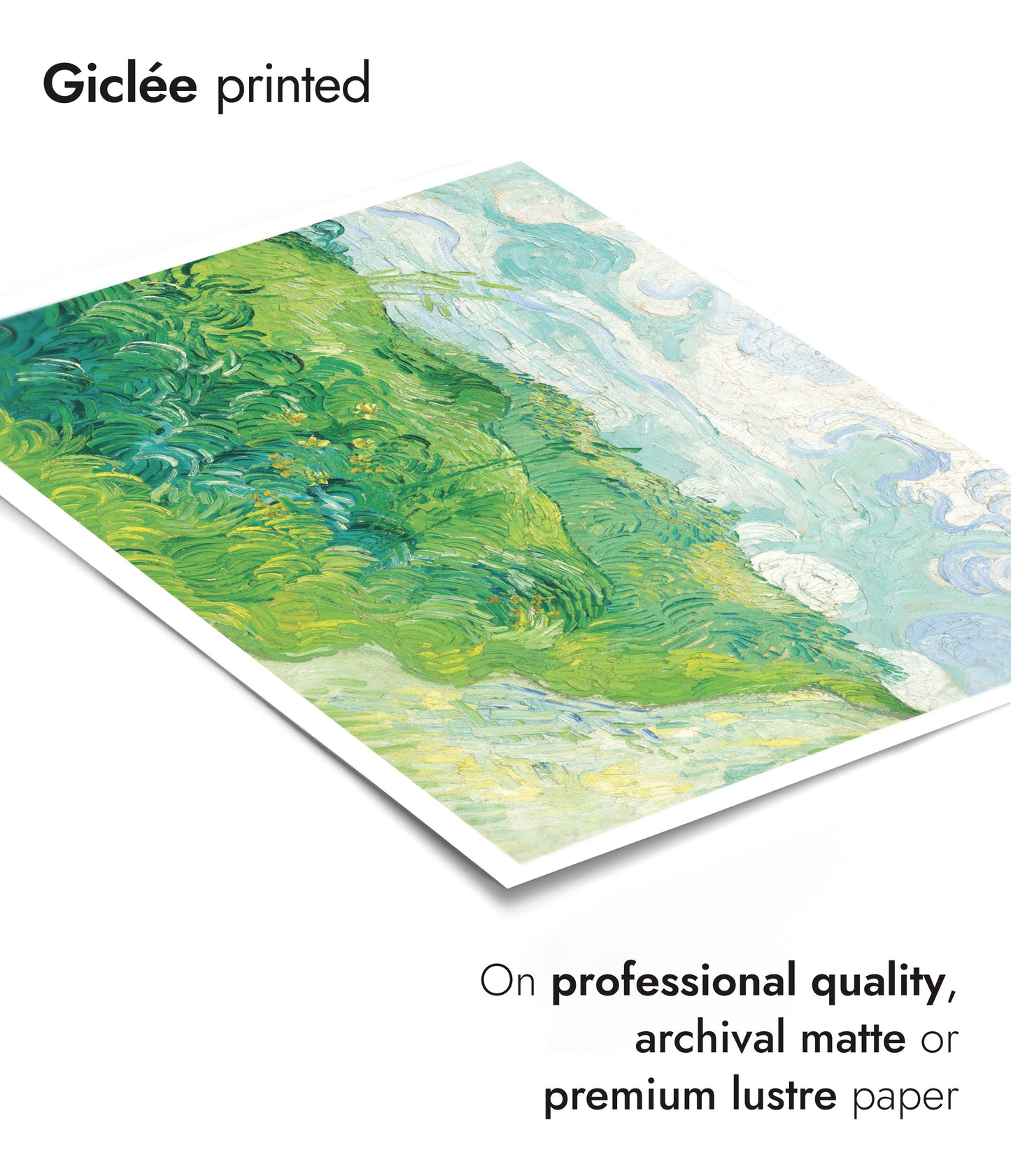"Green Wheat Fields, Auvers" is a stunning landscape poster by Vincent Van Gogh, showcasing lush, rolling green fields under a dynamic sky. This Post-Impressionist masterpiece captures the vitality of rural life, with swirling brushstrokes creating movement and texture. Ideal for adding a touch of classic art to any space, this poster highlights Van Gogh's evocative style and vibrant palette.