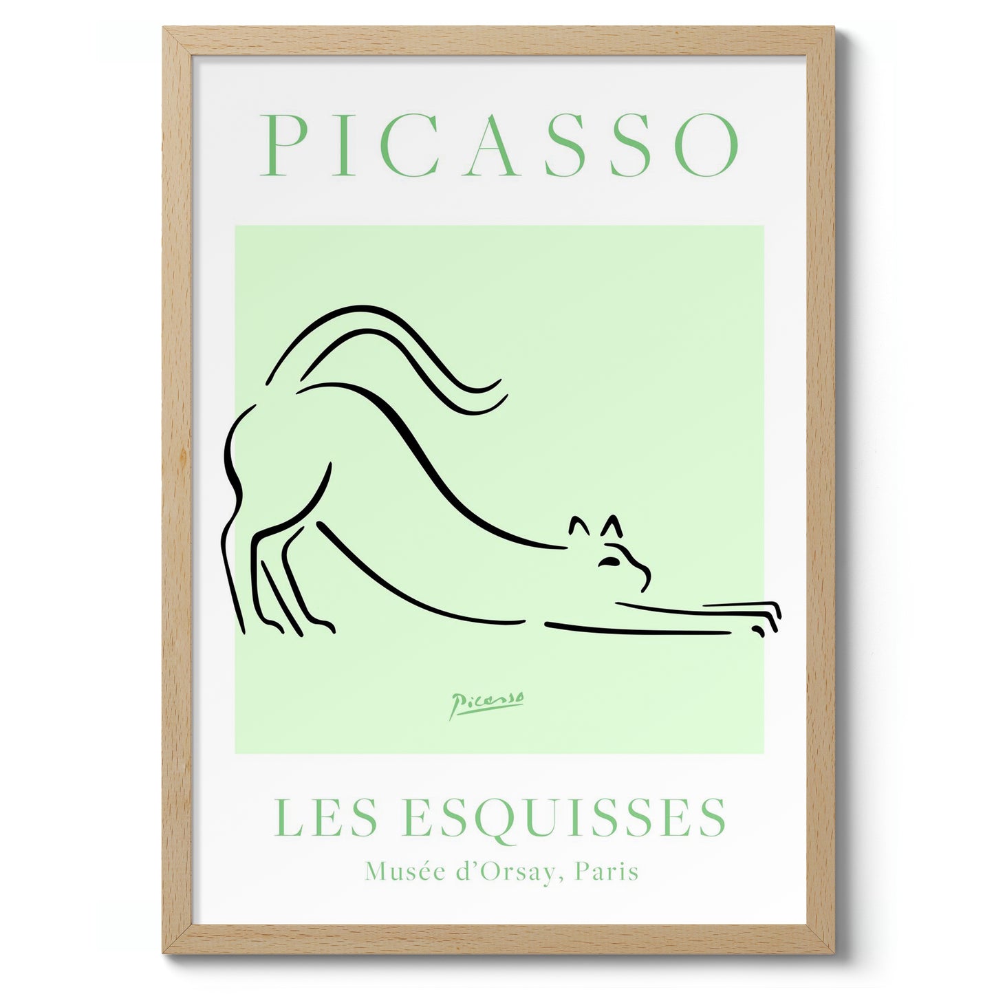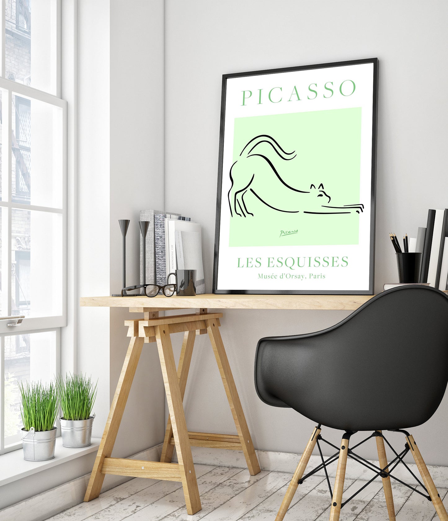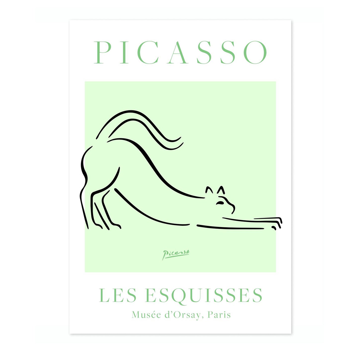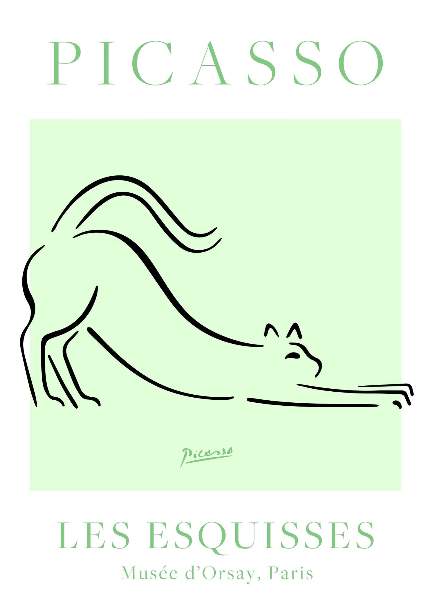 This minimalist poster features Pablo Picasso's elegant line art sketch of a stretching cat, set against a light green background. The simplicity captures the flowing grace of feline movement, showcasing Picasso's masterful use of line. Ideal for cat lovers or art enthusiasts, this poster adds a touch of sophistication to any space while celebrating timeless artistry.
