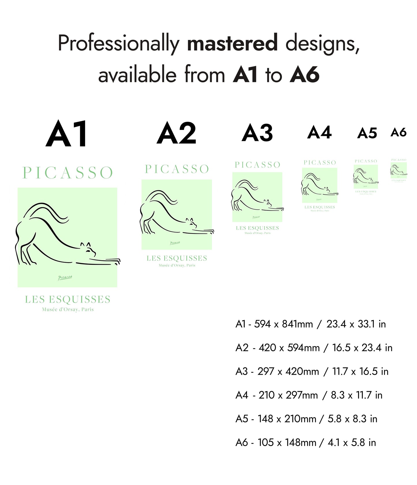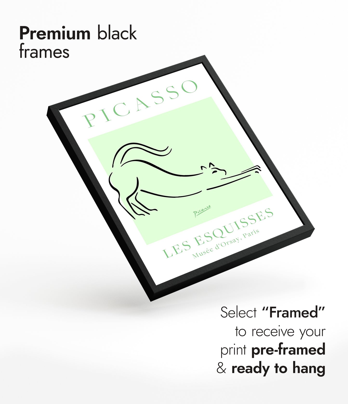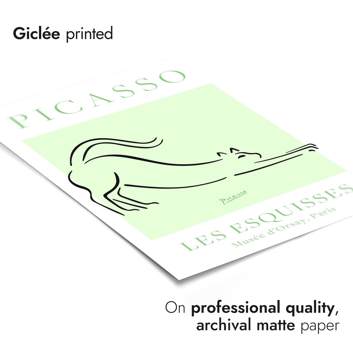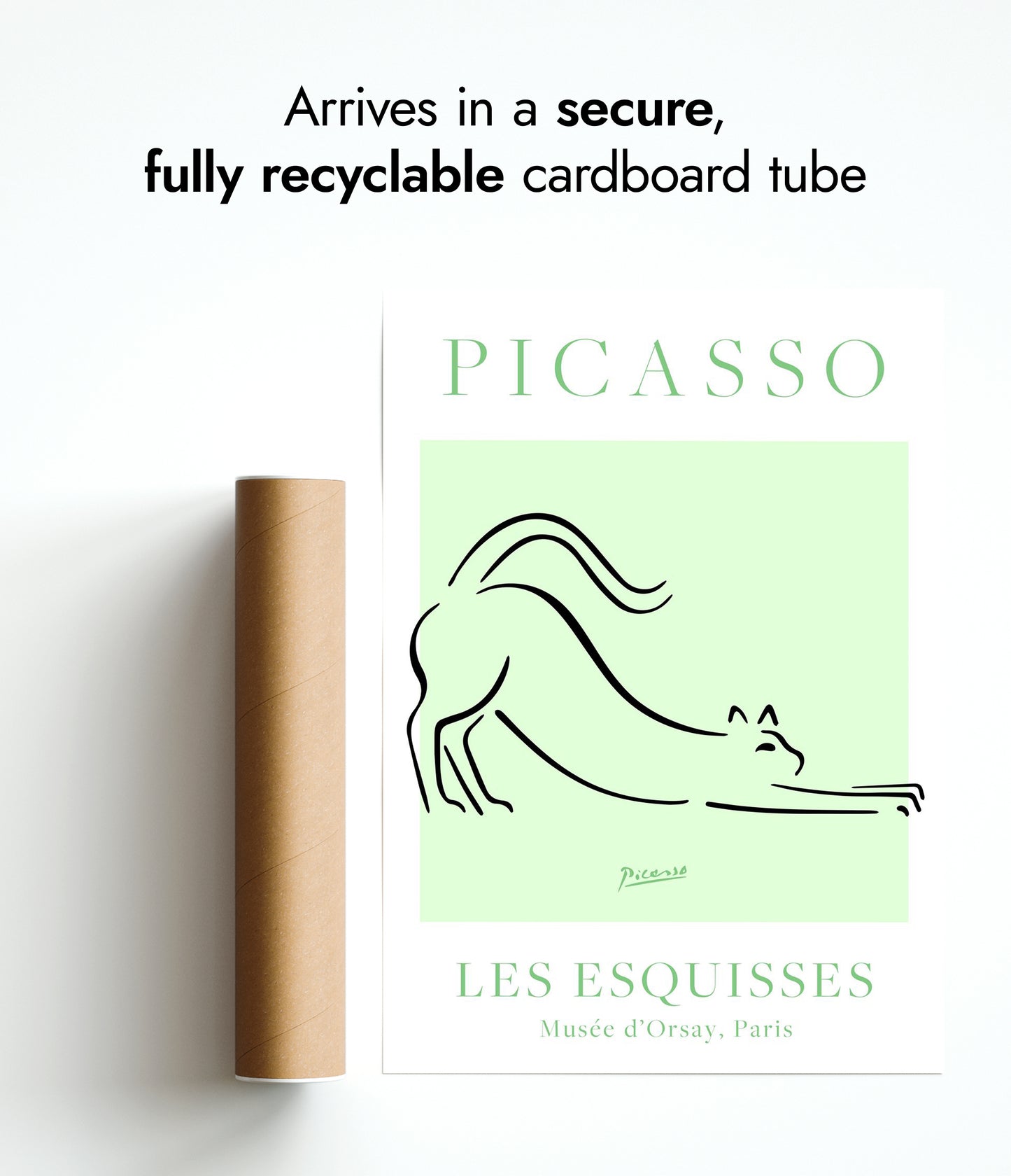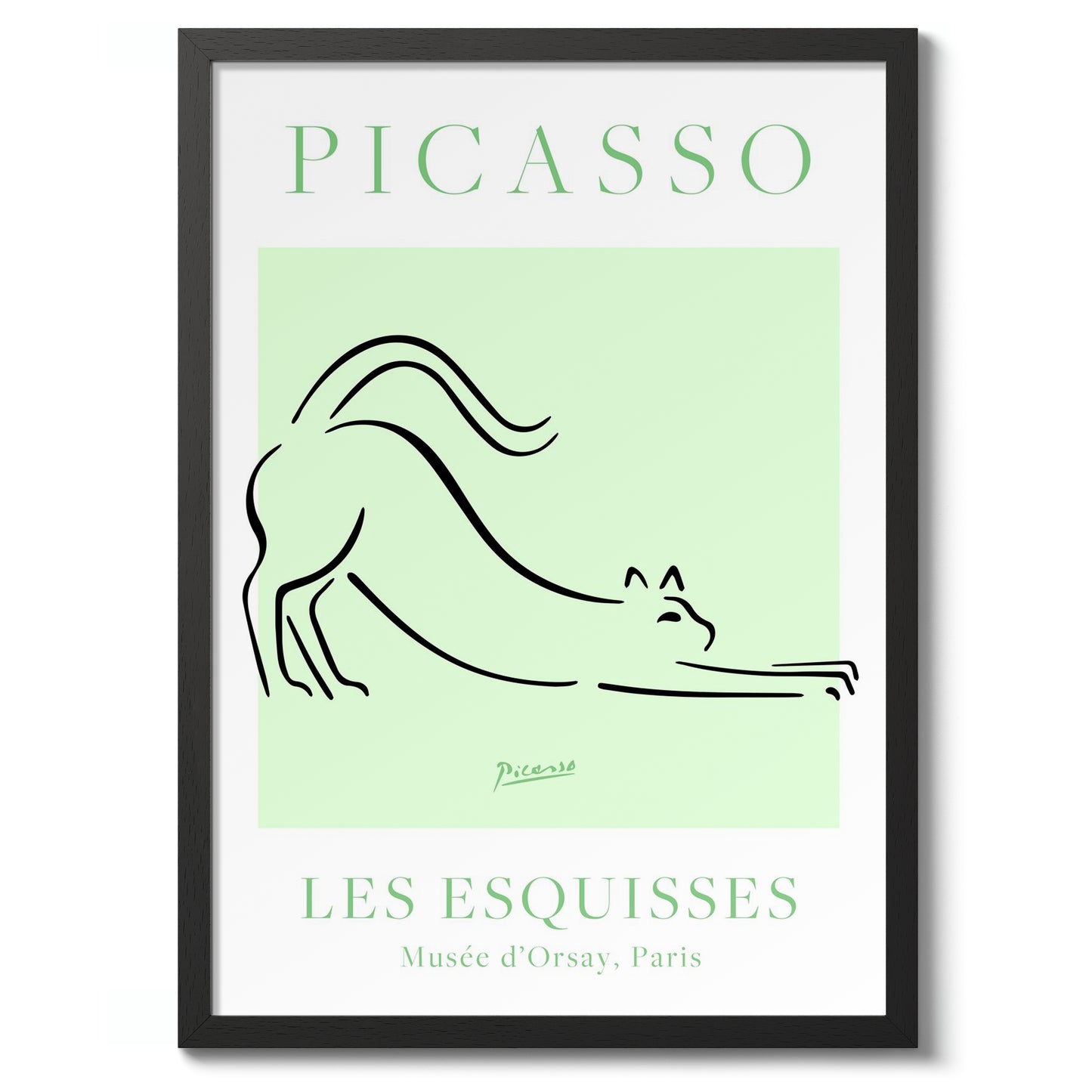 This minimalist poster features Pablo Picasso's elegant line art sketch of a stretching cat, set against a light green background. The simplicity captures the flowing grace of feline movement, showcasing Picasso's masterful use of line. Ideal for cat lovers or art enthusiasts, this poster adds a touch of sophistication to any space while celebrating timeless artistry.