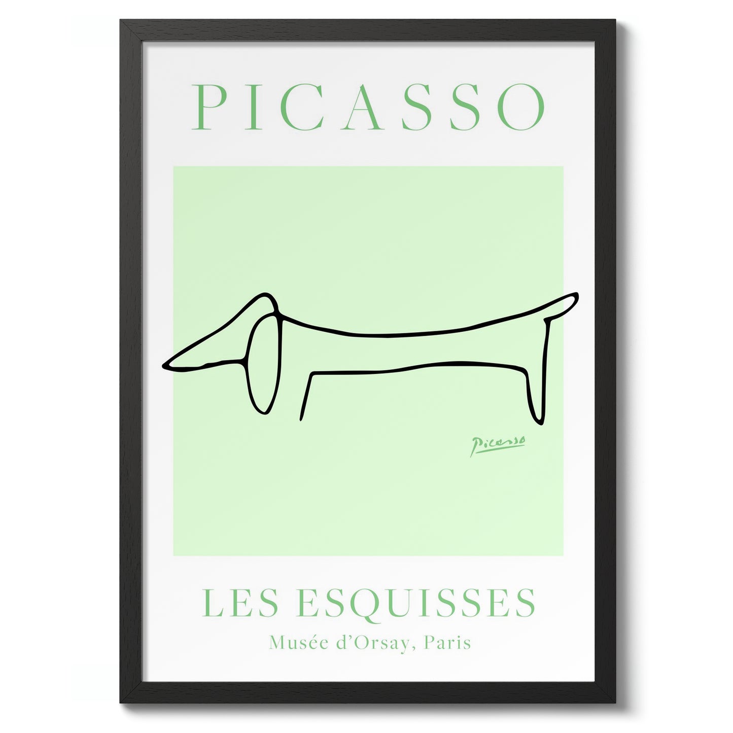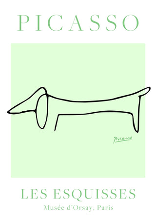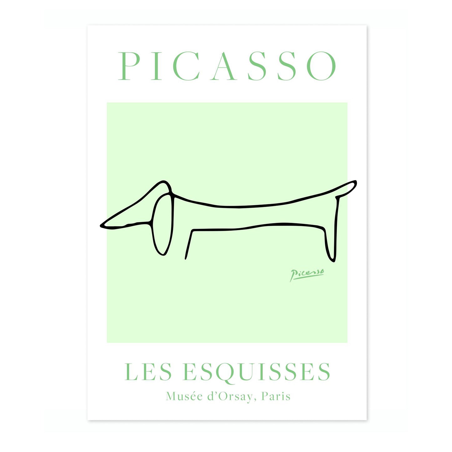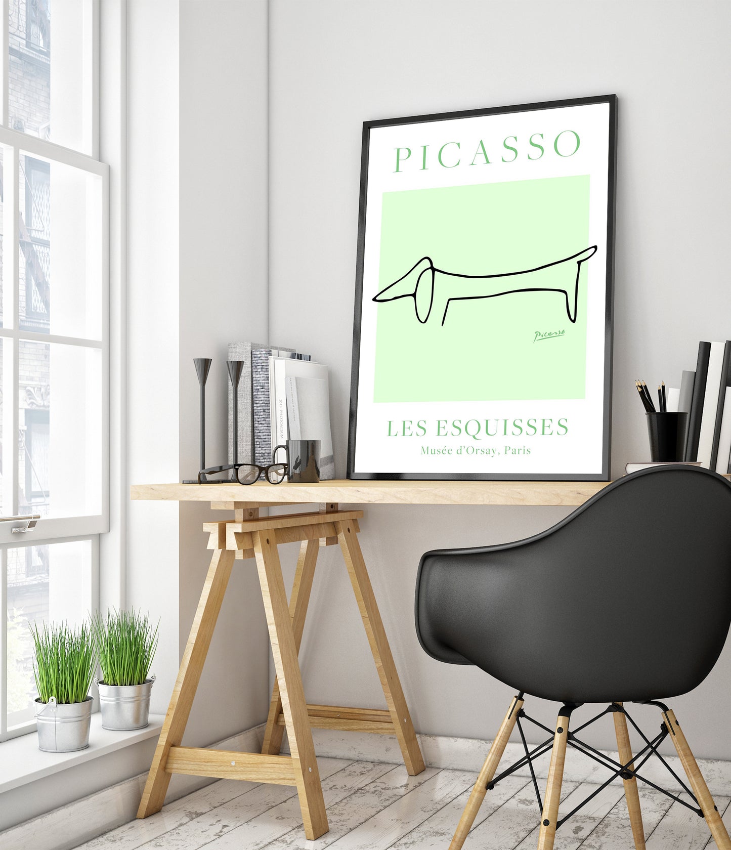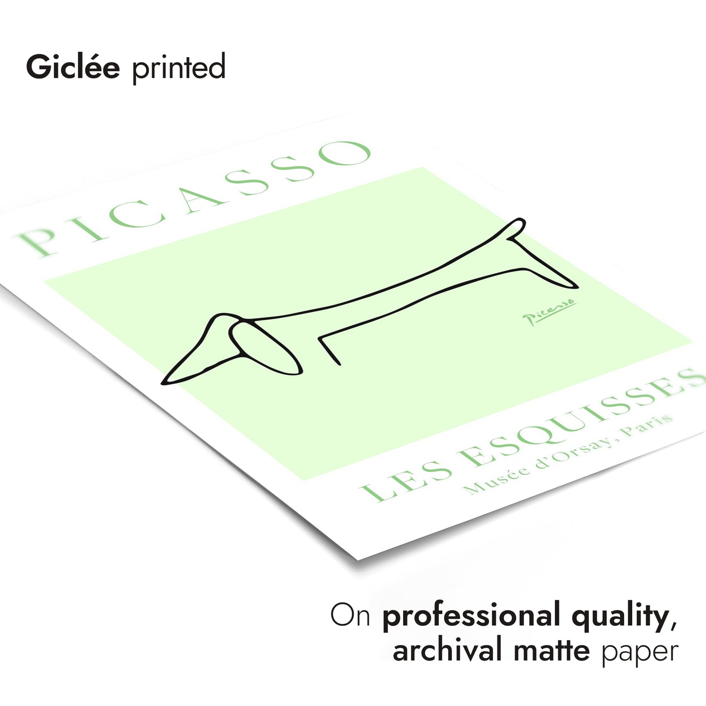 This minimalist Picasso line art dog poster features a simple yet expressive illustration set against a serene green backdrop. The iconic outline captures the essence of the animal with effortless elegance. Perfect for art enthusiasts, this print exudes the sophistication of Picasso’s unconventional style, rendering a sense of movement and character in a stark, uncluttered composition. Ideal for contemporary spaces.