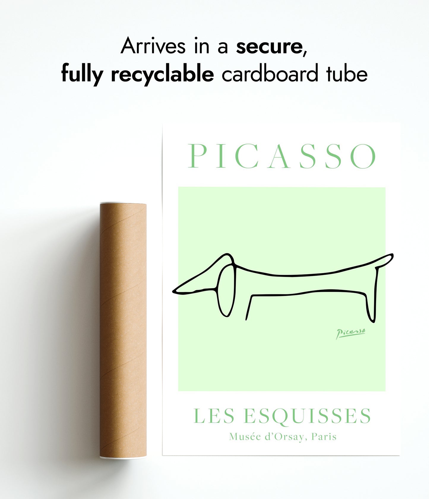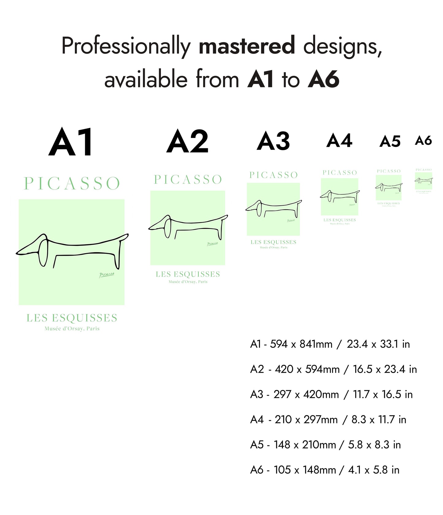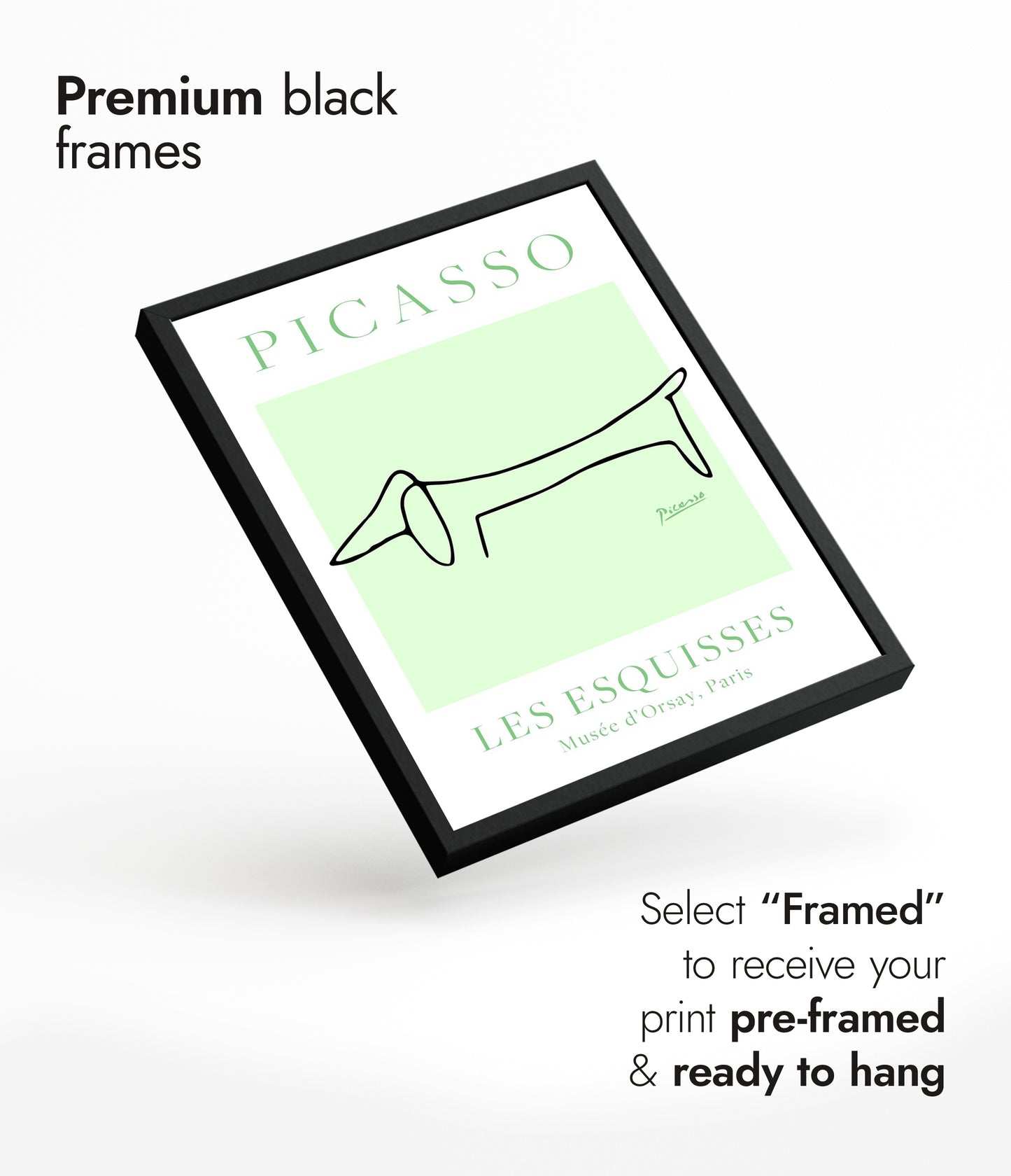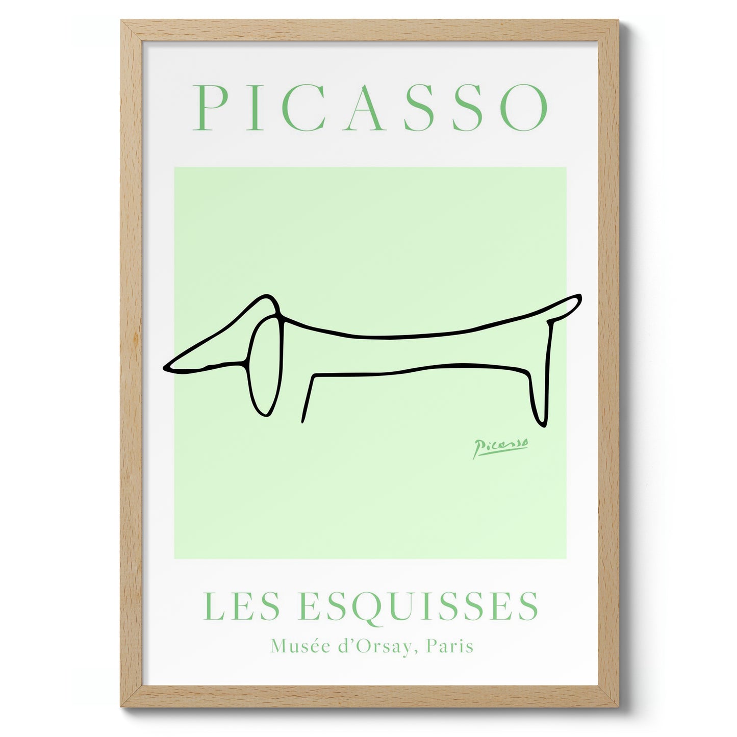This minimalist Picasso line art dog poster features a simple yet expressive illustration set against a serene green backdrop. The iconic outline captures the essence of the animal with effortless elegance. Perfect for art enthusiasts, this print exudes the sophistication of Picasso’s unconventional style, rendering a sense of movement and character in a stark, uncluttered composition. Ideal for contemporary spaces.