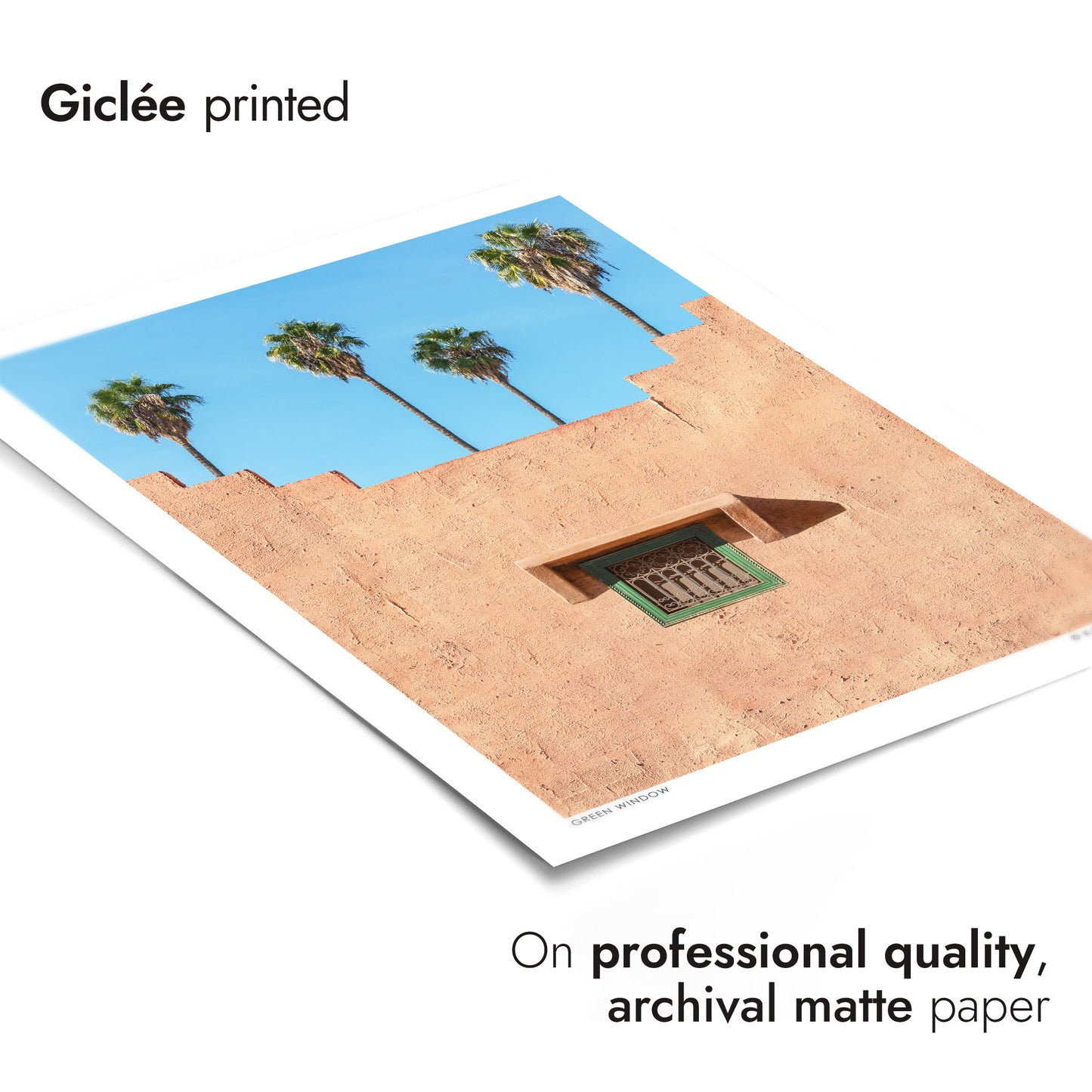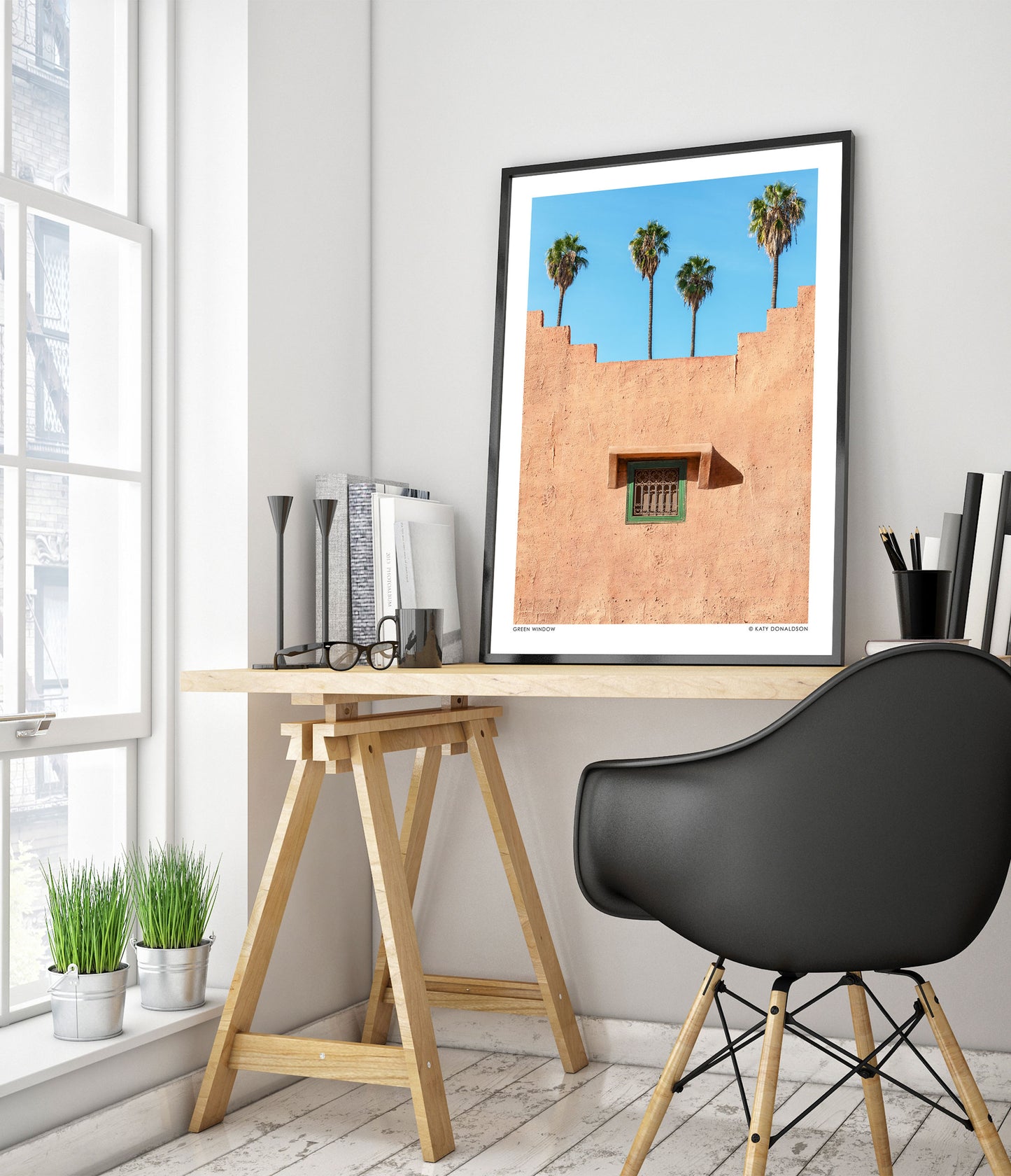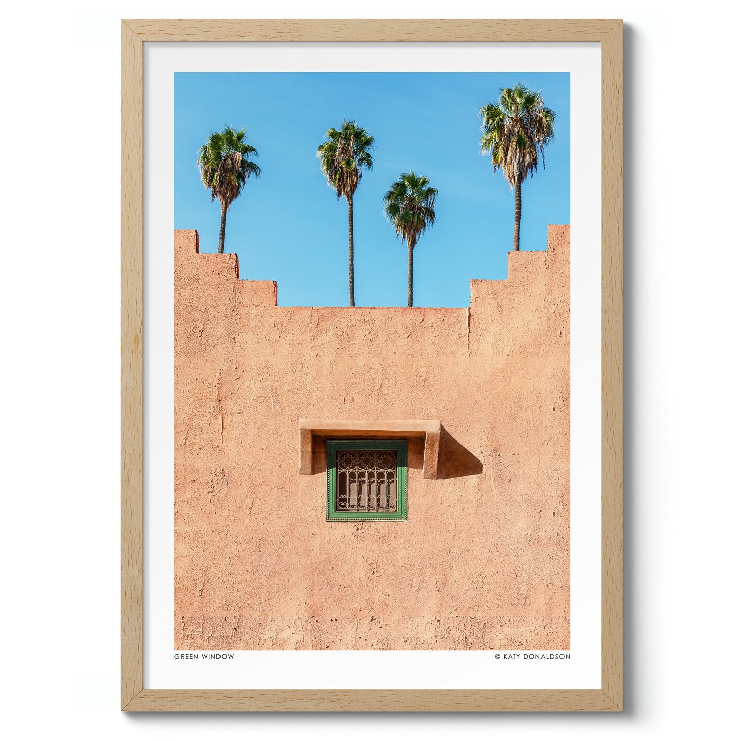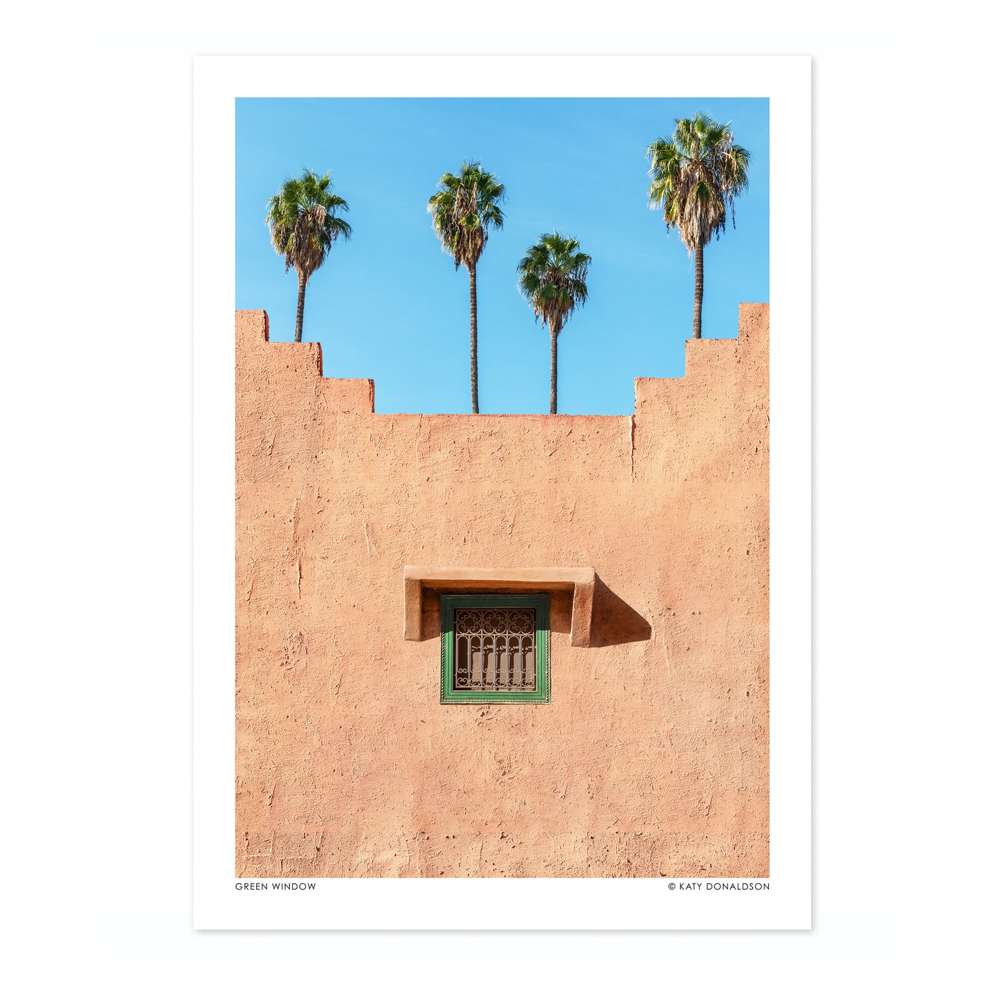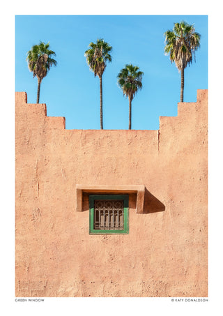 "Green Window" by Katy Donaldson captures the serene beauty of palm trees against an earthy wall with traditional architecture. The central green window provides a striking focal point, contrasting with the soft blue sky and warm tones of the facade. Perfect for those who appreciate architectural photography and tranquil scenes, this poster adds a touch of exotic elegance to any space.