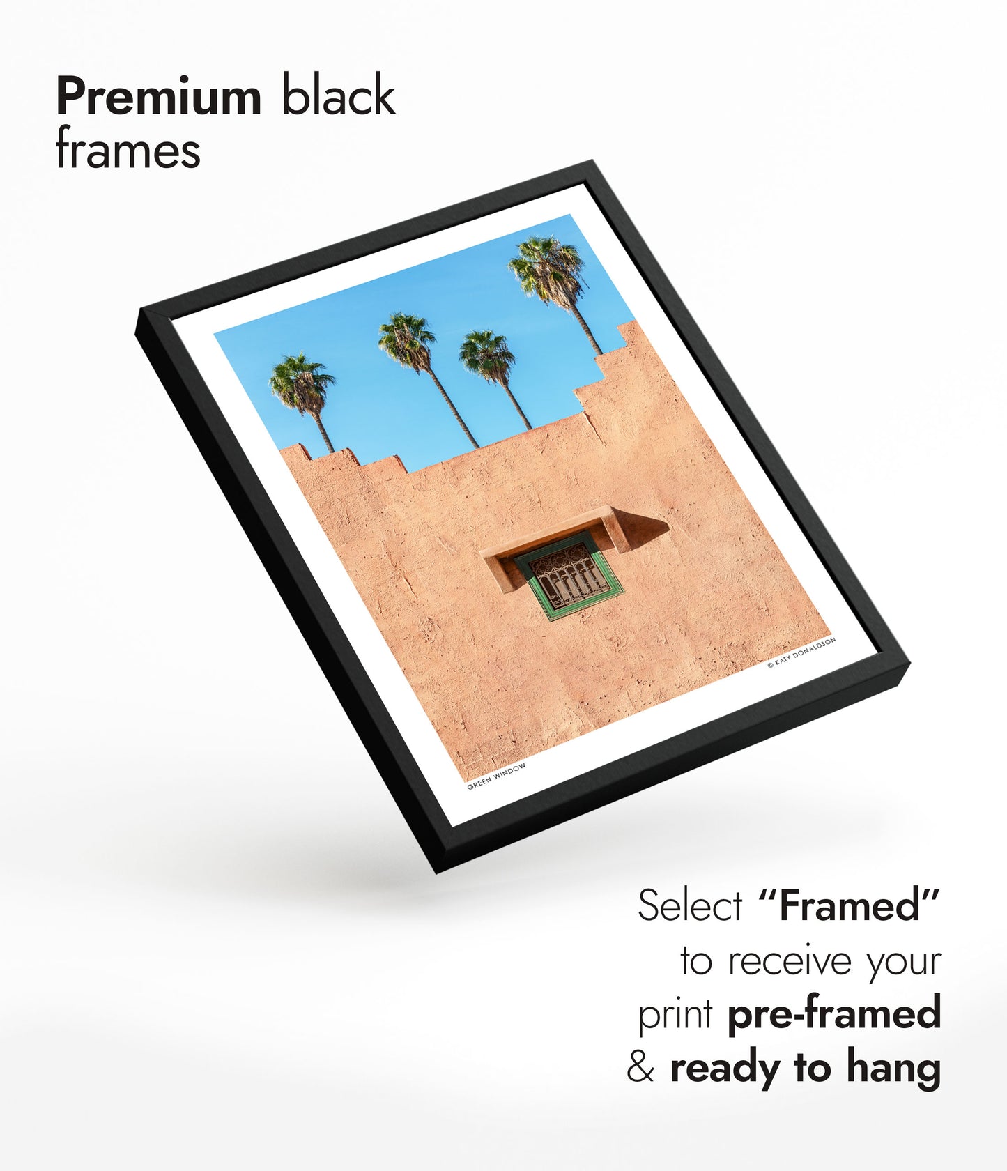 Solid wood frames available in black stained or natural finishes, with UV resistant acrylic glass. Framed orders arrive pre-installed with your choice of print, ready to hang. Available in all print sizes.