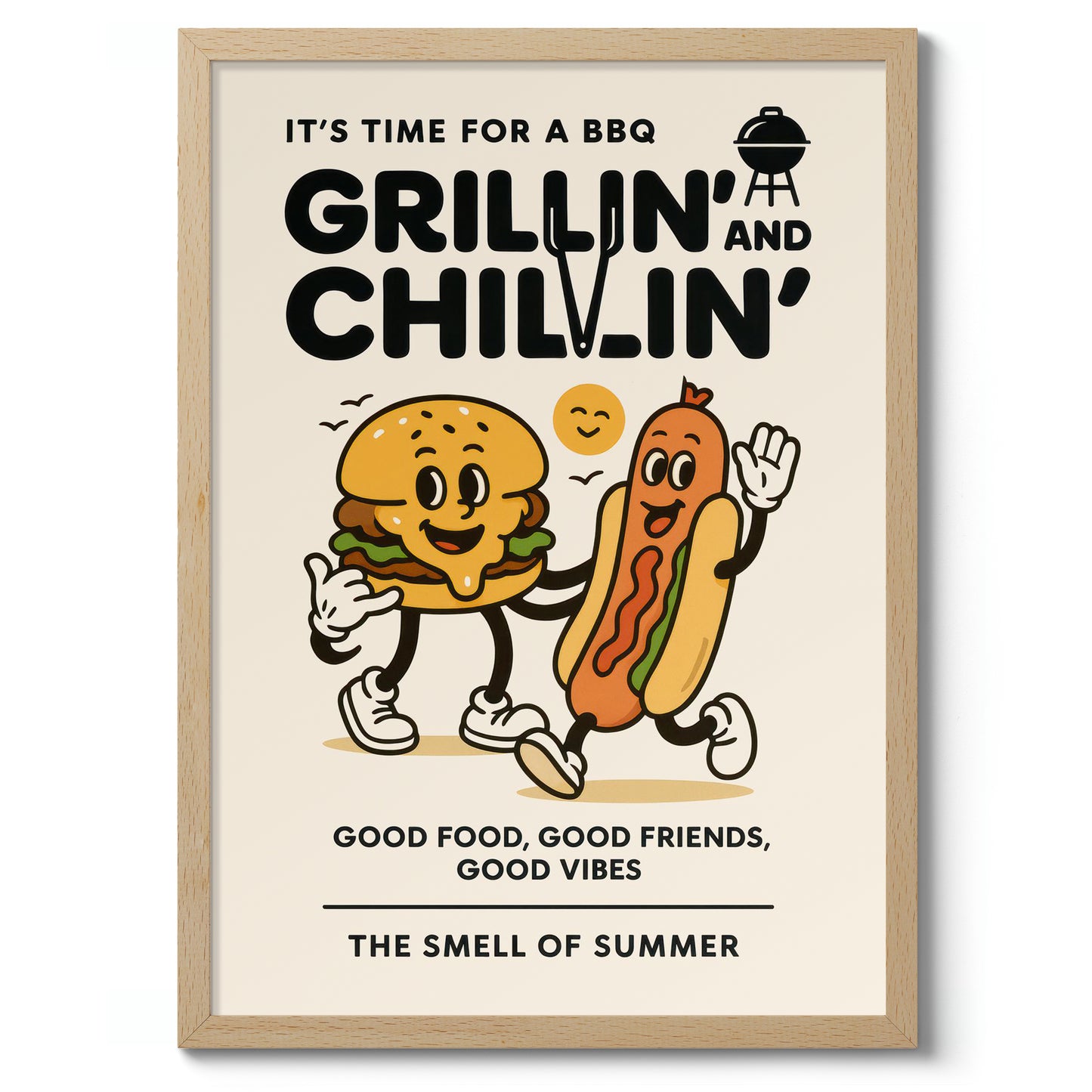 Celebrate summer vibes with the "Grillin' & Chillin'" poster, featuring vintage-inspired typography and playful cartoon mascots of a burger and hot dog. Perfect for BBQ enthusiasts, this illustration captures the essence of good food and great company. Ideal for adding a fun, nostalgic touch to kitchens or outdoor entertaining spaces.