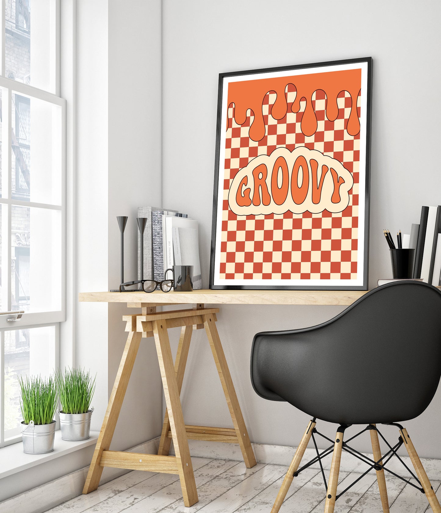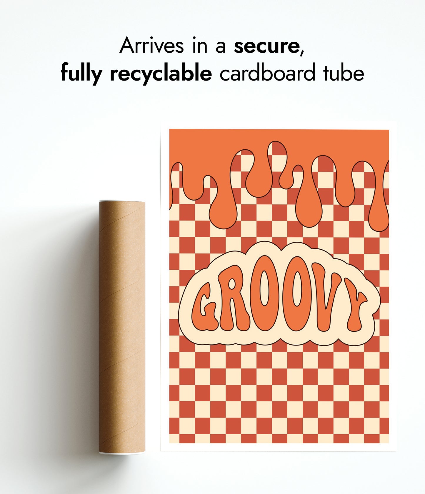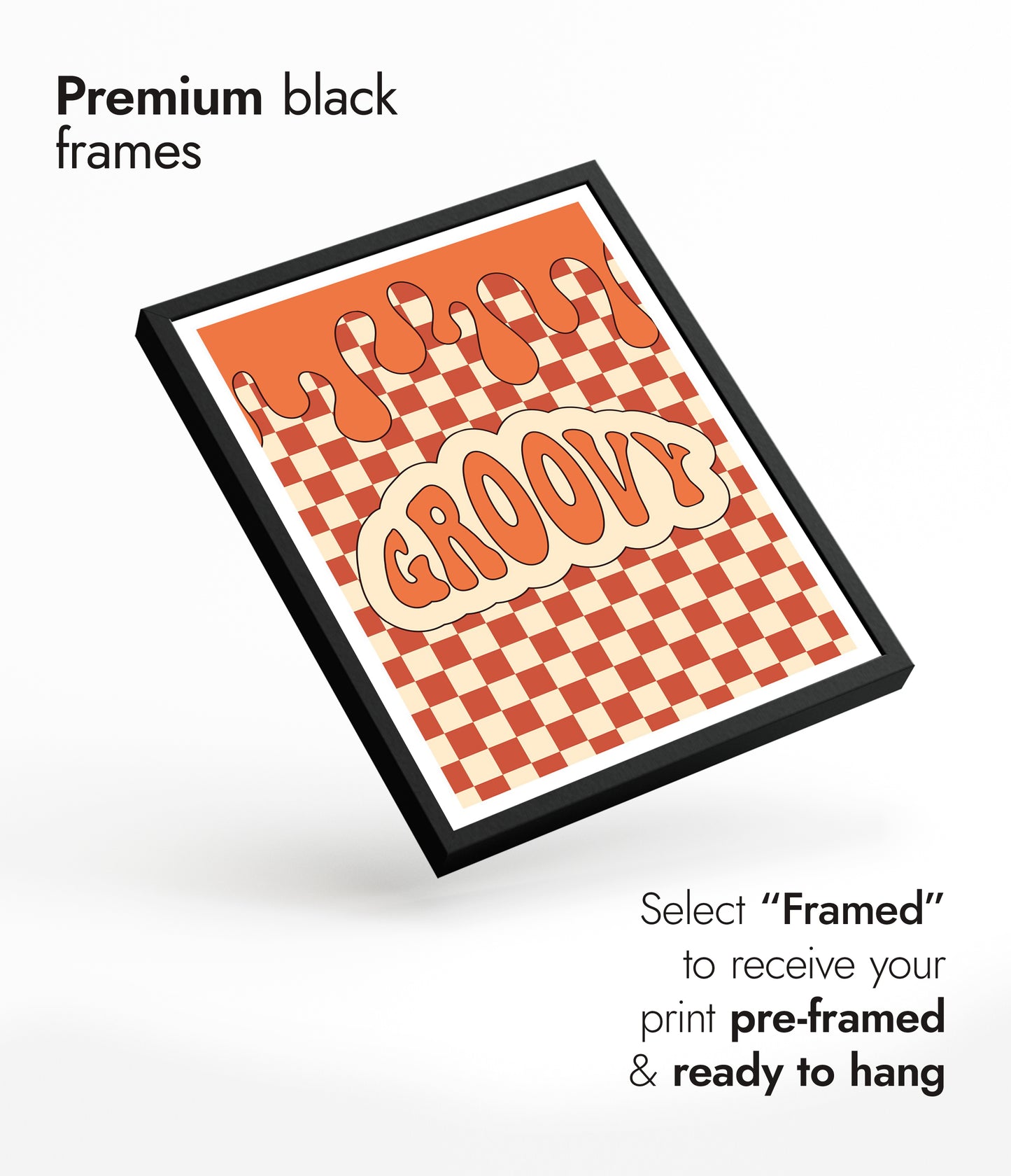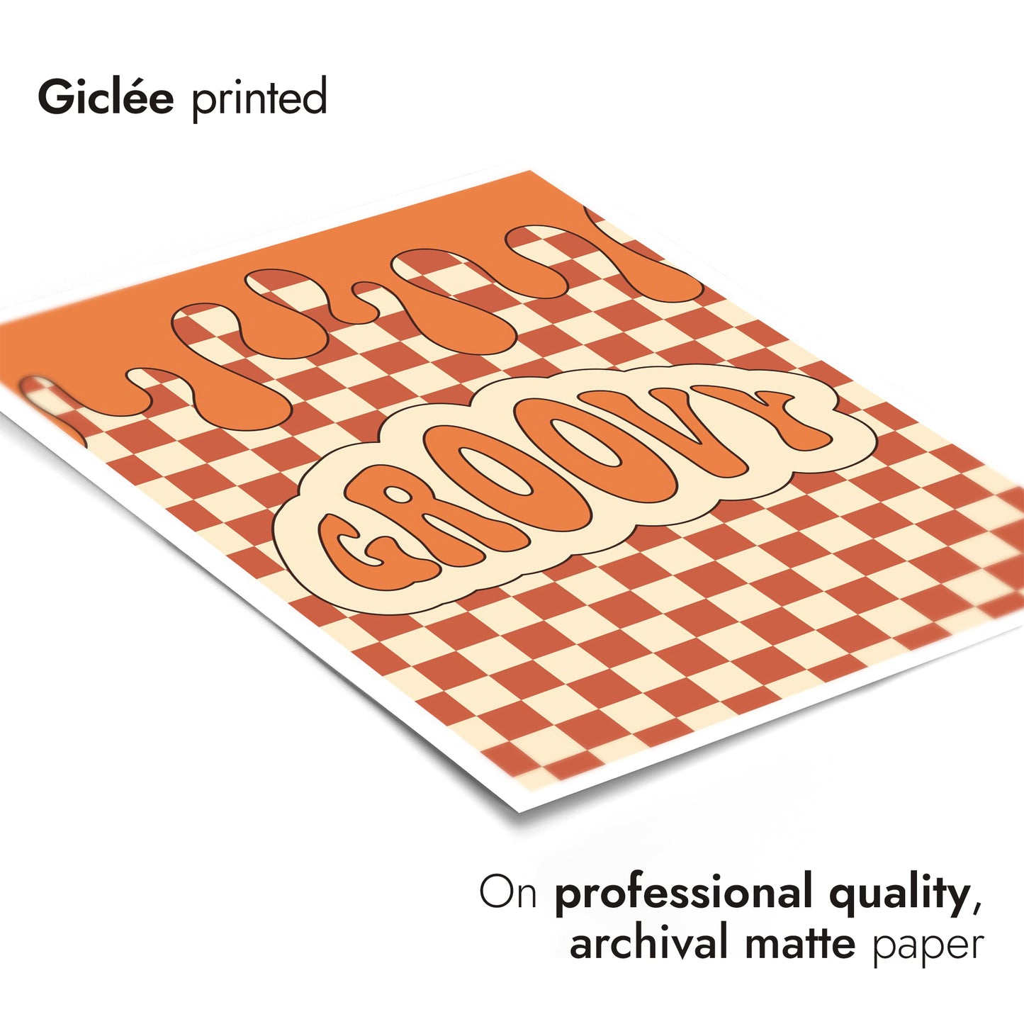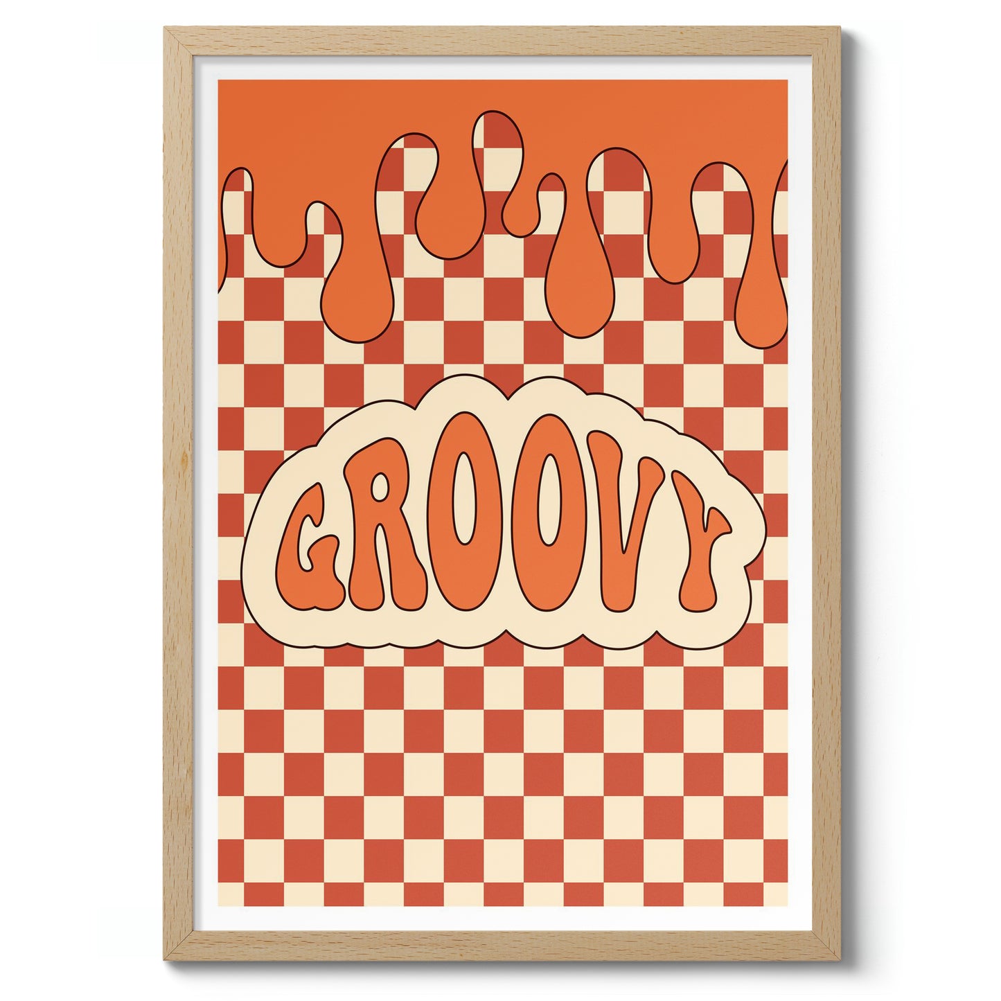 This vibrant "Groovy" typography poster features a bold, retro-inspired design with wavy lettering set against an orange and cream checkerboard background. The melting top border adds a playful, graffiti-like touch, creating a visually dynamic piece ideal for those seeking a graphic illustration with a cartoon theme. Perfect for adding a splash of vintage charm to any space.
