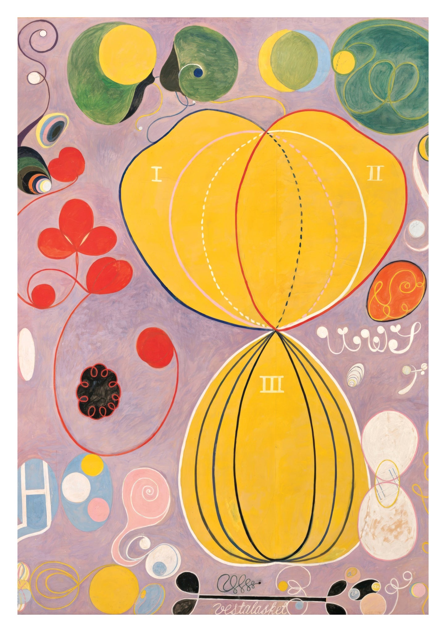 This vibrant Hilma Klint poster, titled "Group IV - The Ten Largest - Adulthood," showcases an abstract arrangement of shapes and floral elements against a pastel background. The mid-century art piece features bold yellow and red forms interwoven with delicate lines and patterns, creating a harmonious blend of geometry and organic motifs. Perfect for adding a touch of sophistication to any space.