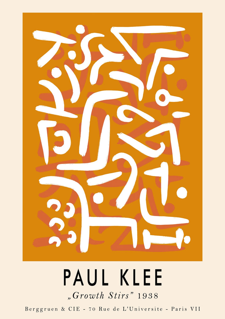 This art print poster, "Growth Stirs" by Paul Klee, features an evocative blend of abstract shapes and intricate line work set against a vibrant orange backdrop. The delicate interplay of beige and white lines creates a harmonious yet dynamic composition, typical of Klee's abstract style. Ideal for those seeking mid-century and abstract inspiration in line art posters.