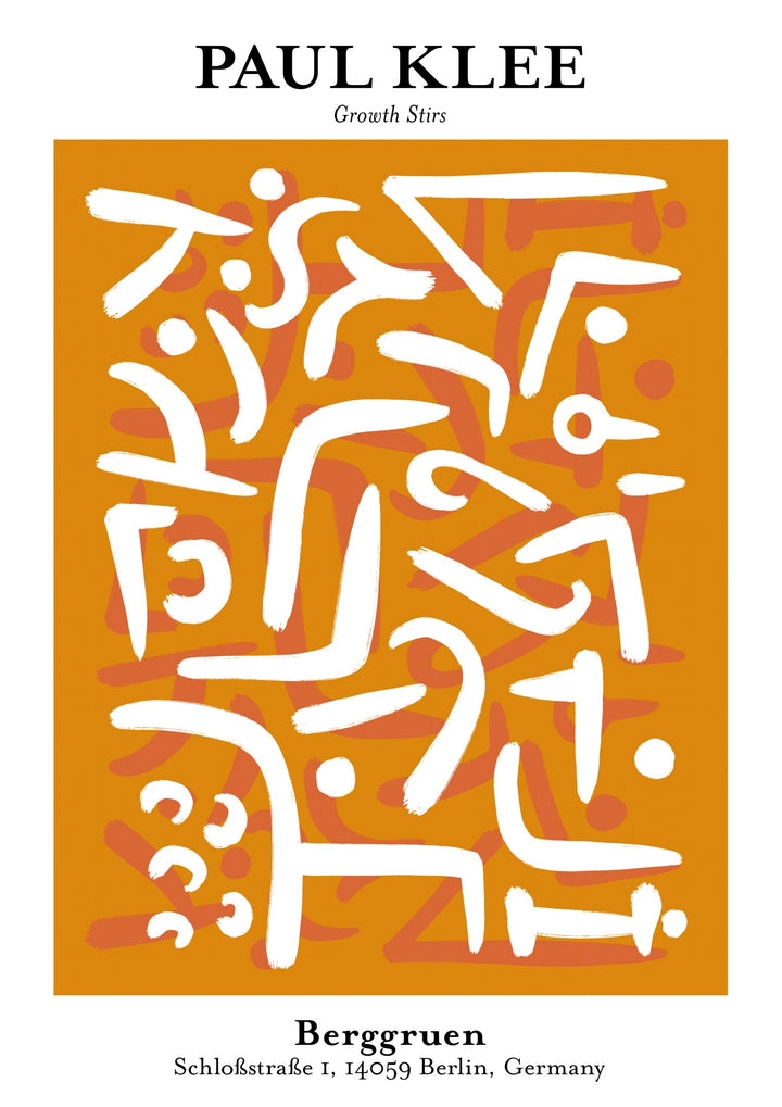 This "Growth Stirs" poster by Paul Klee, part of Mid-Century Art, showcases an abstract composition of white line art forms against a warm orange background. The fluid shapes and lines create a sense of movement, embodying Klee's unique artistic style. Perfect for adding a touch of abstract elegance to any space, this exhibition poster highlights Klee's innovative design.