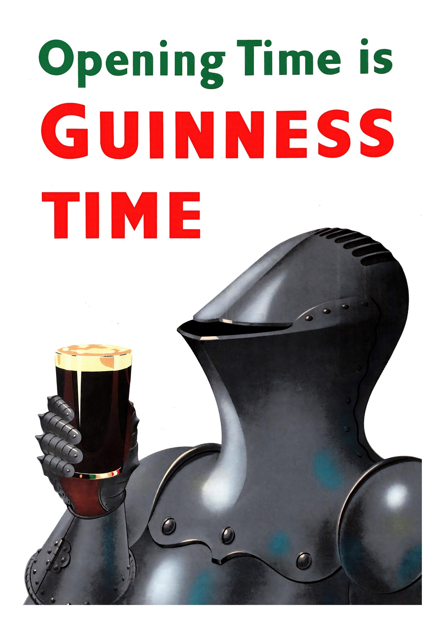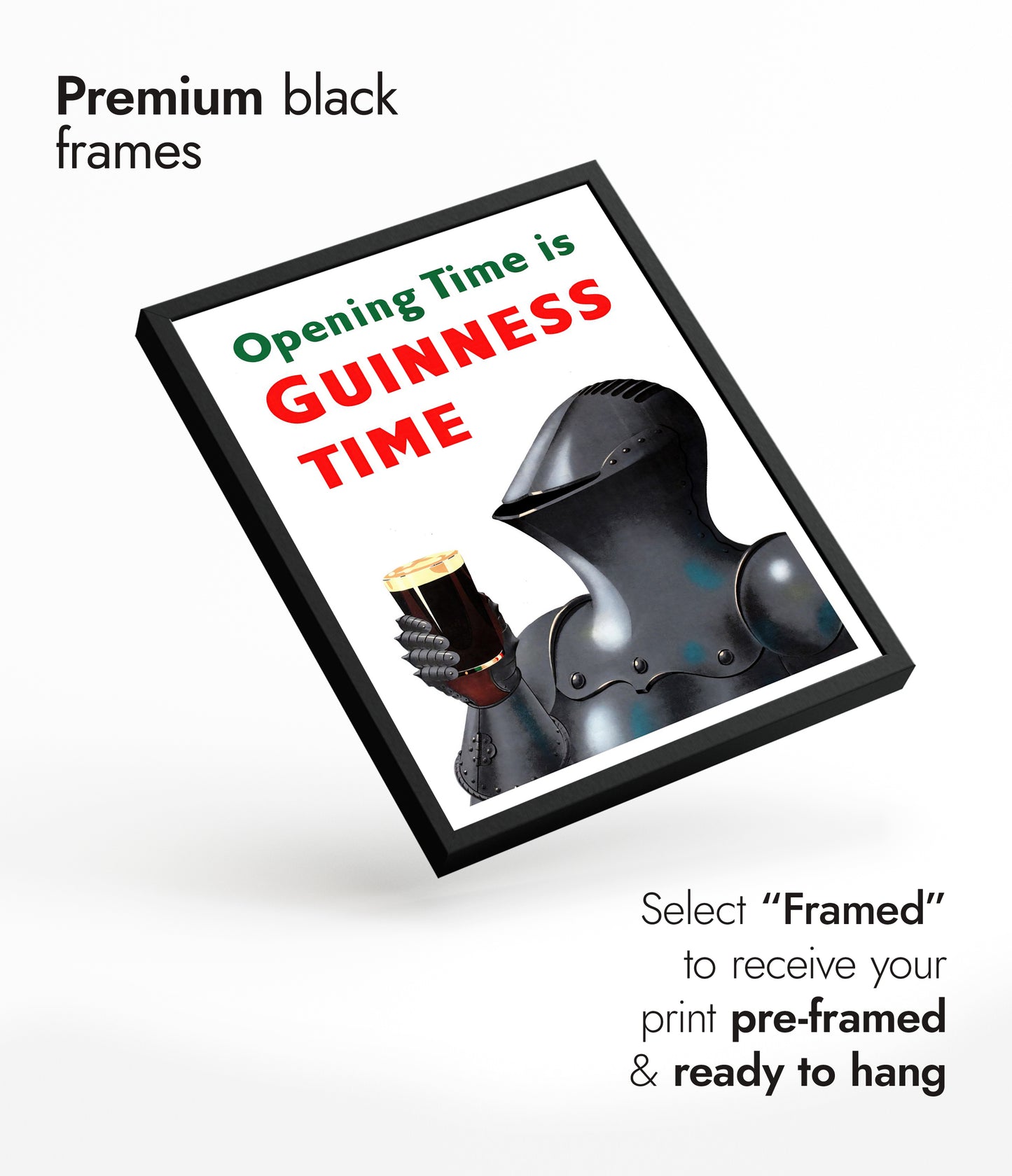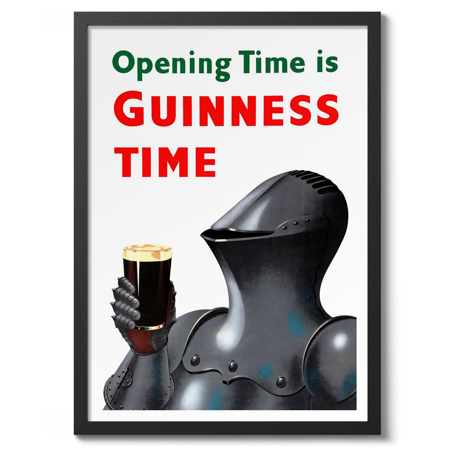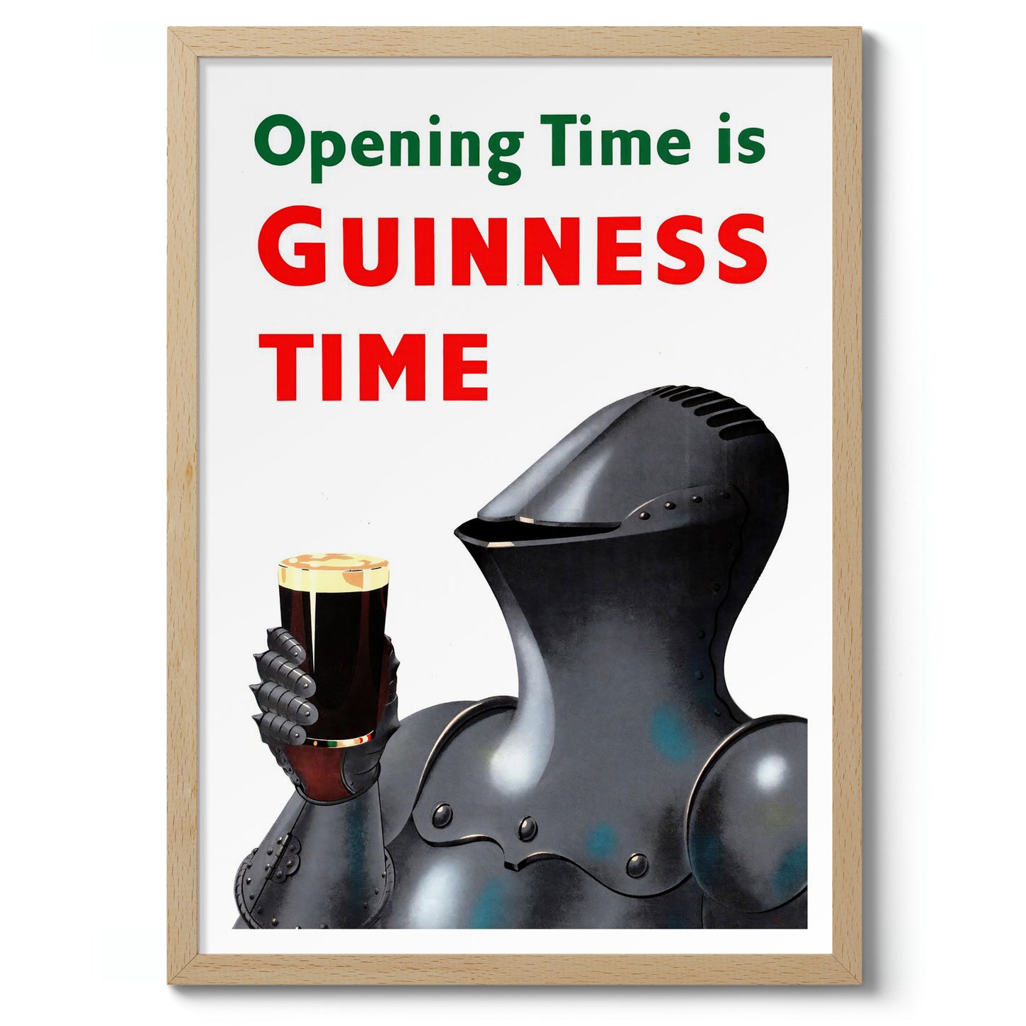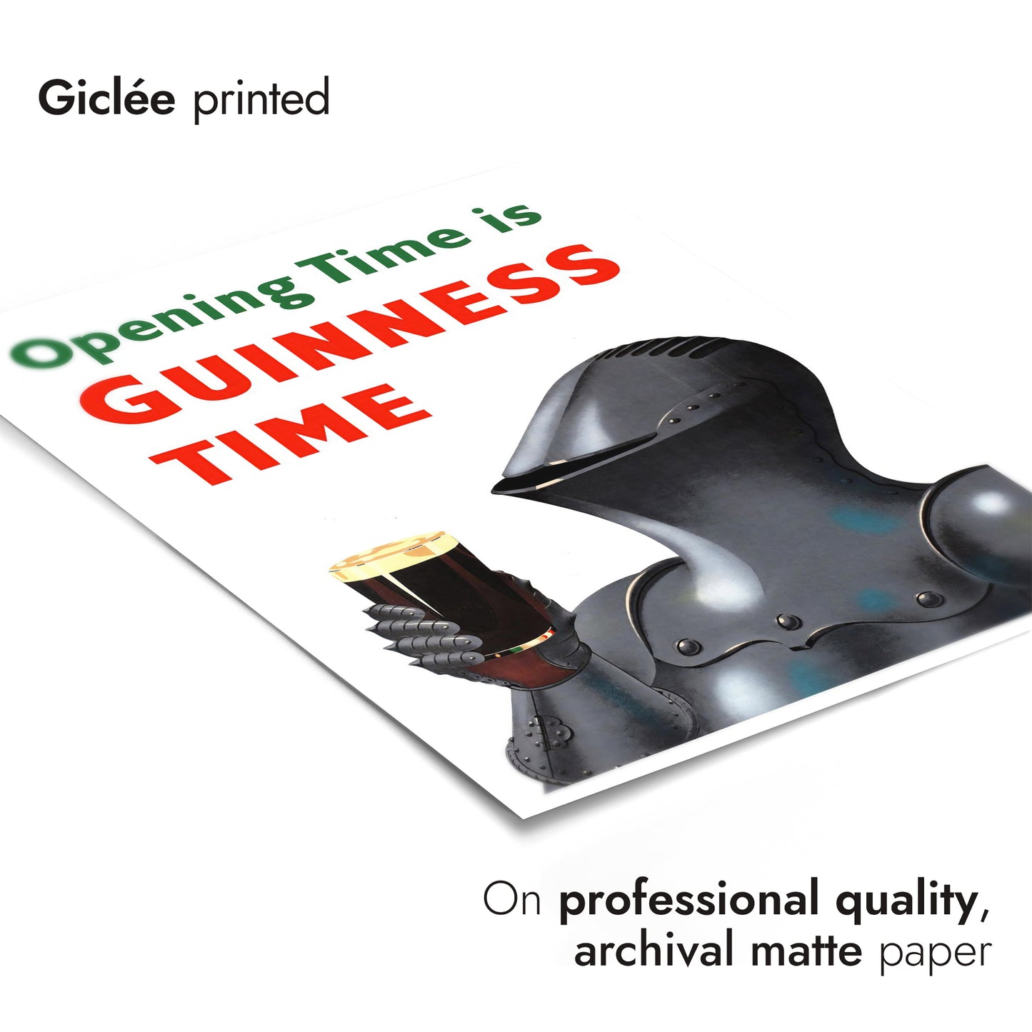 This vintage Guinness poster artfully features a knight clad in shining armor, raising a pint of the iconic stout. With bold red and green typography proclaiming "Opening Time is Guinness Time," it perfectly captures the essence of classic advertising charm and nostalgic appeal. The illustration's realism and clever theme make it a striking choice for decor with a historical flair.