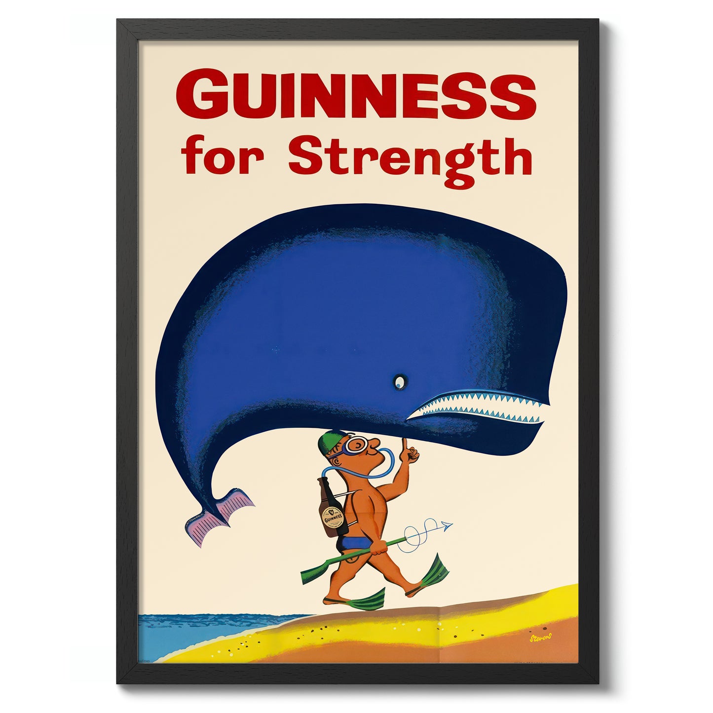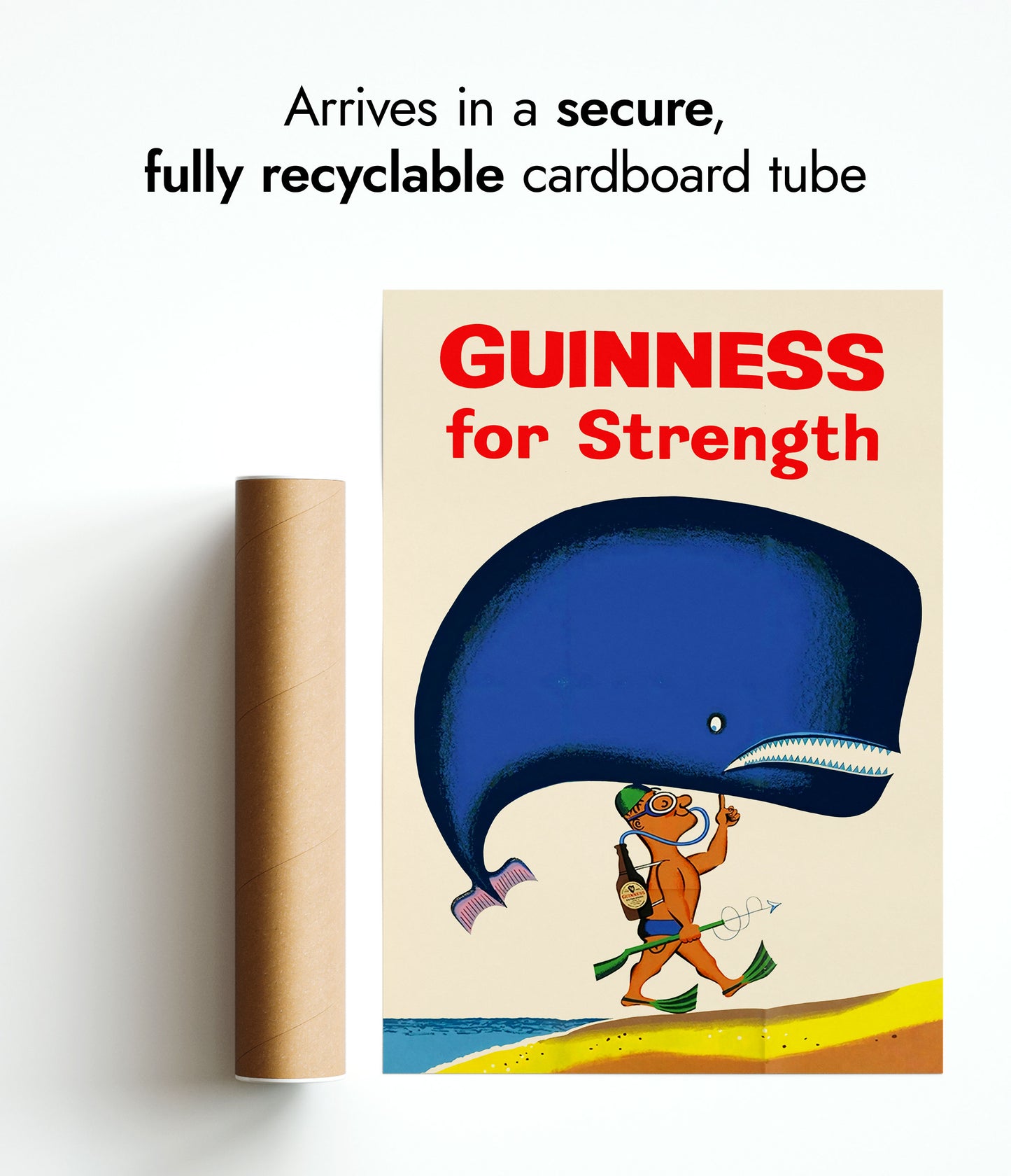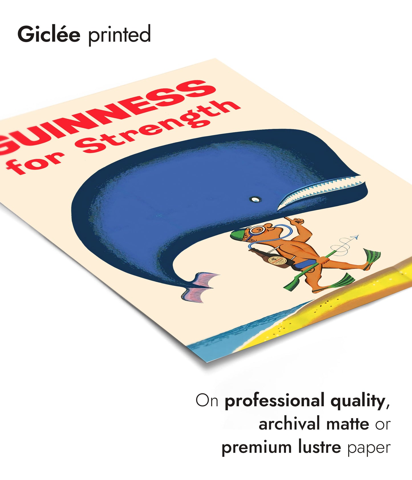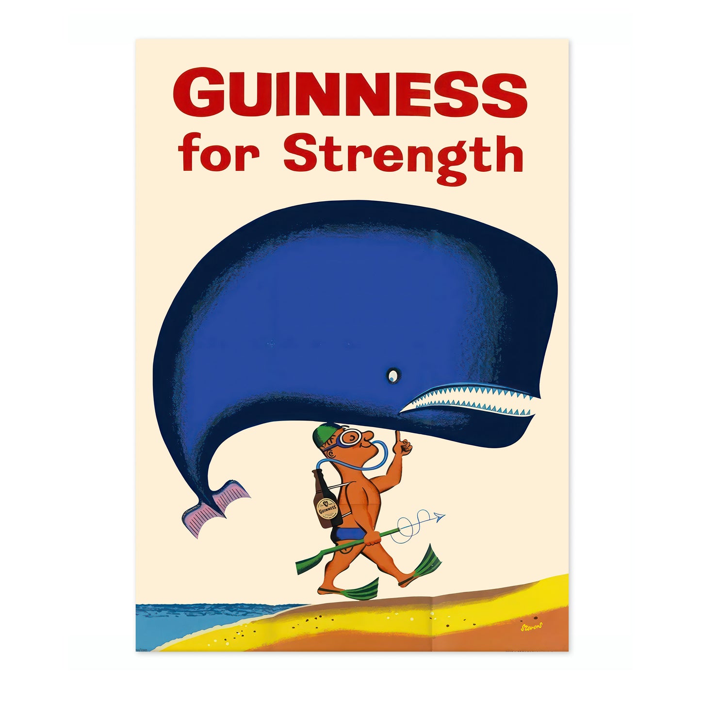 This classic Guinness poster features a humorous illustration of a diver effortlessly carrying a massive whale on a beach, emphasizing the slogan "Guinness for Strength." The vintage-style artwork blends vibrant colours with a playful scene, capturing the essence of mid-20th-century beer advertising. Ideal for adding a quirky touch to any space, especially for enthusiasts of vintage alcohol-themed posters.