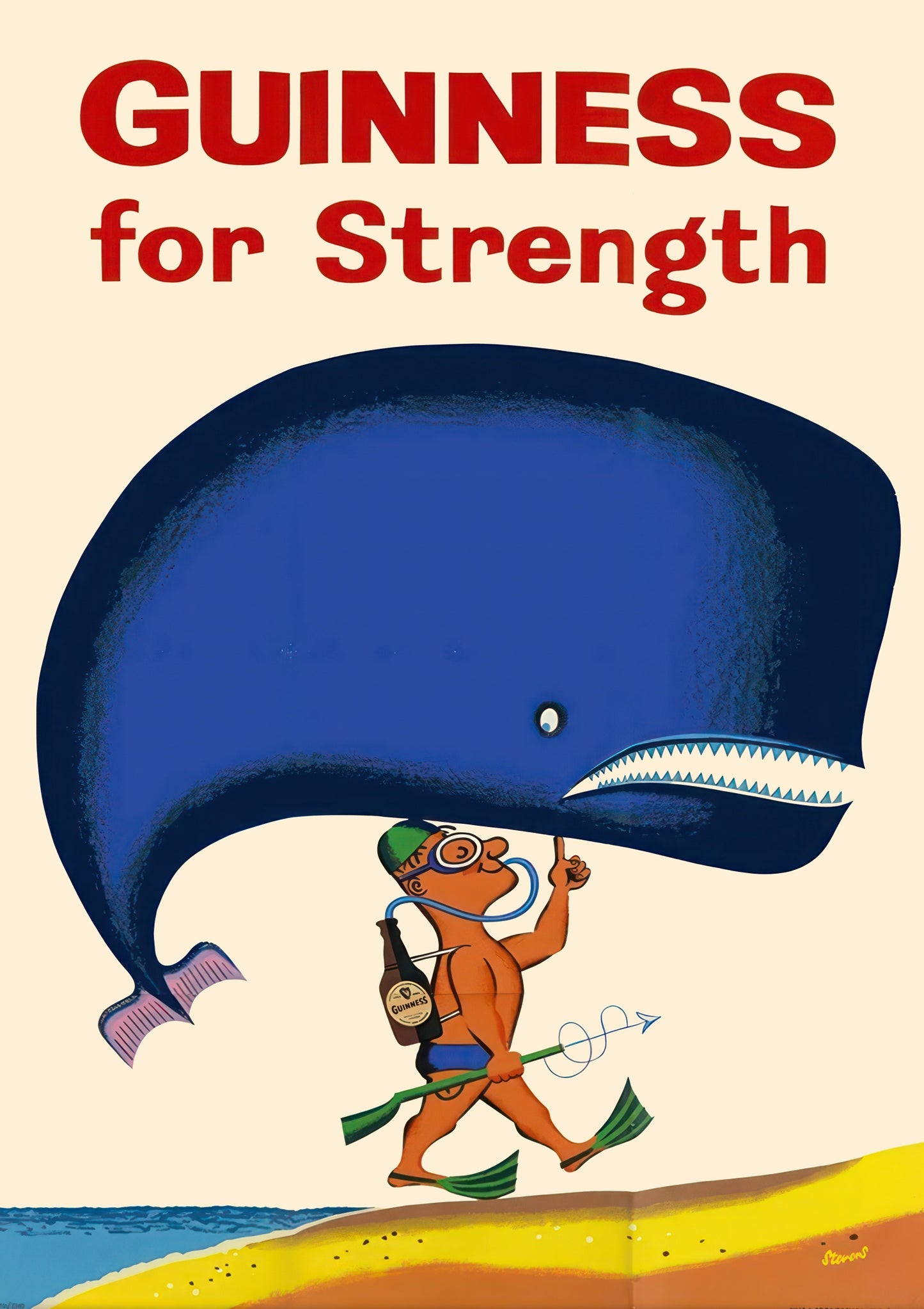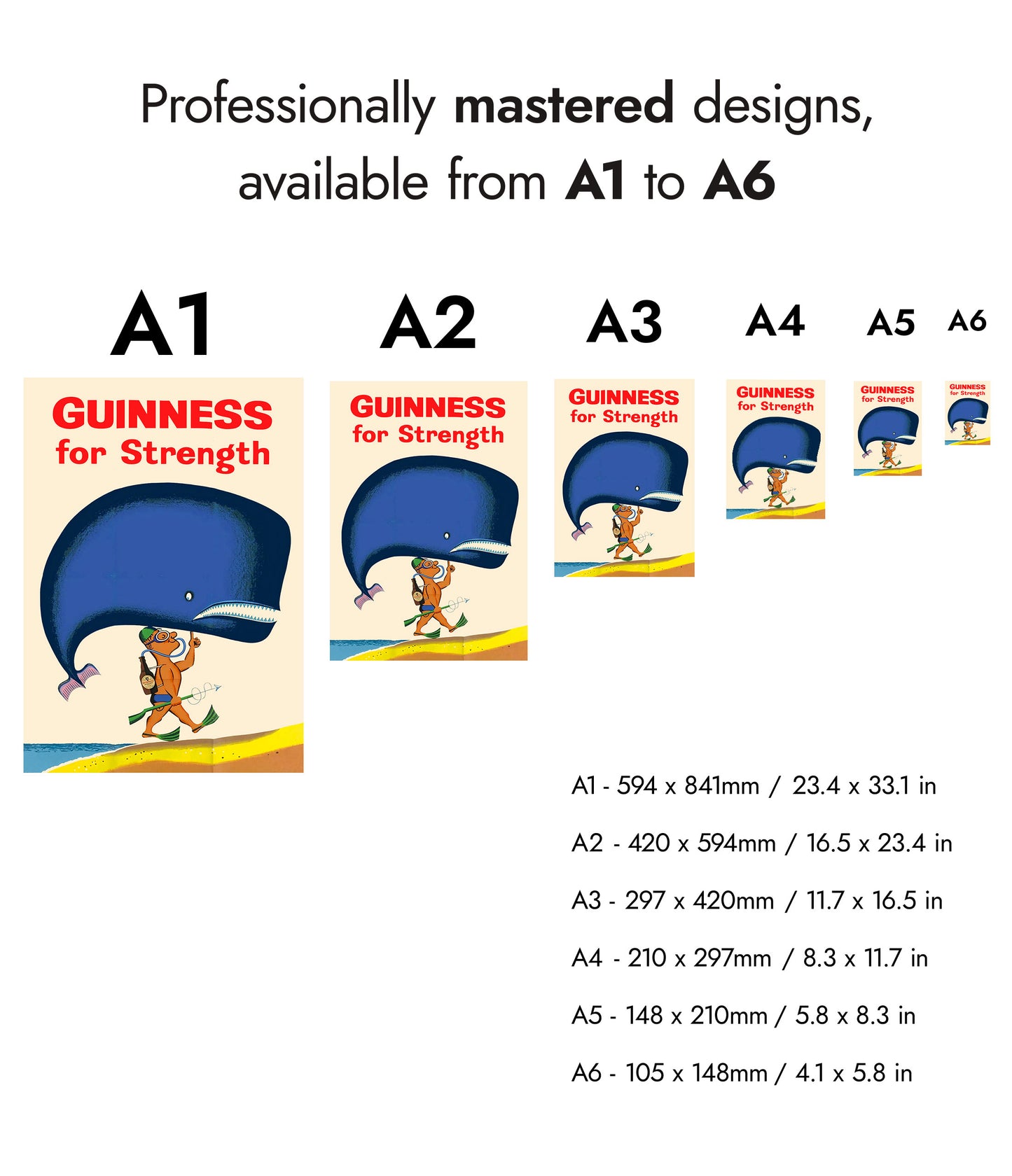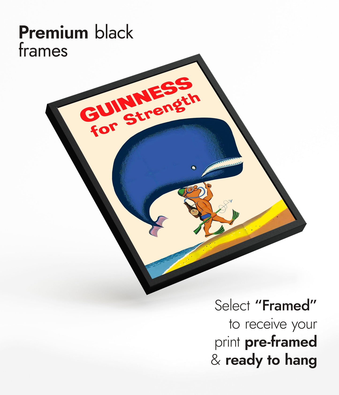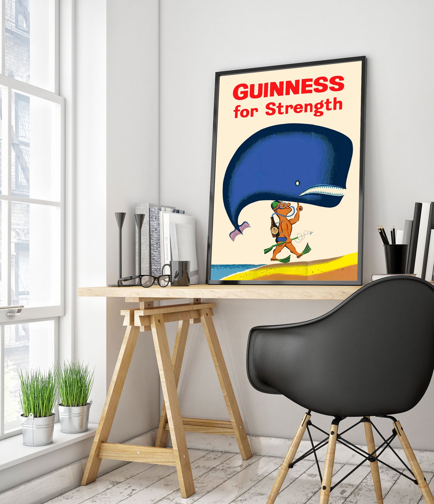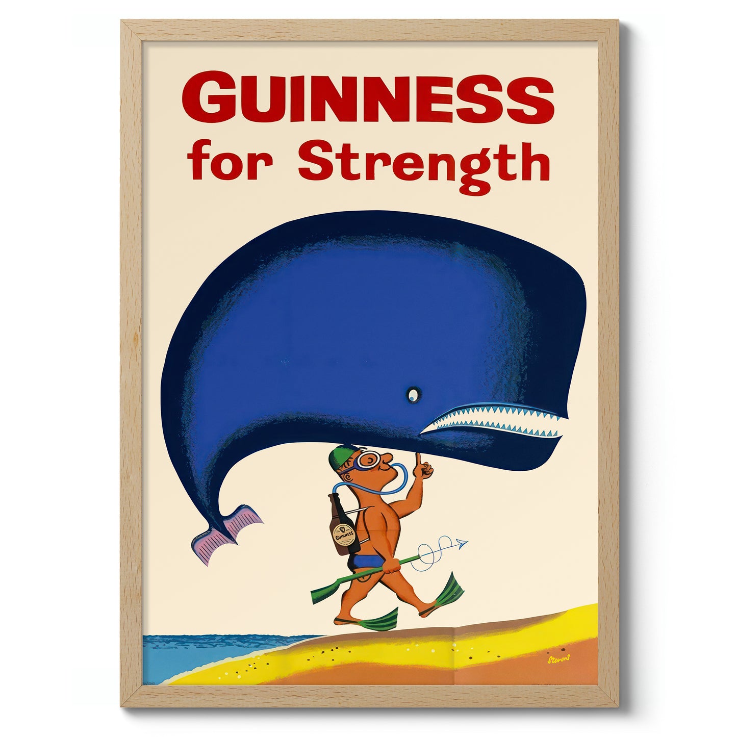 This classic Guinness poster features a humorous illustration of a diver effortlessly carrying a massive whale on a beach, emphasizing the slogan "Guinness for Strength." The vintage-style artwork blends vibrant colours with a playful scene, capturing the essence of mid-20th-century beer advertising. Ideal for adding a quirky touch to any space, especially for enthusiasts of vintage alcohol-themed posters.