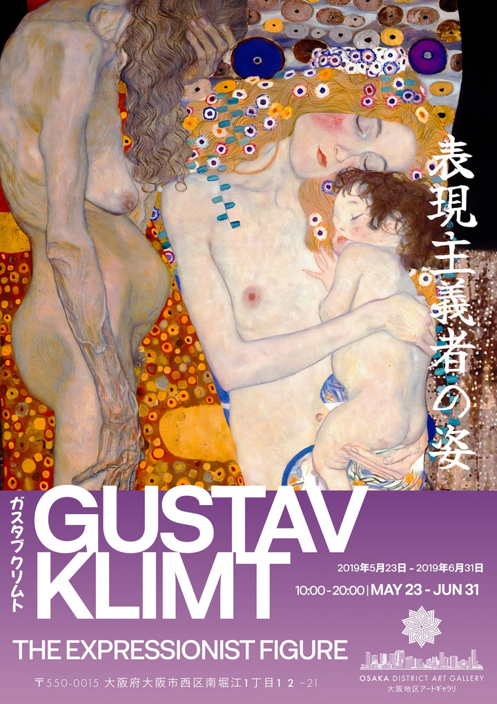 This Gustav Klimt exhibition poster features an expressive portrait highlighting Klimt’s distinct style within Expressionism and Symbolism. Showcasing his renowned themes of women, nudes, and life cycles, it captures the essence of the celebrated artist. Accents of Japanese text and a vibrant colour palette contribute to the artwork's dynamic presence. Ideal for art enthusiasts and Klimt admirers.