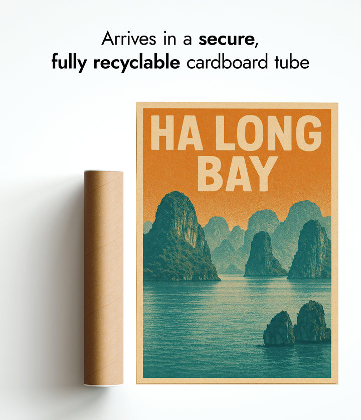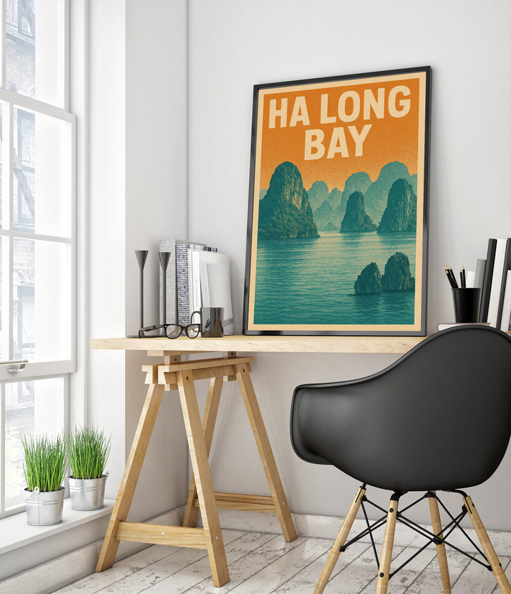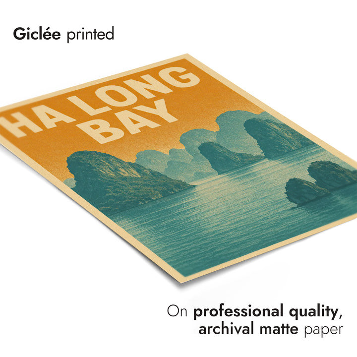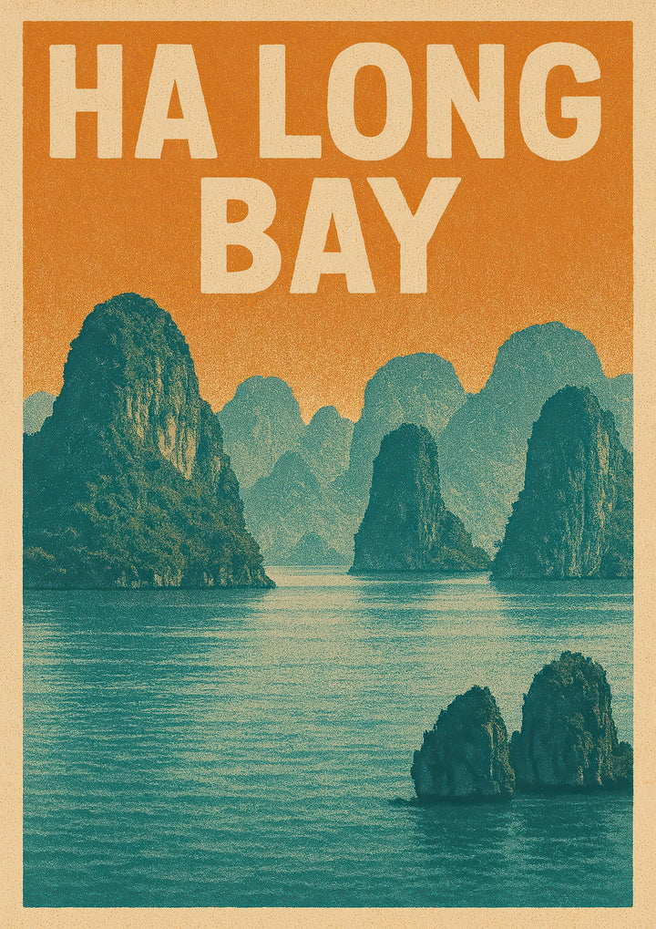 This vintage-style poster showcases the tranquil beauty of Ha Long Bay, Vietnam. Featuring rugged limestone cliffs rising majestically from serene waters under a warm, retro color palette, it captures the essence of this UNESCO World Heritage site's breathtaking seascape. Ideal for travel enthusiasts, this graphic depiction brings a touch of adventure and nostalgia to any space.