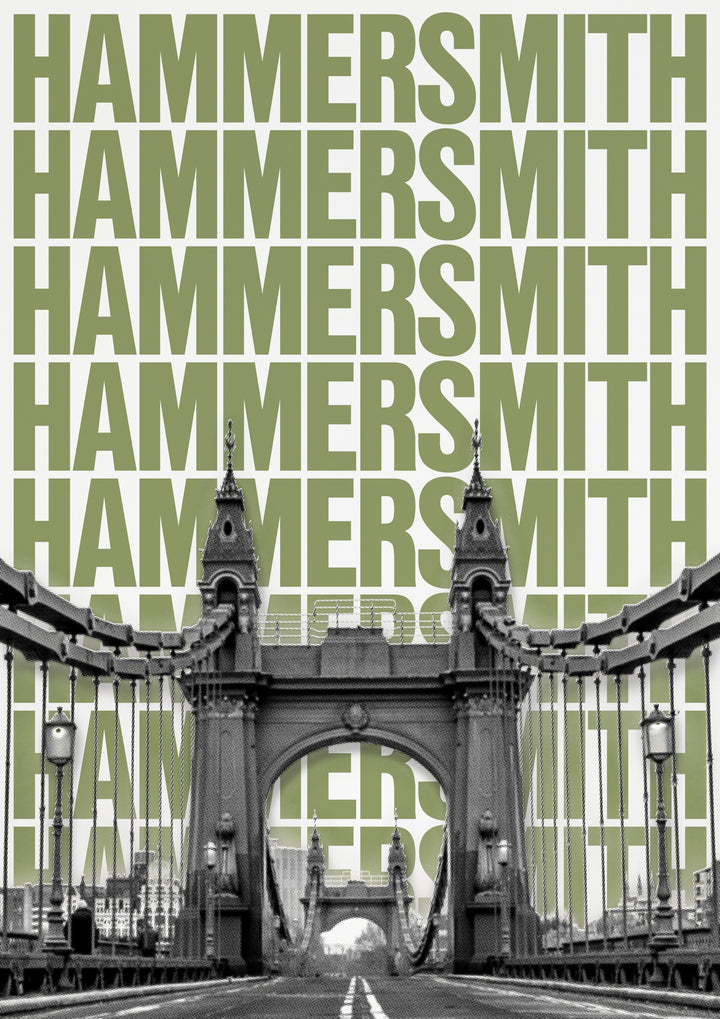 This modern graphic poster captures the iconic Hammersmith Bridge in London. The stylish design features repeated typography of "Hammersmith," creating a bold backdrop to the black and white architectural image. Perfect for lovers of urban landscapes, this striking art print blends contemporary design with historic architecture, making it an eye-catching addition to any space.
