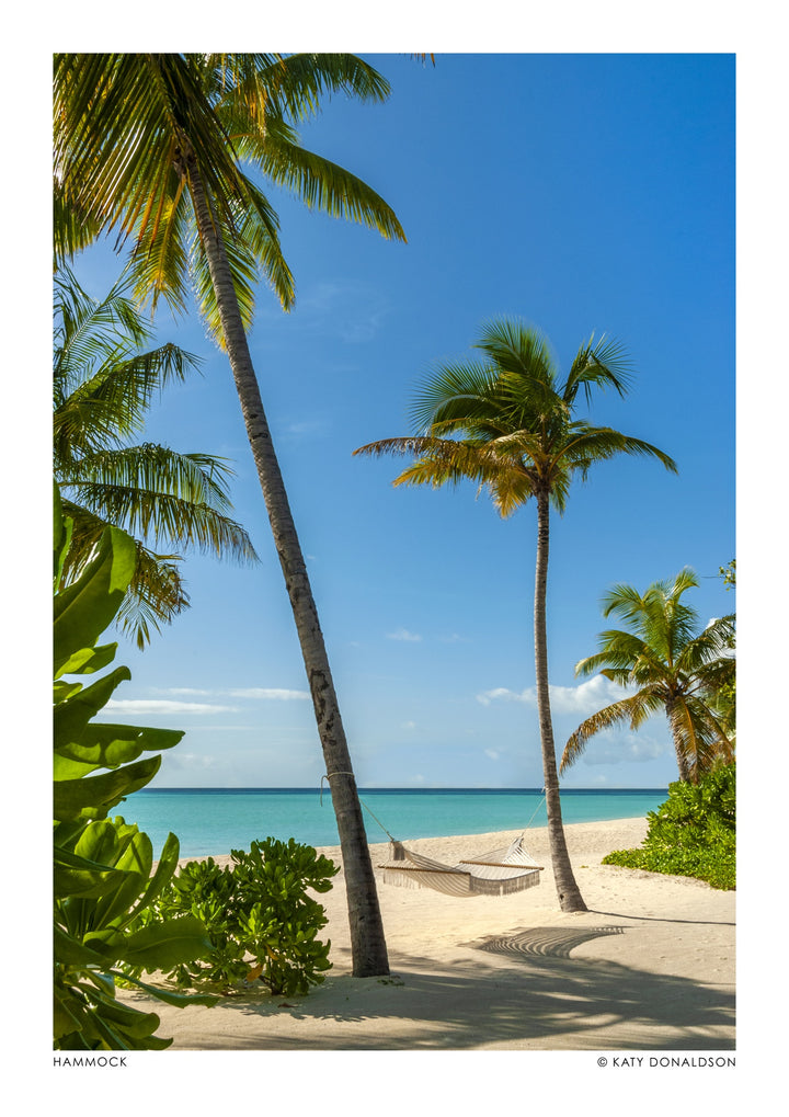 Experience serene beachside relaxation with the "Hammock" poster by Katy Donaldson. This modern photographic print captures the tranquil beauty of a tropical island, featuring lush palm trees, a cozy hammock, and a pristine sandy beach beneath a radiant blue sky. Ideal for adding a touch of coastal charm to any space. Perfect for bringing the ocean breeze into your home decor.