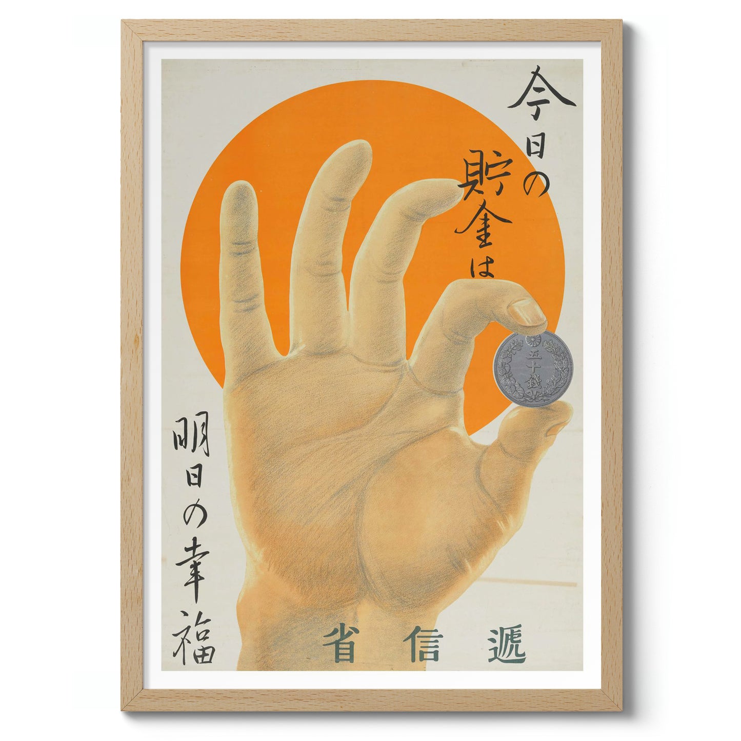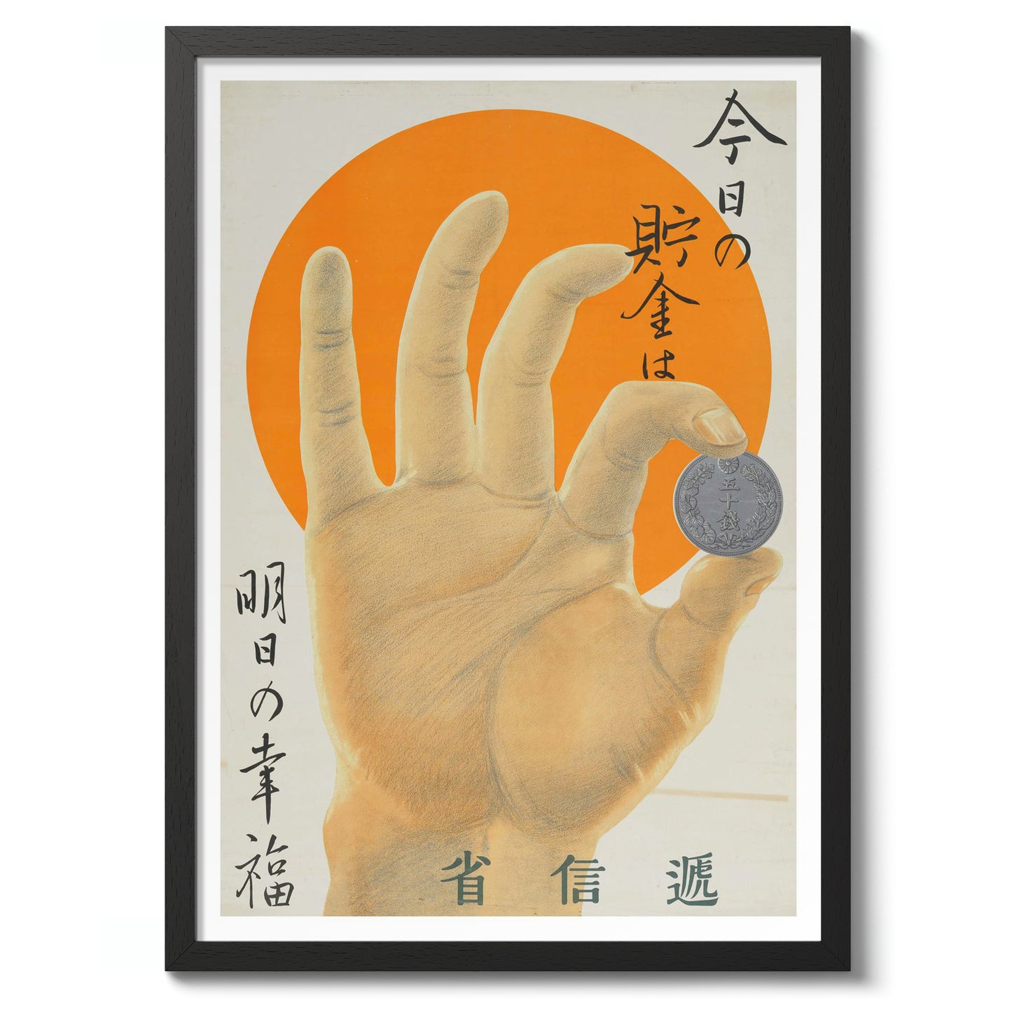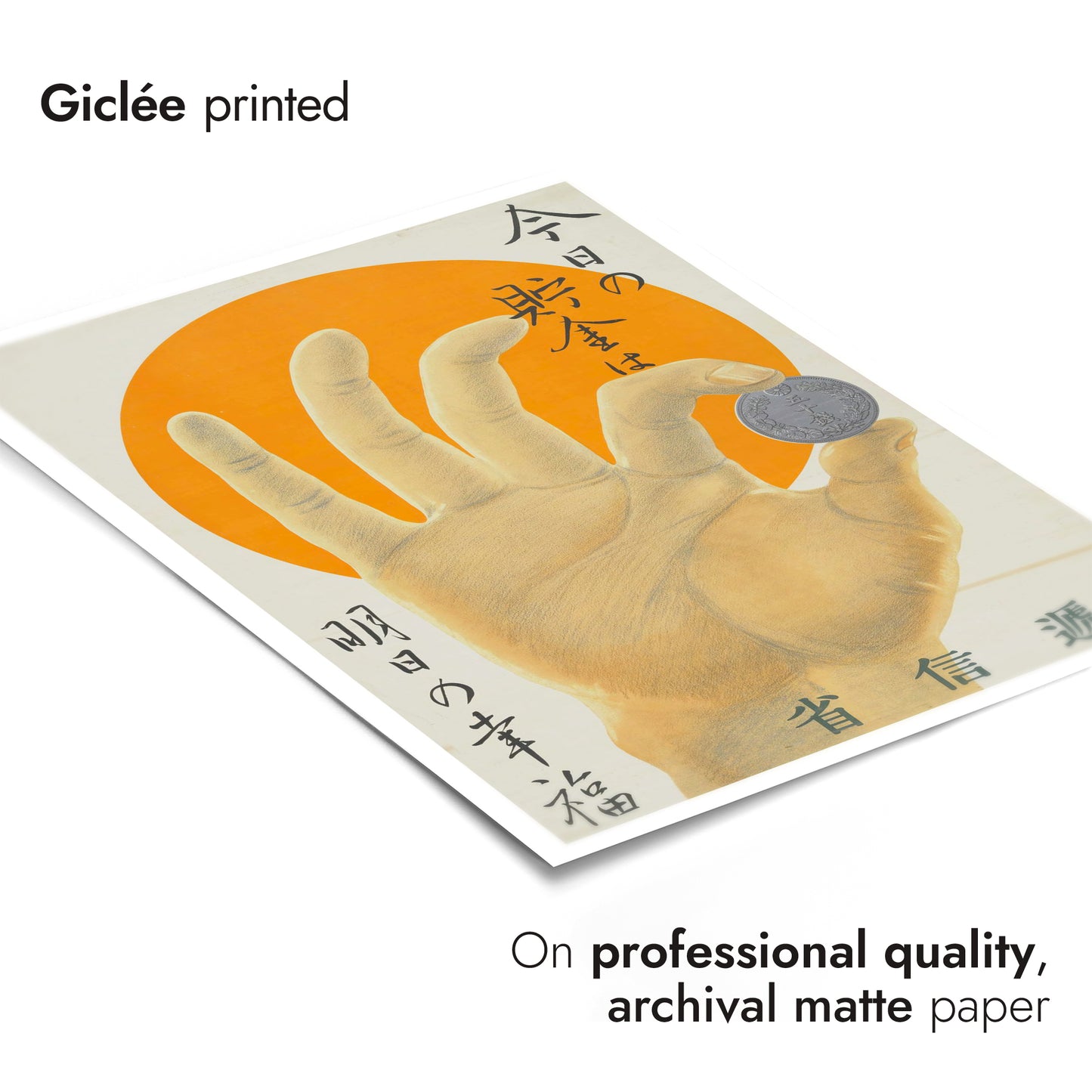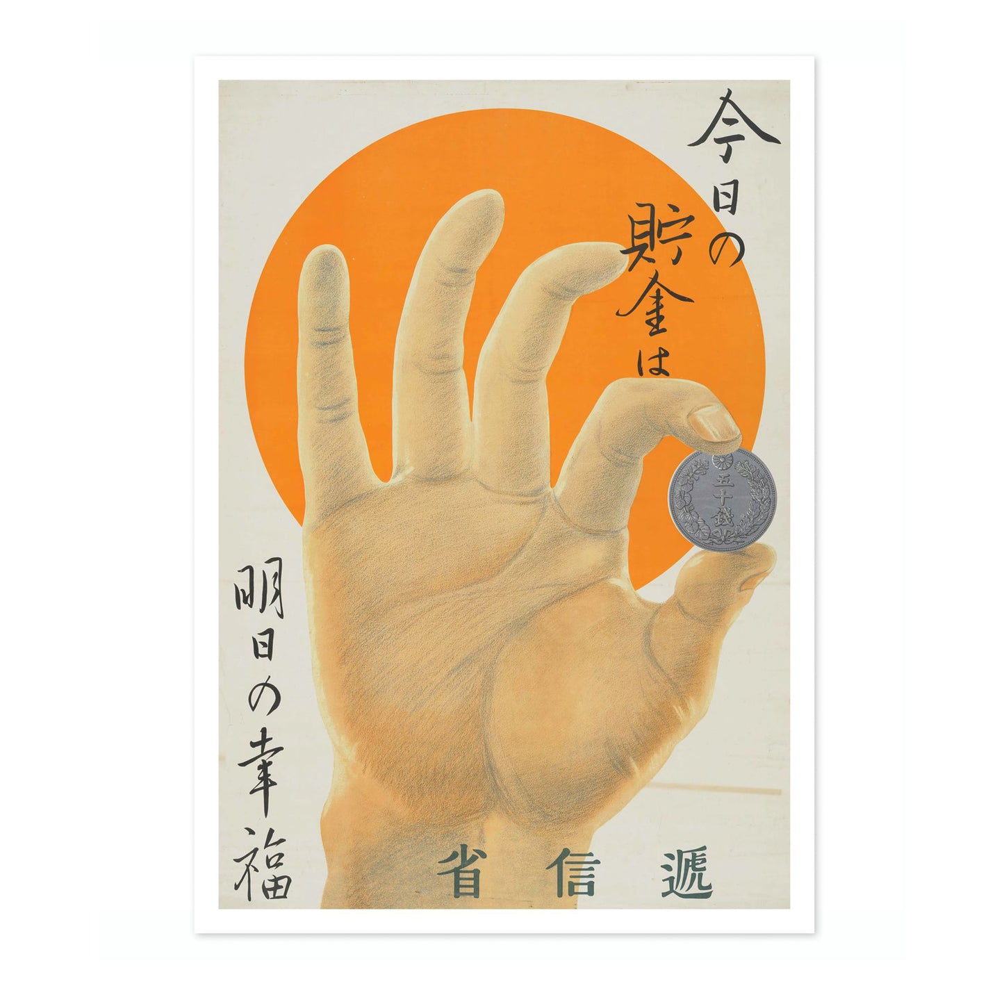 This vintage-style poster, "Hand and A Coin," features a detailed hand holding a coin against a vibrant orange sun backdrop. Japanese text elegantly frames the image, adding an authentic cultural touch. Ideal for those interested in themes of money and prosperity, this illustration uniquely combines artistry with historical elements. Rich in orange and yellow hues, it evokes both warmth and nostalgia.
