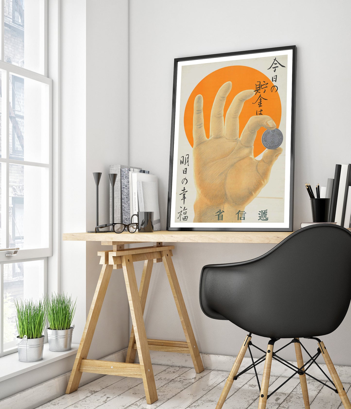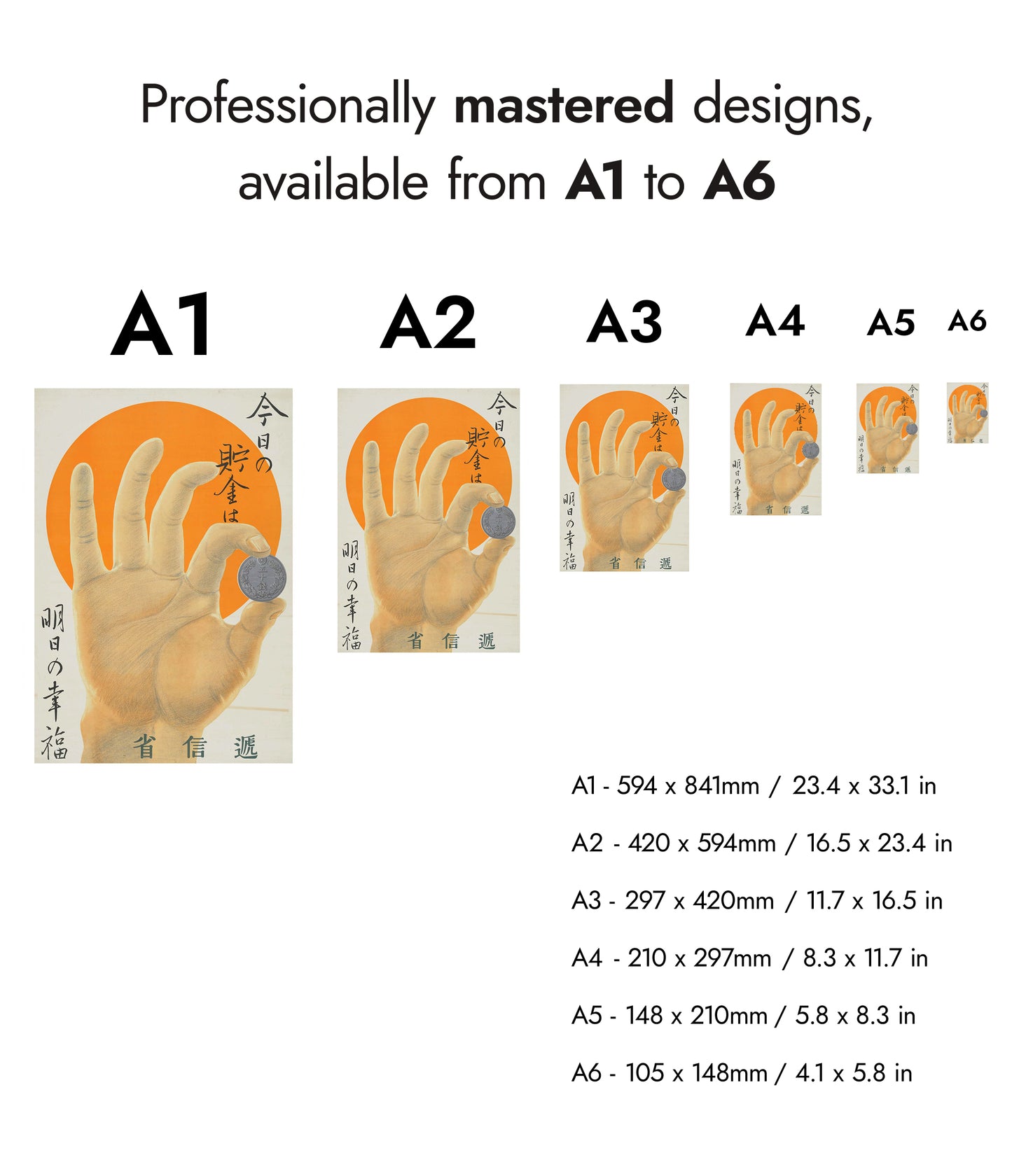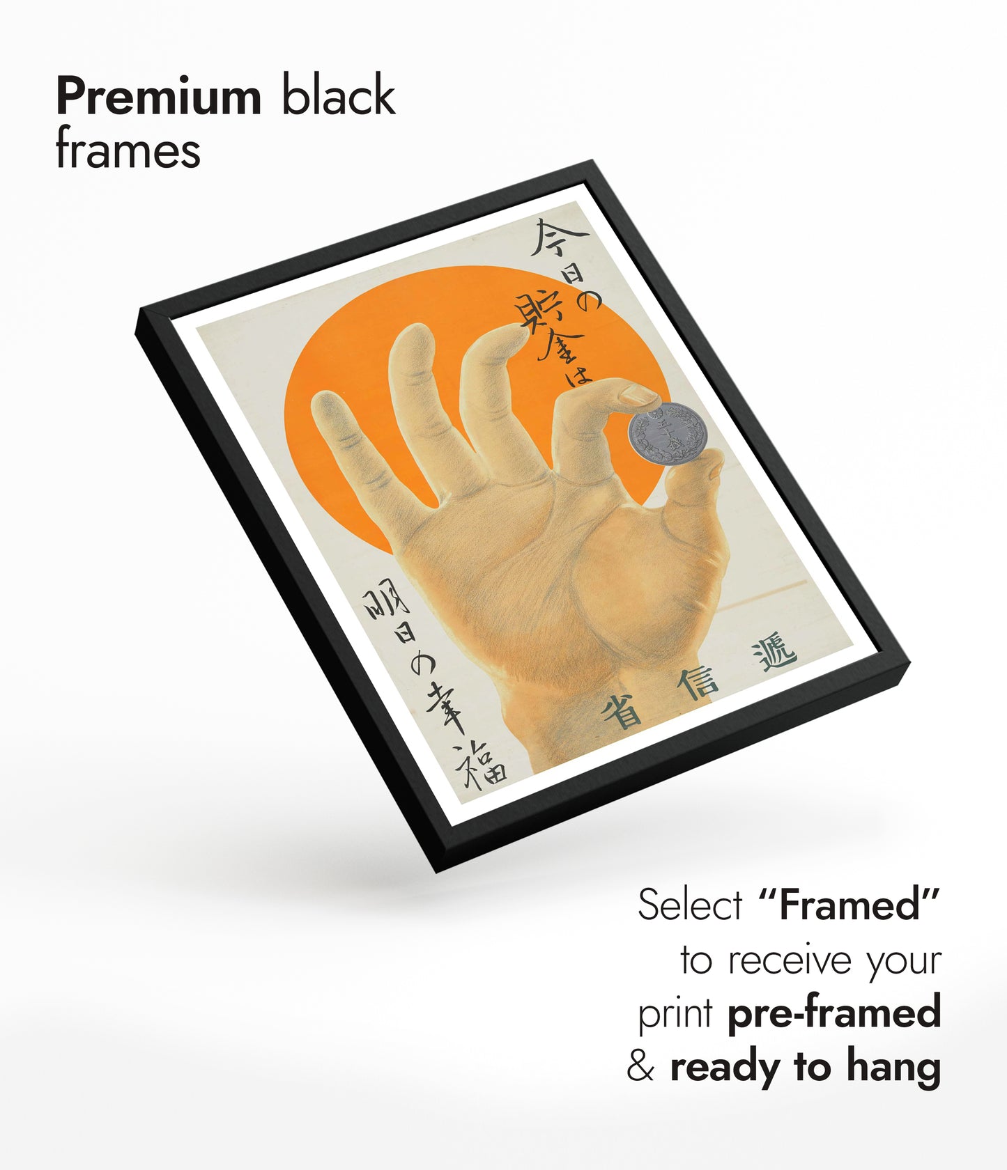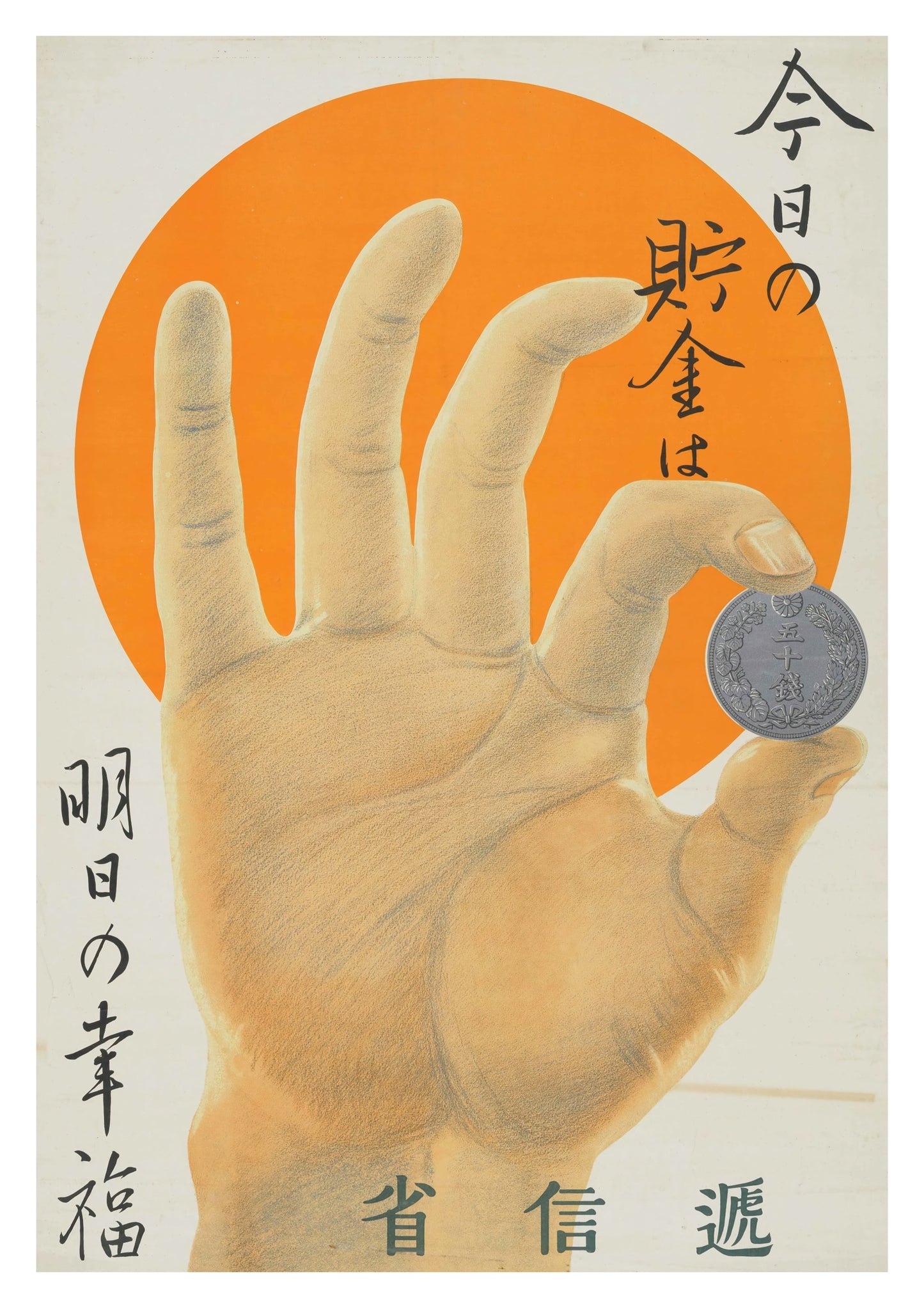 This vintage-style poster, "Hand and A Coin," features a detailed hand holding a coin against a vibrant orange sun backdrop. Japanese text elegantly frames the image, adding an authentic cultural touch. Ideal for those interested in themes of money and prosperity, this illustration uniquely combines artistry with historical elements. Rich in orange and yellow hues, it evokes both warmth and nostalgia.