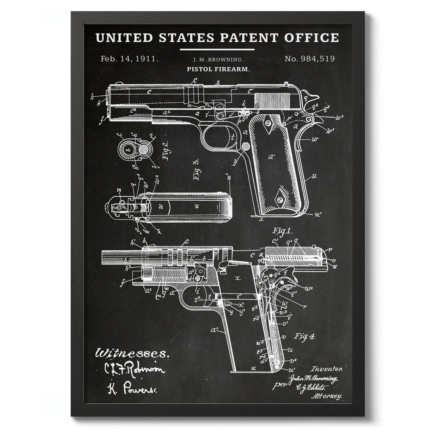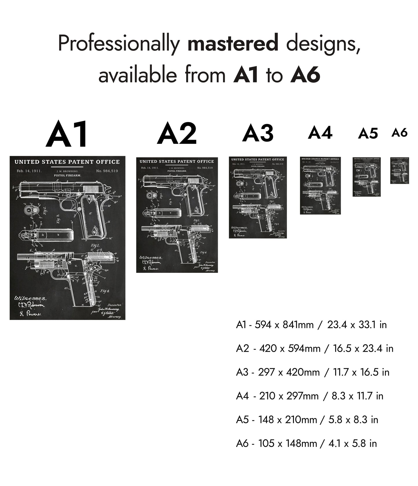 This vintage black and white poster showcases a detailed line art illustration of J.M. Browning's 1911 pistol patent. Featuring intricate schematic drawings and annotations, this gun-themed artwork highlights the precision engineering of the classic firearm. Perfect for enthusiasts of historical firearms and technical illustrations, this print beautifully marries vintage style with detailed craftsmanship in a poster format.