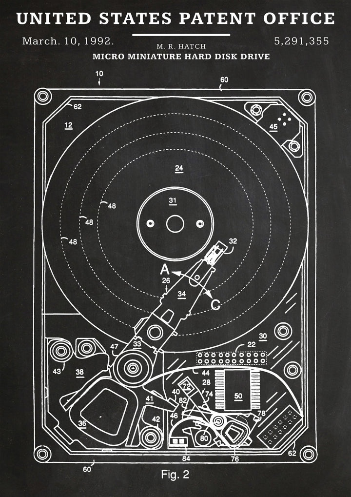 This vintage-style poster features a detailed schematic illustration of a micro miniature hard disk drive, originally patented on March 10, 1992. Rendered in line art, it highlights the intricate inner workings of the device, providing a technical and historical glimpse into computer technology. Ideal for tech enthusiasts, this patent print combines artistic appeal with scientific precision.