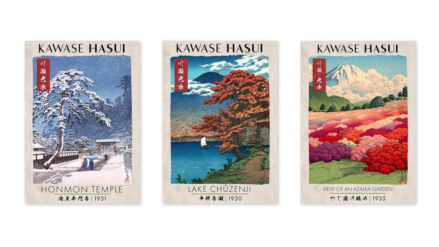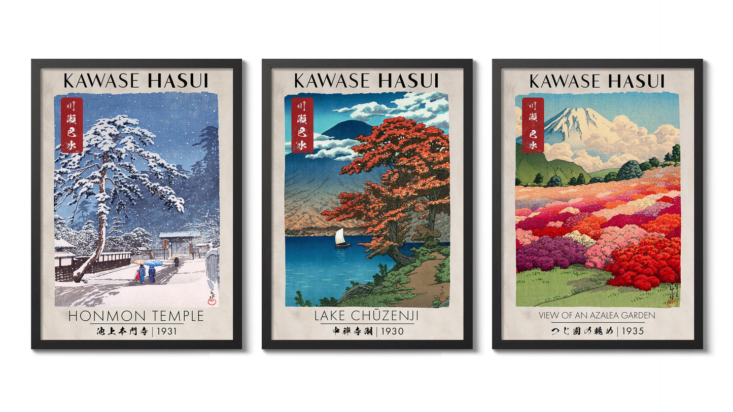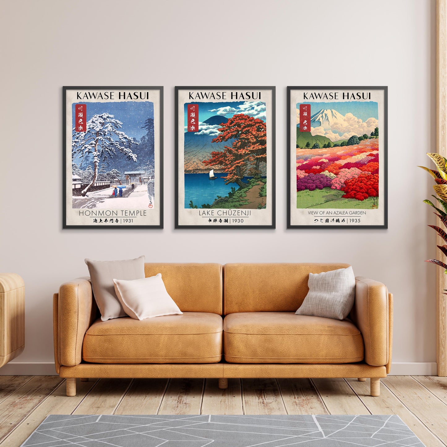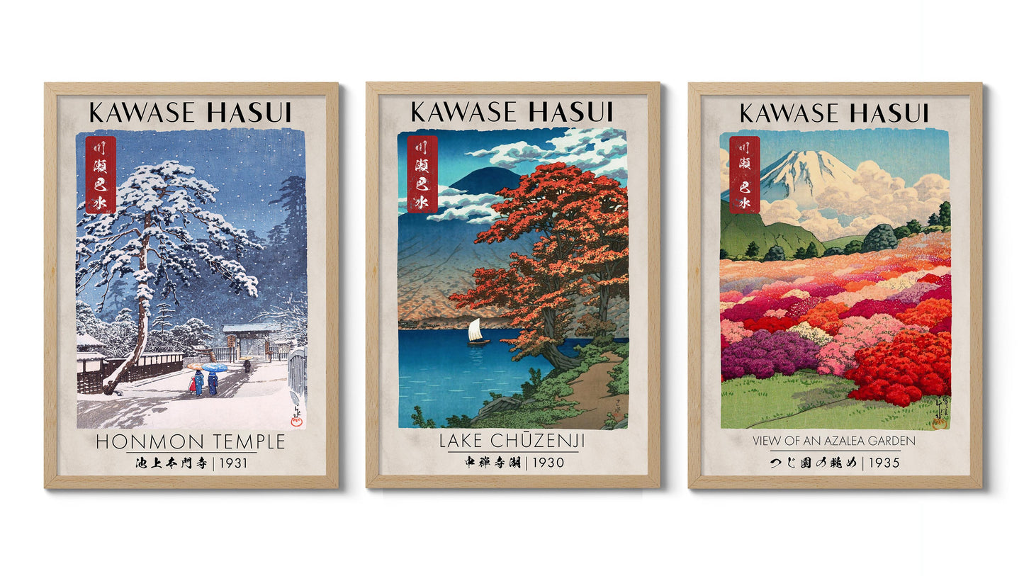 This vibrant poster set showcases Kawase Hasui's exquisite woodblock prints, capturing the essence of traditional Japanese landscapes across seasons. Featuring Honmon Temple adorned with winter snow, a serene Lake Chuzenji with autumn foliage, and a picturesque view of Mount Fuji in spring, each piece highlights Hasui's mastery of ukiyo-e, reflecting nature's beauty. Perfect for lovers of Japanese art and scenery.