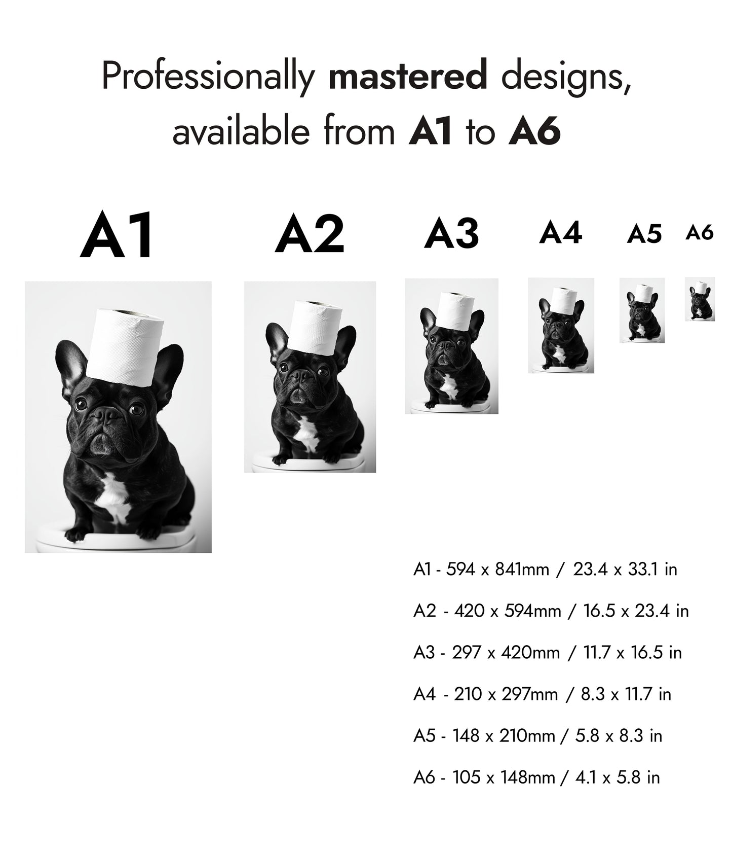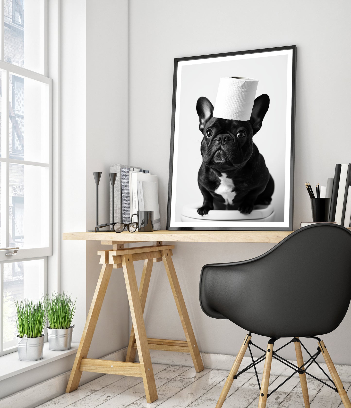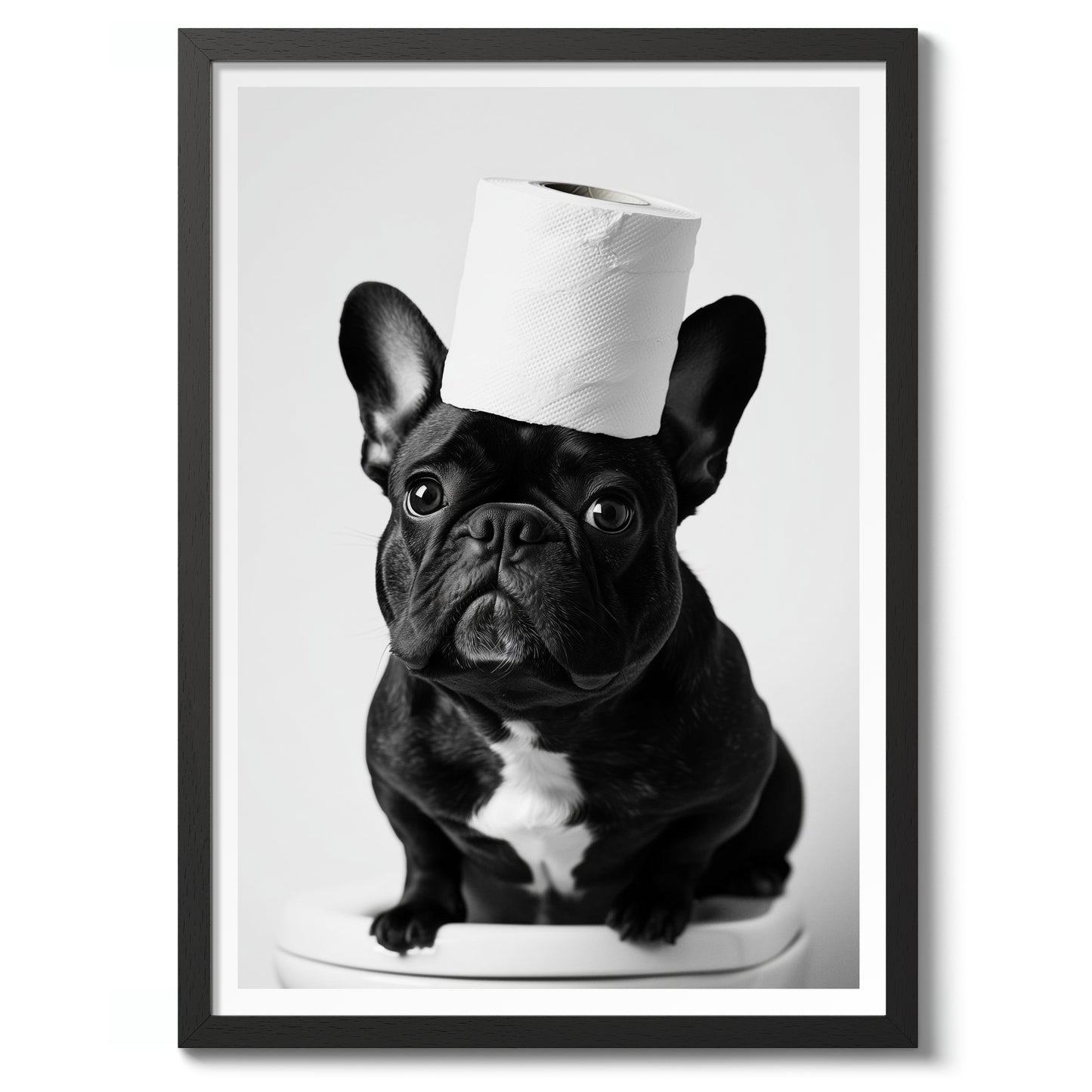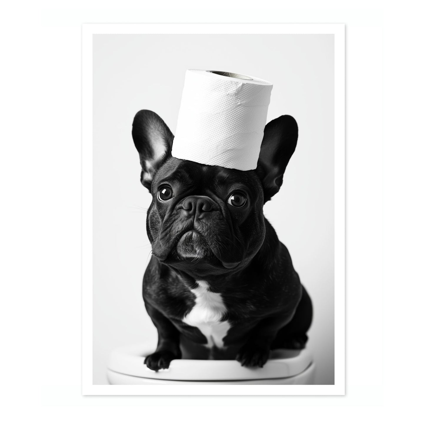 This "Haute Dog Couture" poster captures a whimsical black and white photograph of a French Bulldog adorned with a toilet roll on its head. Featuring striking contrasts and playful humor, this art print embodies a creative take on dog portraiture. Ideal for adding a touch of fun in bathroom spaces, it blends elegance with humor seamlessly.