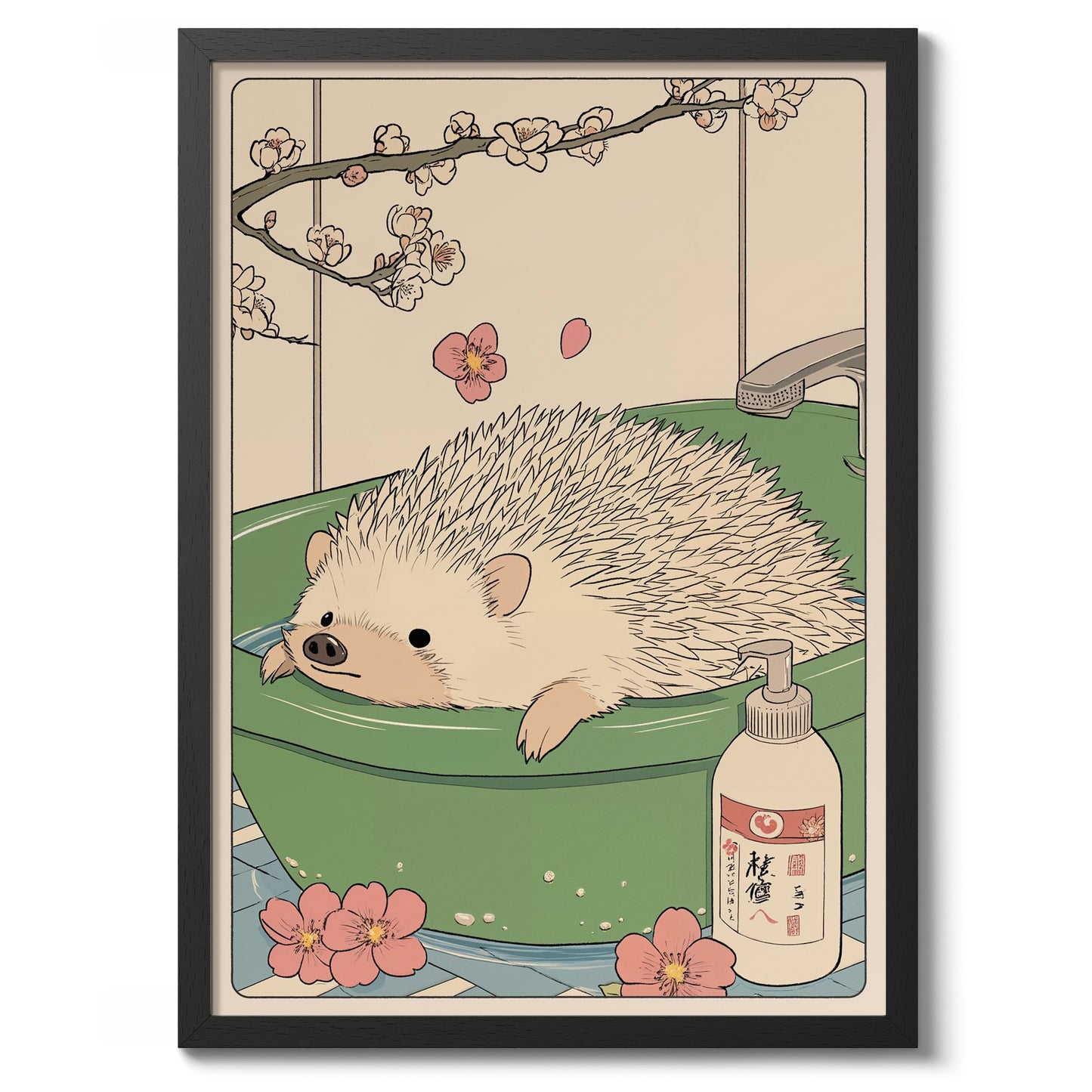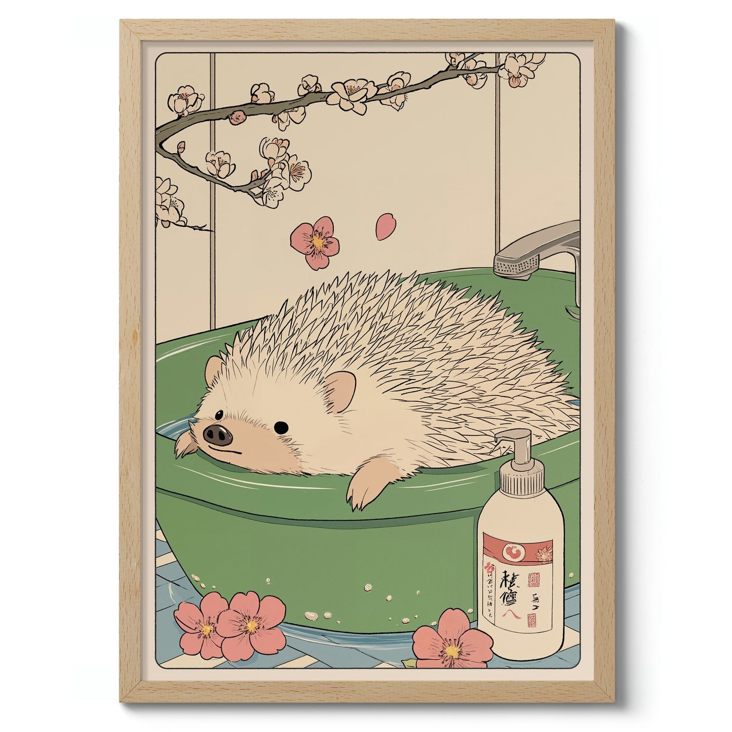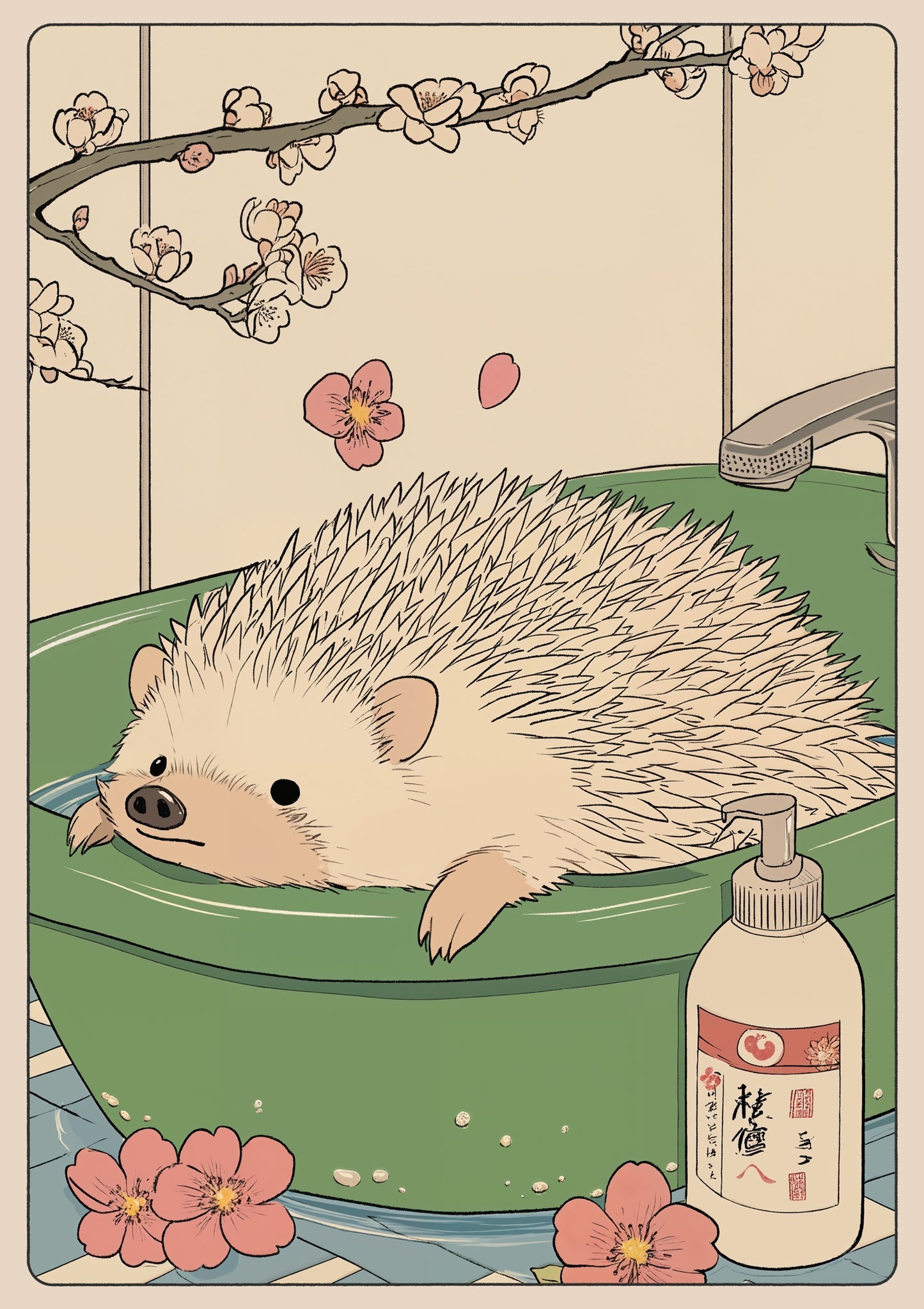 This charming anime poster titled "Hedgehog Bathtime" features a delightful hedgehog enjoying a soothing soak in a jade green bathtub. Delicate cherry blossoms frame the scene, imparting a tranquil, Japanese woodblock aesthetic. With subtle beige tones and meticulous illustration, this artwork perfectly captures a whimsical and serene bathroom moment. Ideal for those who love unique animal-themed decor.