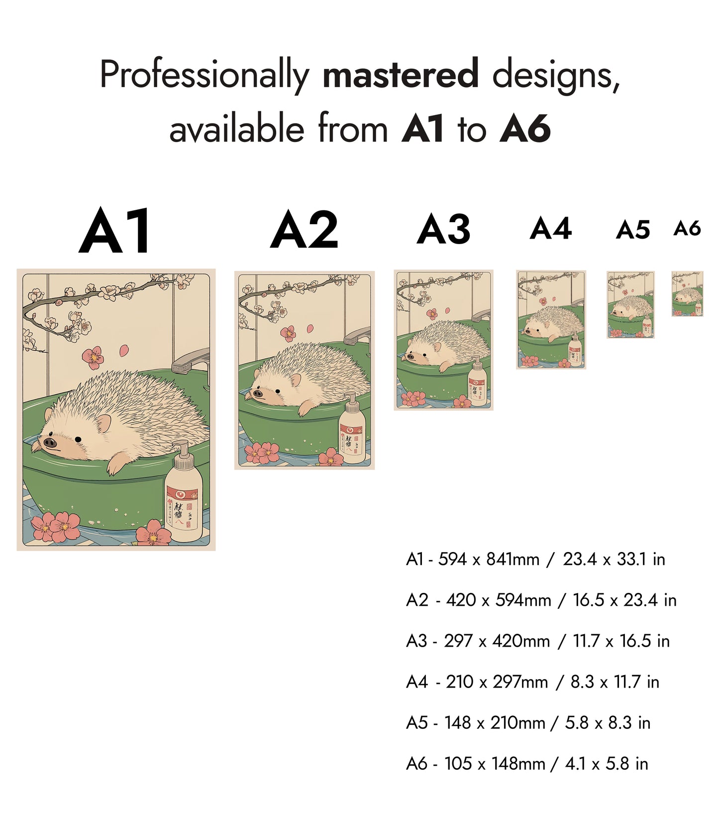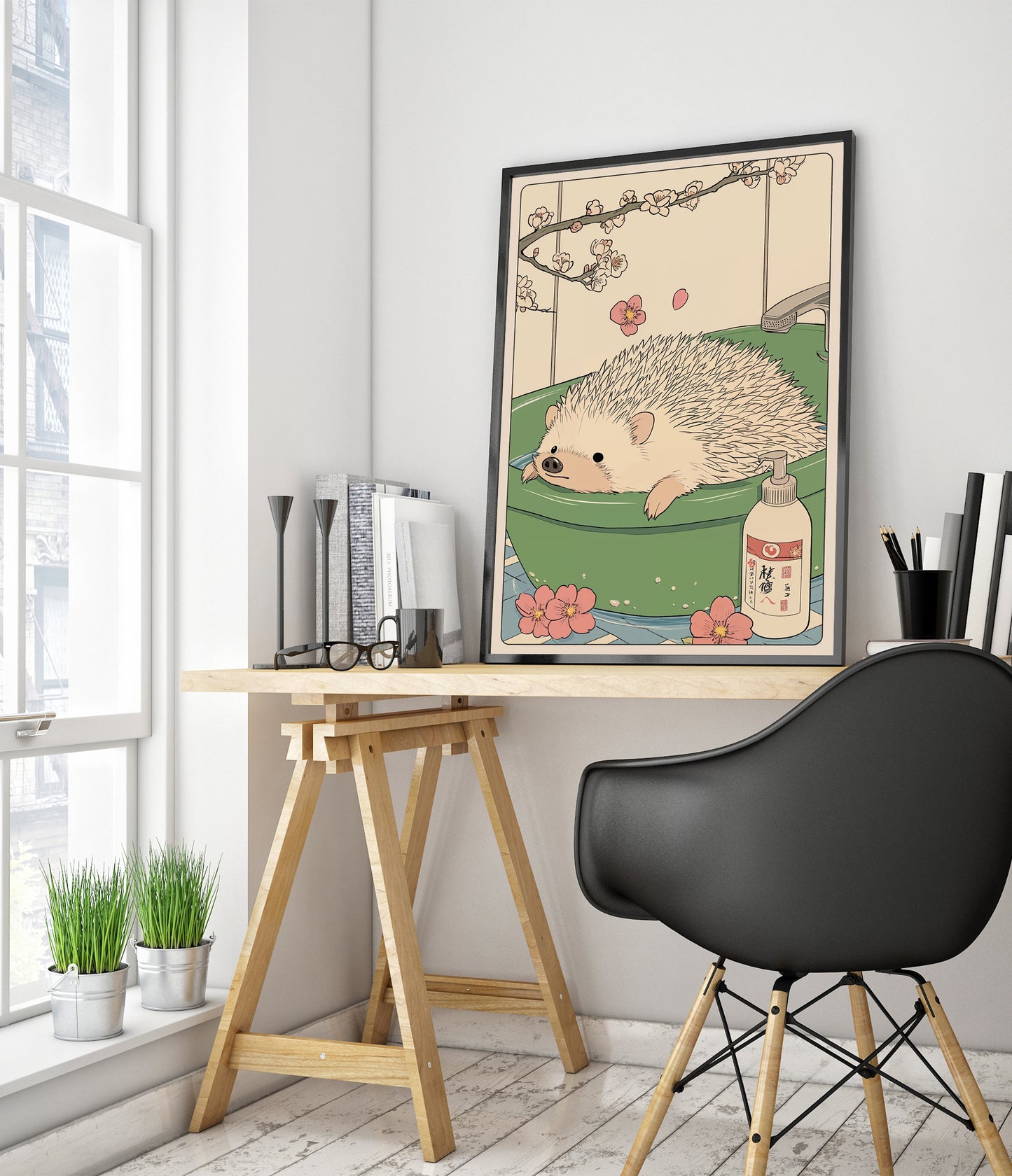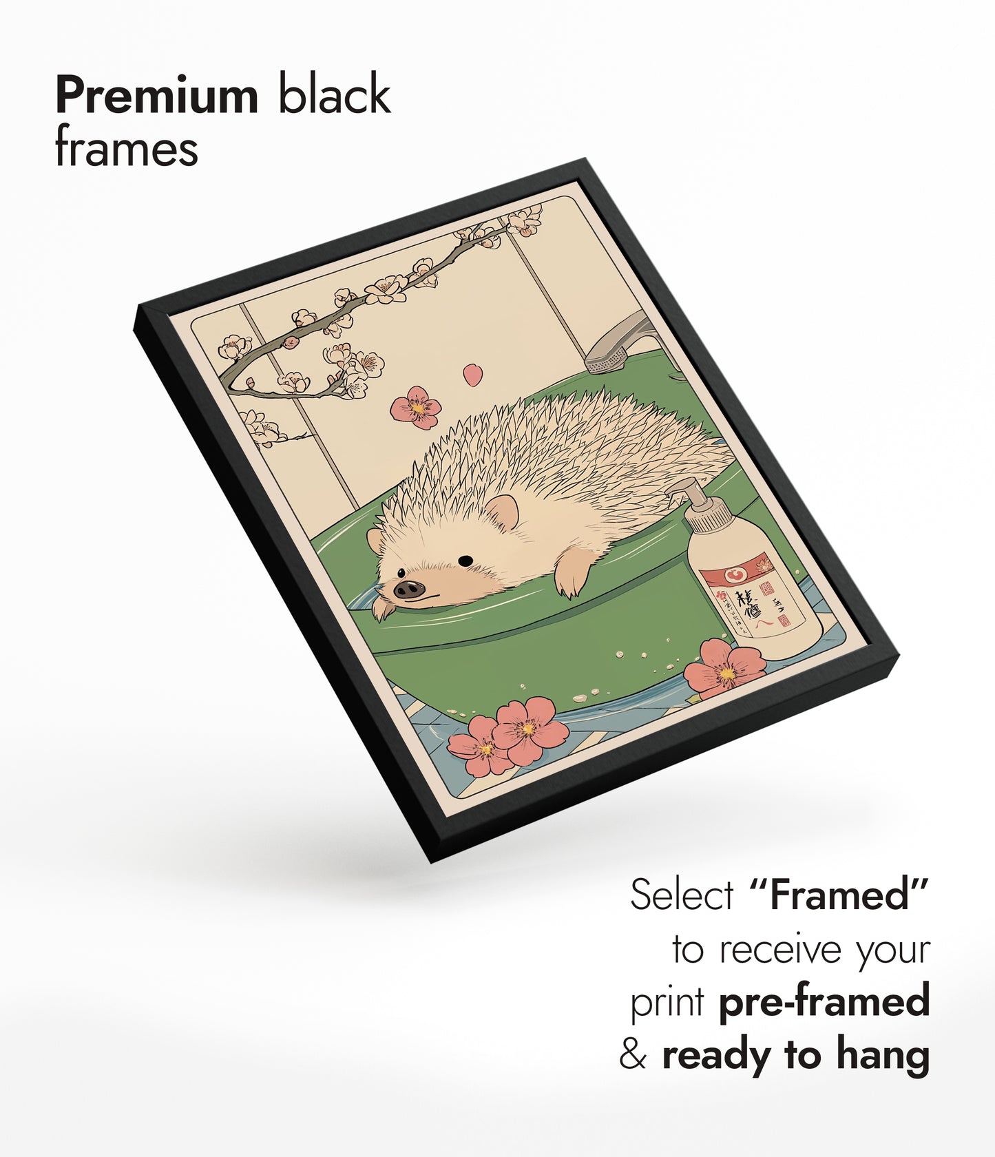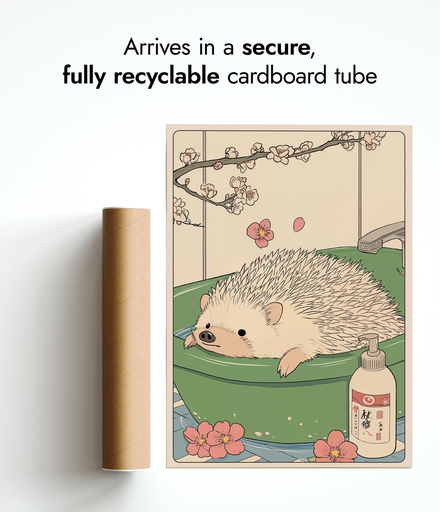 This charming anime poster titled "Hedgehog Bathtime" features a delightful hedgehog enjoying a soothing soak in a jade green bathtub. Delicate cherry blossoms frame the scene, imparting a tranquil, Japanese woodblock aesthetic. With subtle beige tones and meticulous illustration, this artwork perfectly captures a whimsical and serene bathroom moment. Ideal for those who love unique animal-themed decor.