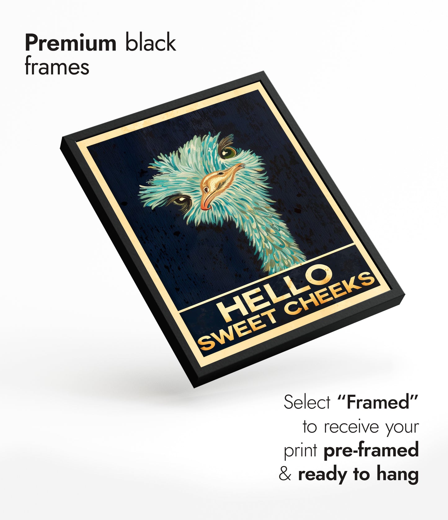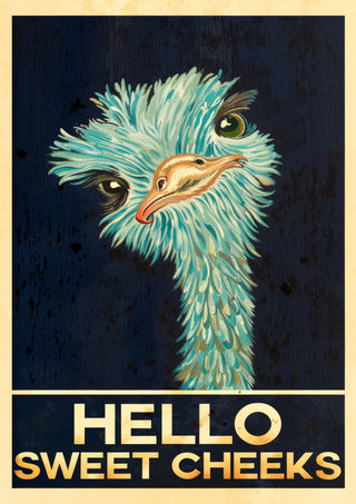 This playful poster features a whimsically illustrated ostrich with expressive eyes set against a dark backdrop, bringing humor and charm to any space. The bold lettering "HELLO SWEET CHEEKS" adds a fun typographic element, perfect for adding a lighthearted touch to bathrooms or quirky decor settings. Ideal for those seeking unique, humor-infused art prints.