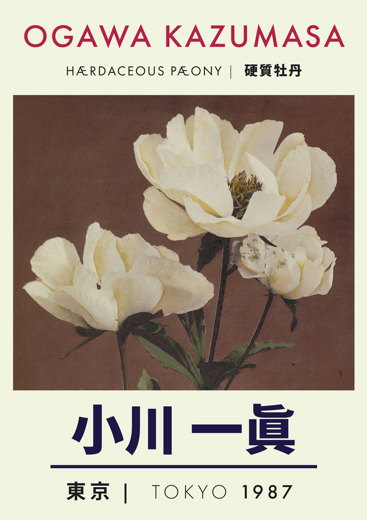 This "Herbaceous Peony" poster by Ogawa Kazumasa showcases a detailed, vintage portrayal of elegant white peonies set against a rich maroon background. Highlighting Japanese floral artistry from Tokyo 1987, this photographic still life embodies delicate petals and timeless beauty, ideal for floral and botanical enthusiasts. Perfect for adding a touch of classic elegance to any space.