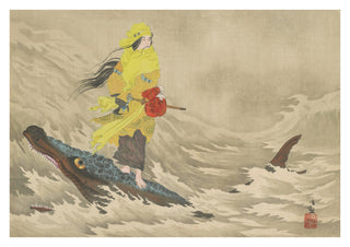 This stunning poster features "Hiko-Hohodemi Riding the Crocodile" by Kobayashi Kiyochika. The traditional Japanese woodblock print captures Hiko-Hohodemi, a mythical figure, astride a crocodile amidst tumultuous waves. The intricate illustration highlights the dynamic movement of the sea and the bold determination of the hero in his distinctive yellow attire. Perfect for lovers of traditional and fantasy art.