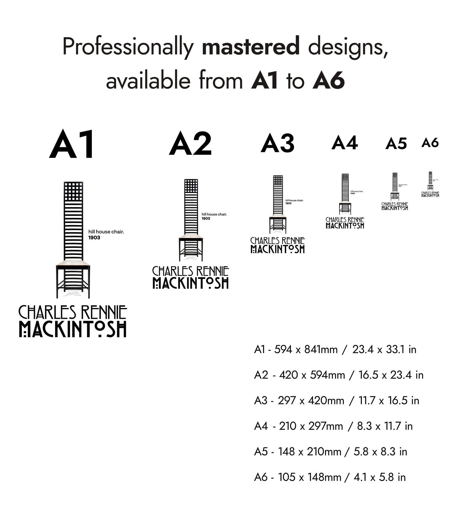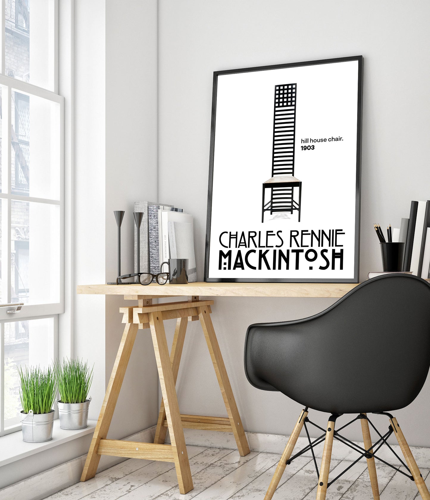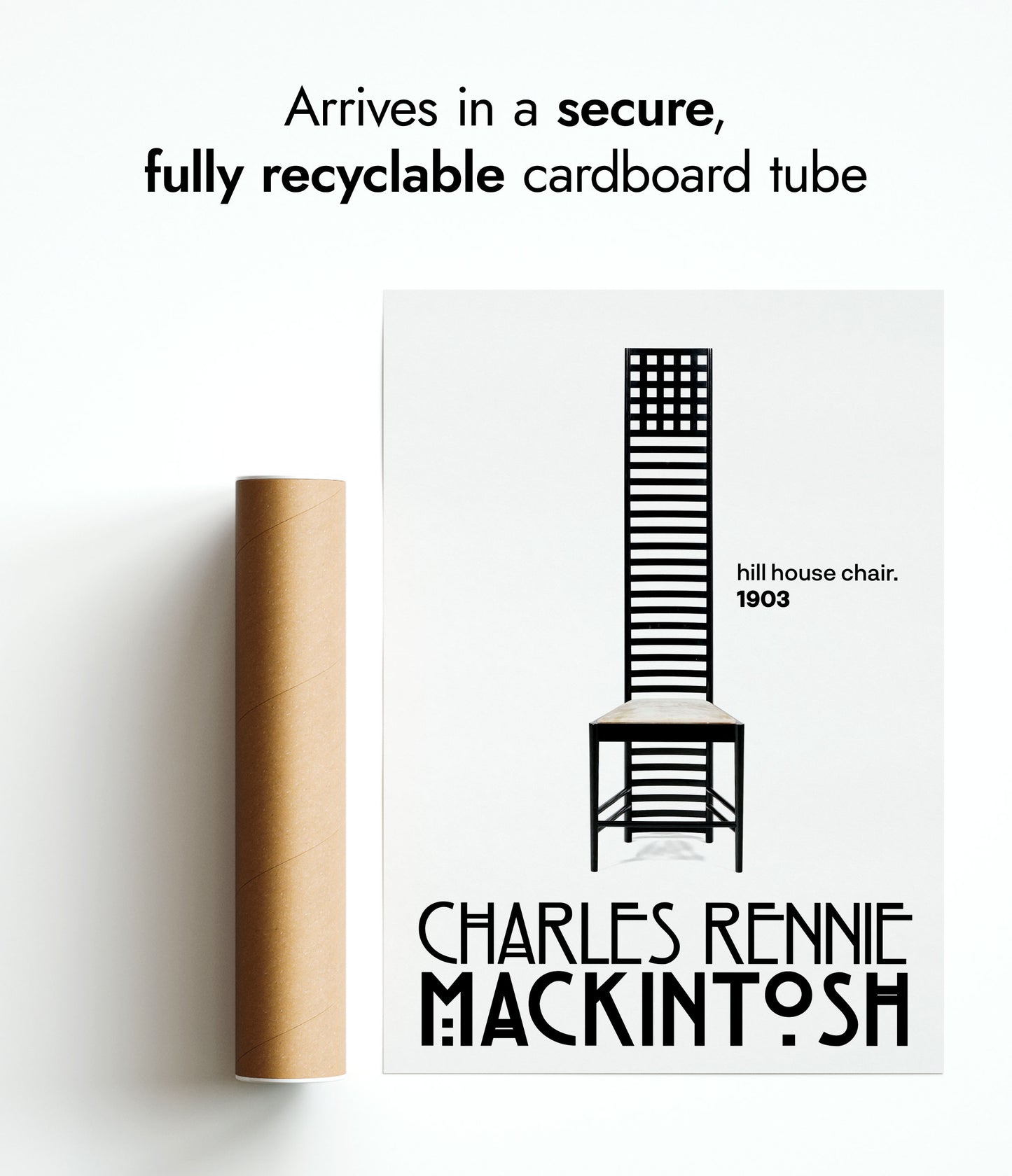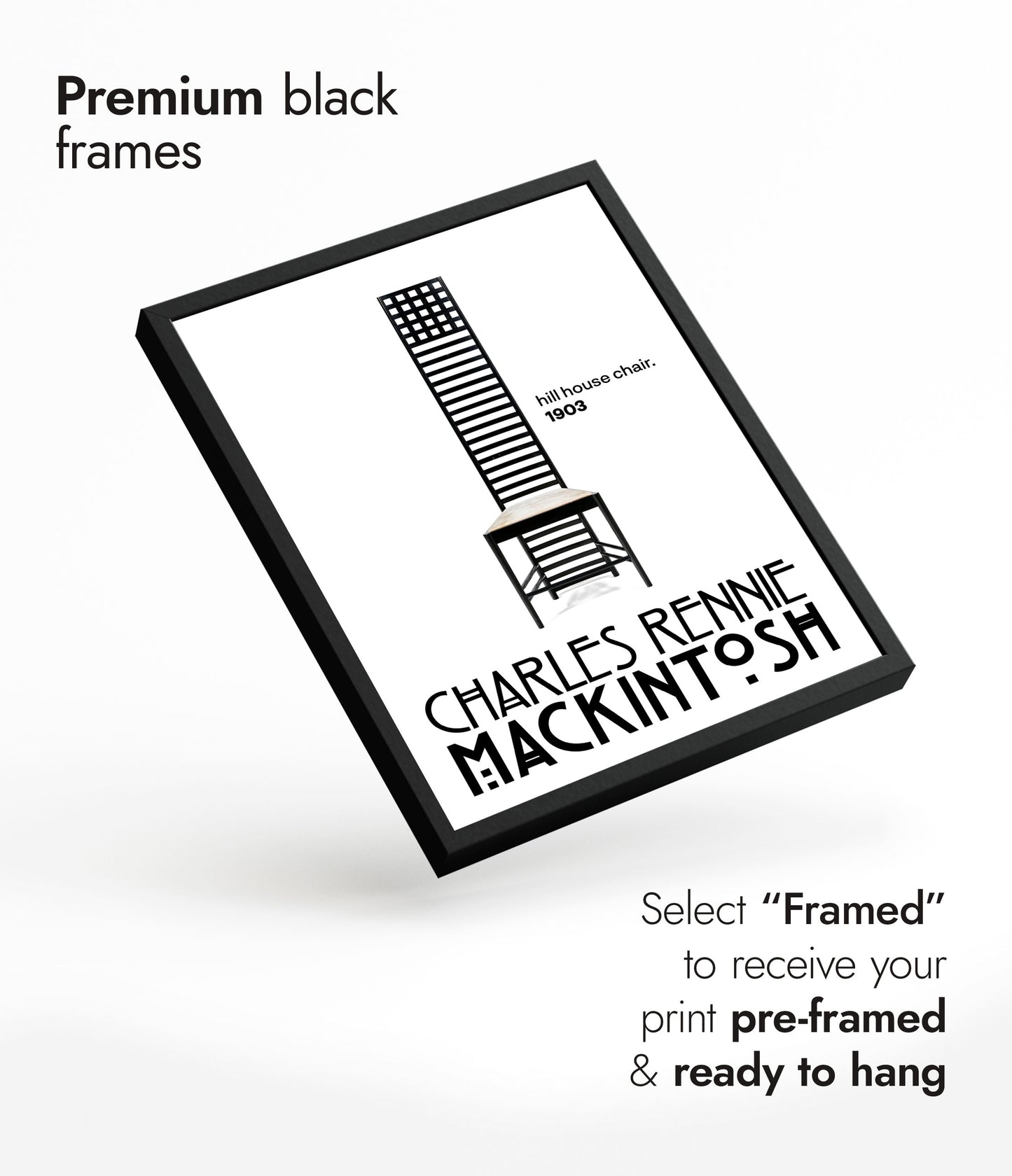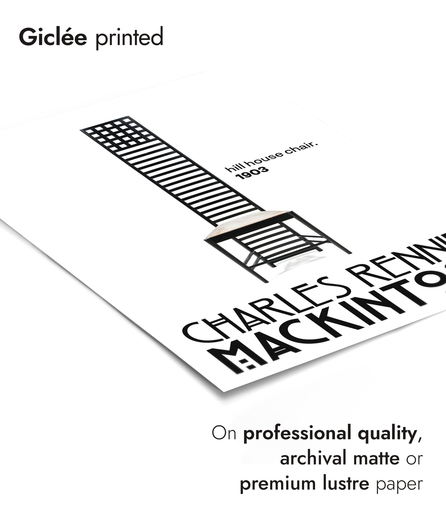 This Hill House Chair poster features an iconic graphic representation of Charles Rennie Mackintosh's 1903 design. The minimalist black and white composition showcases the chair's tall, grid-patterned backrest and clean lines, embodying Mackintosh's distinctive architectural style. Ideal for enthusiasts of mid-century, vintage, and minimalist design, this poster highlights the elegance and simplicity of early 20th-century furniture.