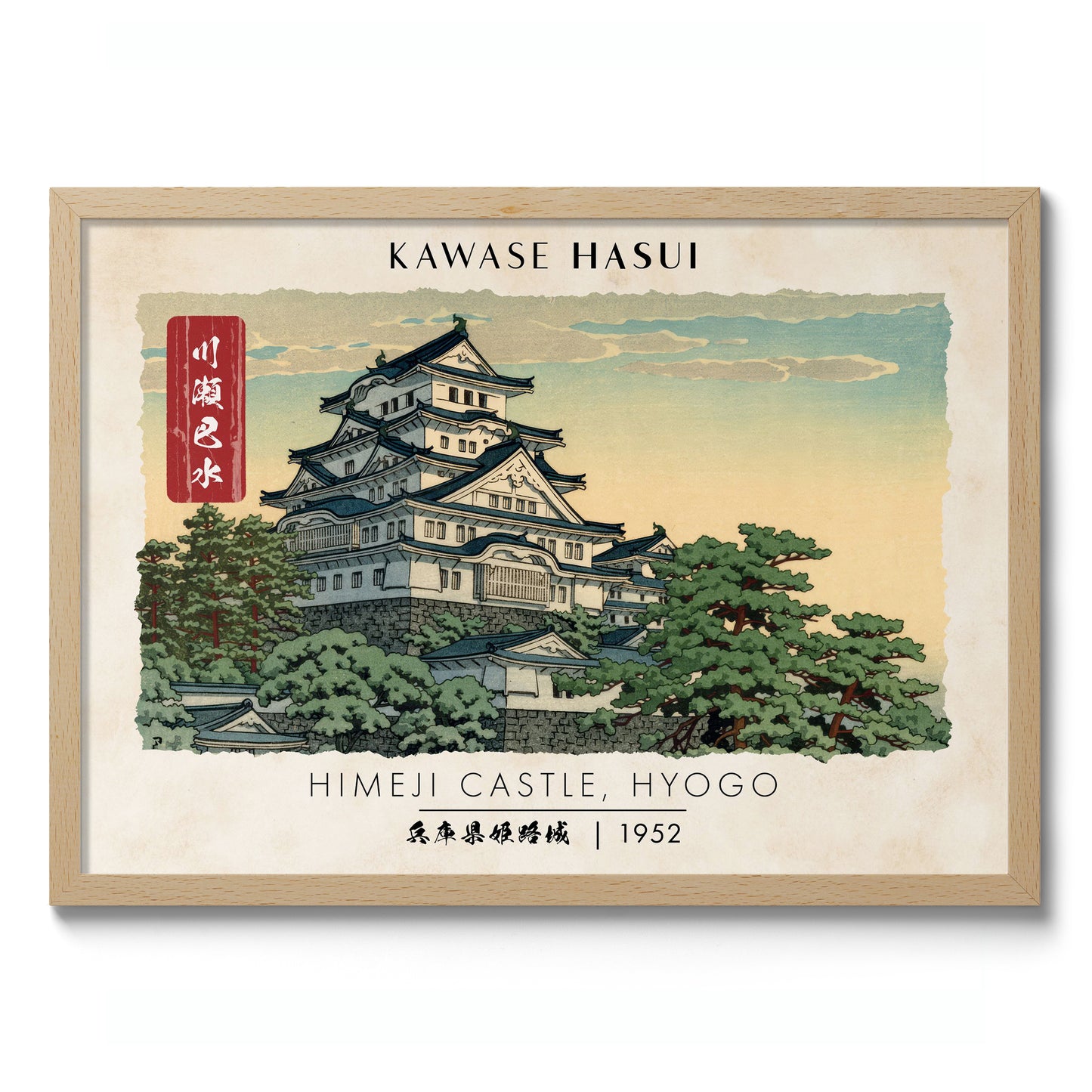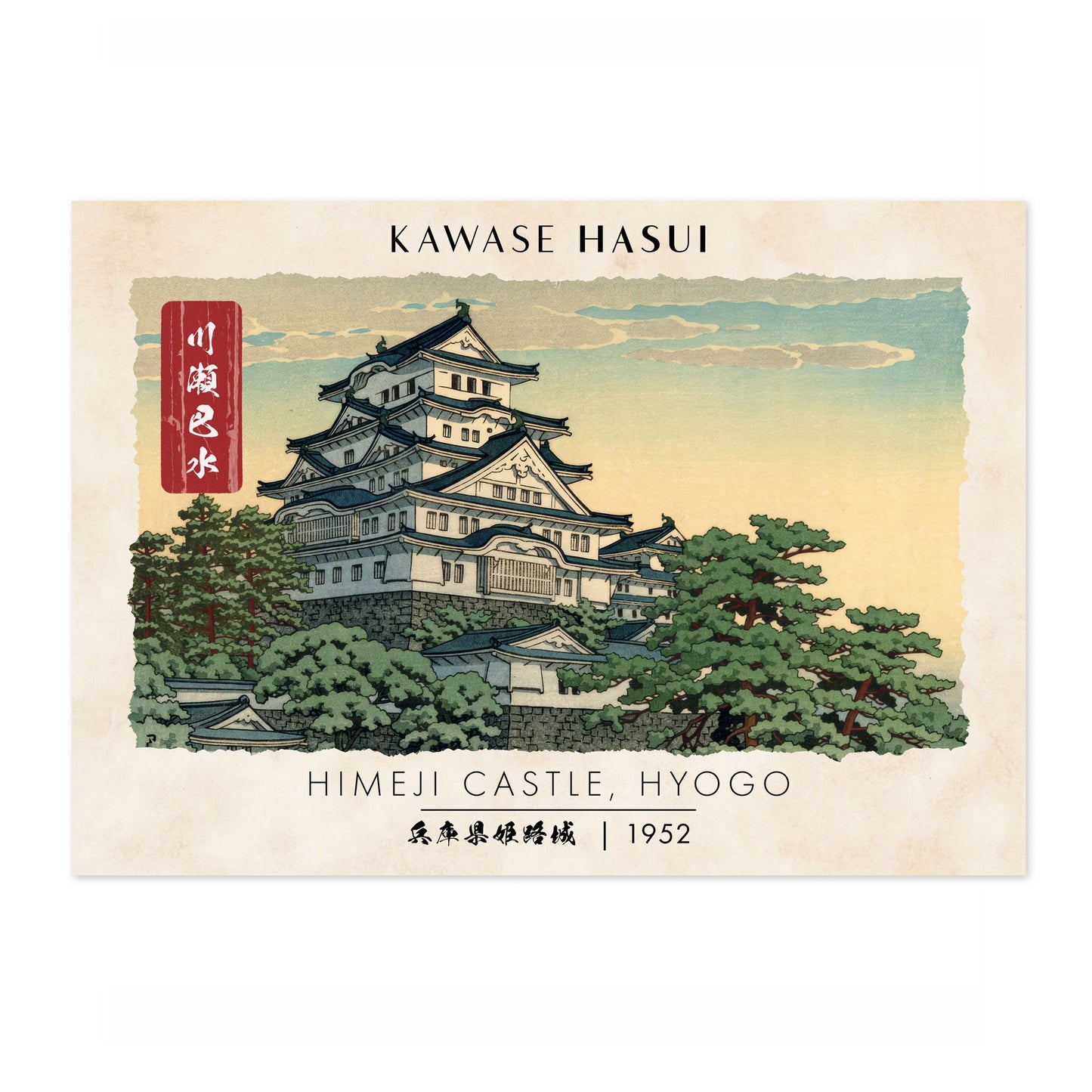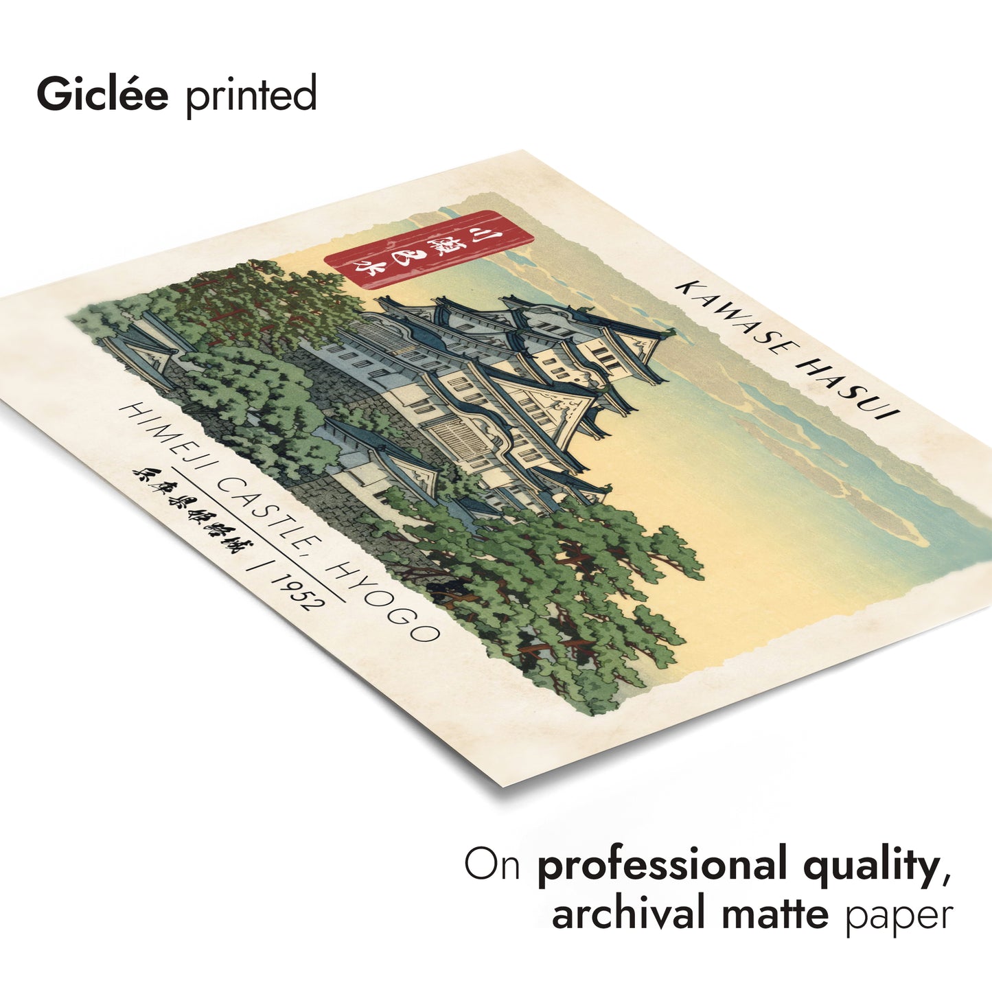 This "Himeji Castle" poster by Kawase Hasui captures the elegance of Japan's iconic fortress, rendered in traditional woodblock style. Set against a soft morning sky, the castle's intricate architecture is framed by lush trees, evoking the serene beauty of Hyogo's landscape. Created in 1952, this piece embodies timeless Japanese artistry and cultural heritage, making it an exquisite art print for any setting.