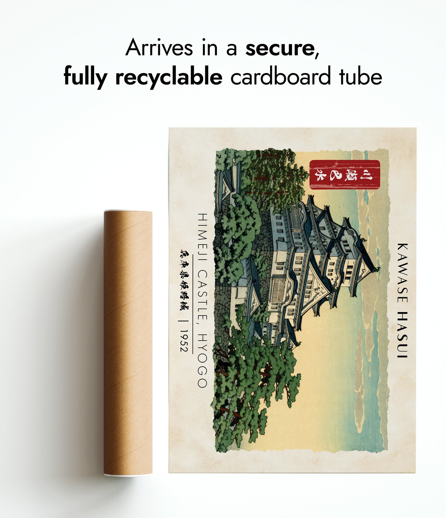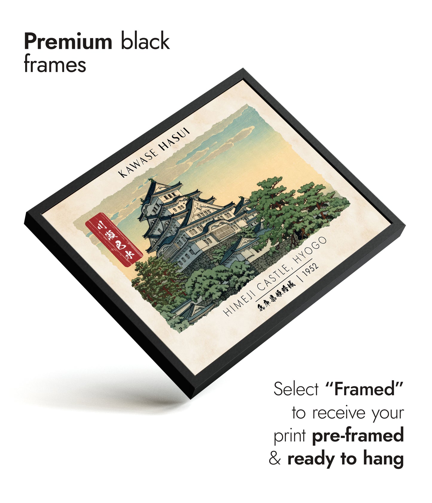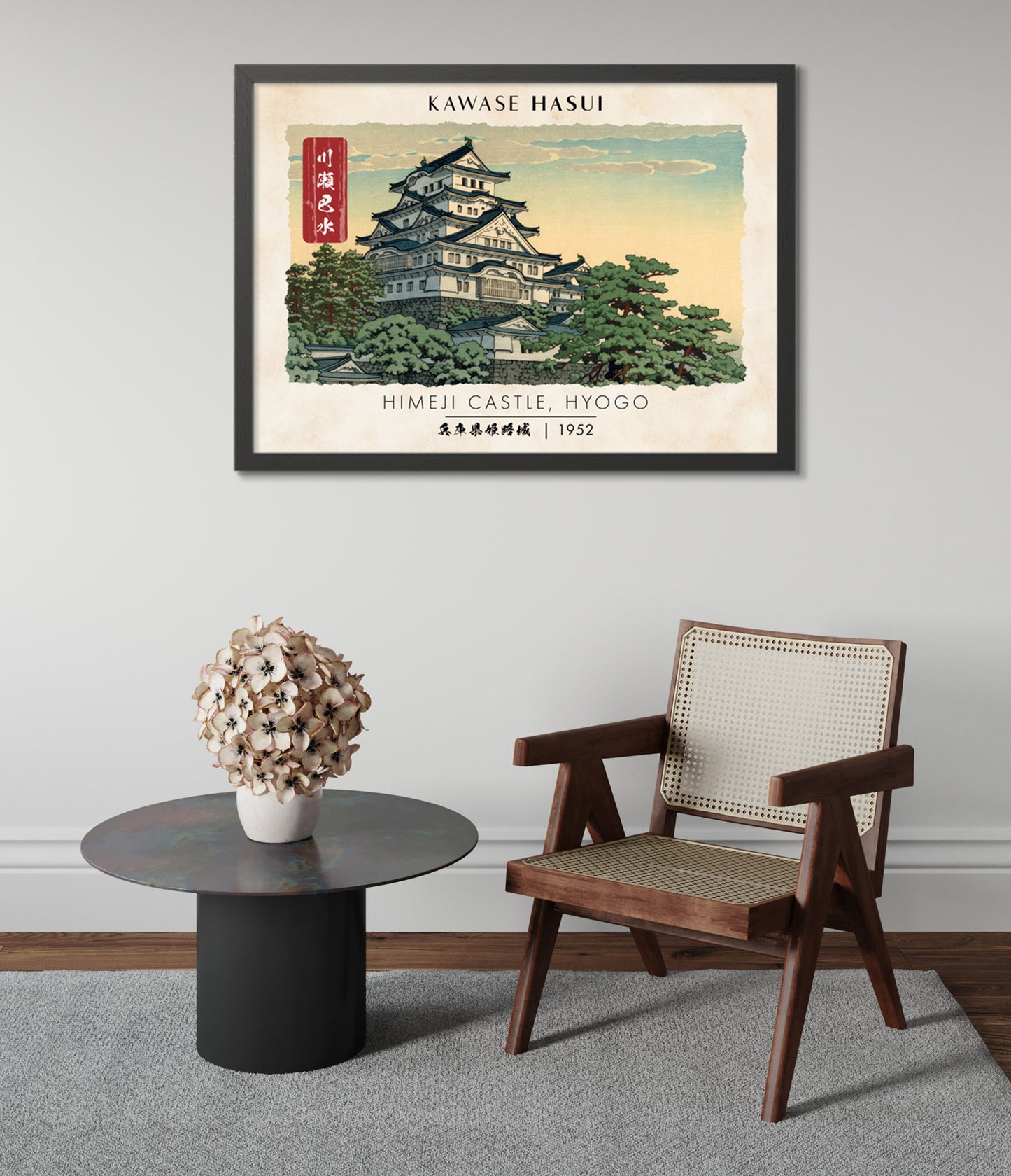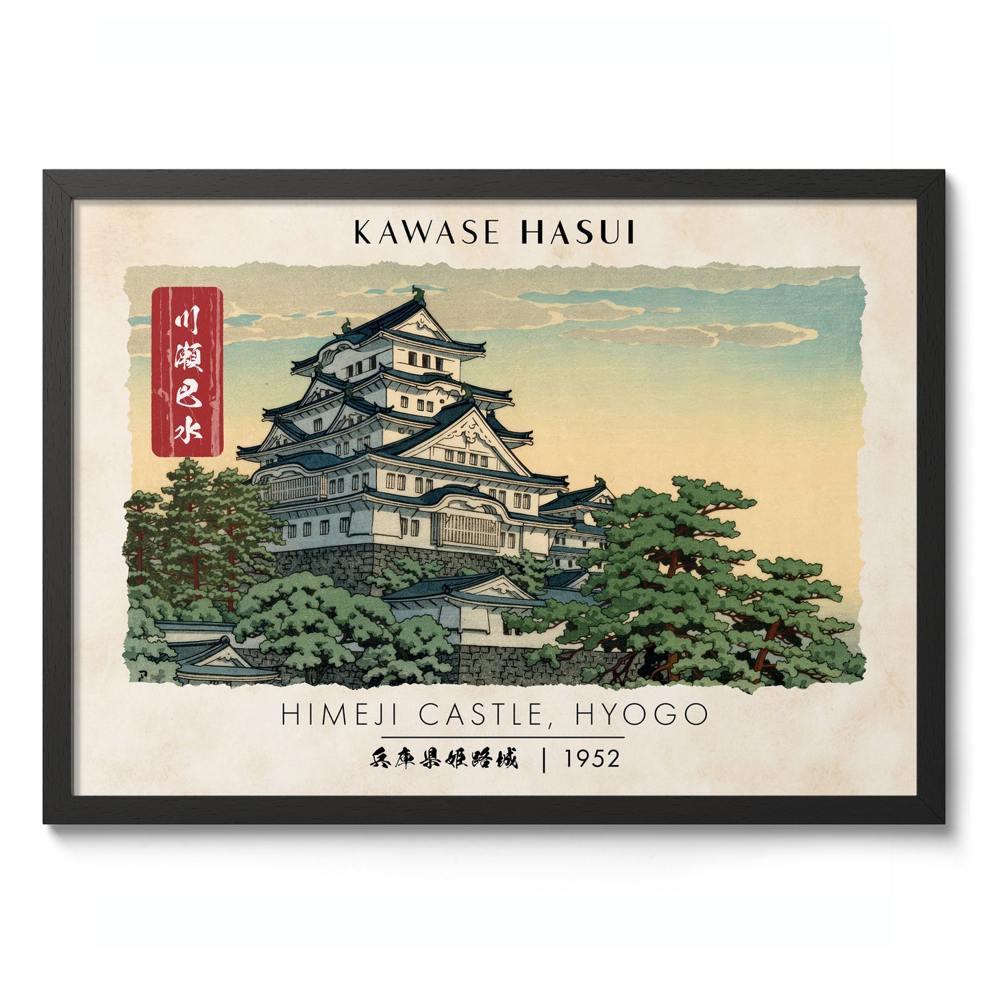 This "Himeji Castle" poster by Kawase Hasui captures the elegance of Japan's iconic fortress, rendered in traditional woodblock style. Set against a soft morning sky, the castle's intricate architecture is framed by lush trees, evoking the serene beauty of Hyogo's landscape. Created in 1952, this piece embodies timeless Japanese artistry and cultural heritage, making it an exquisite art print for any setting.