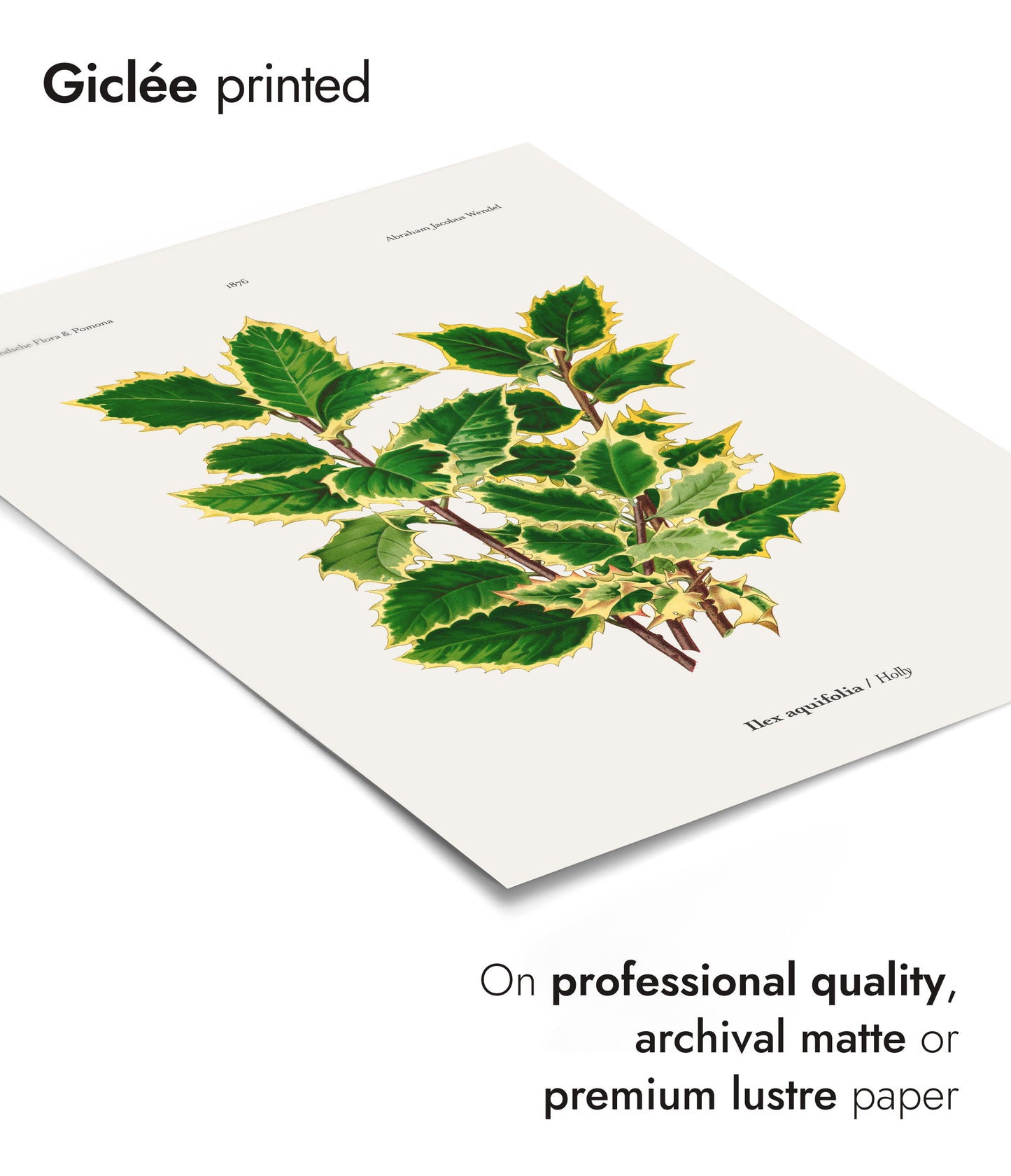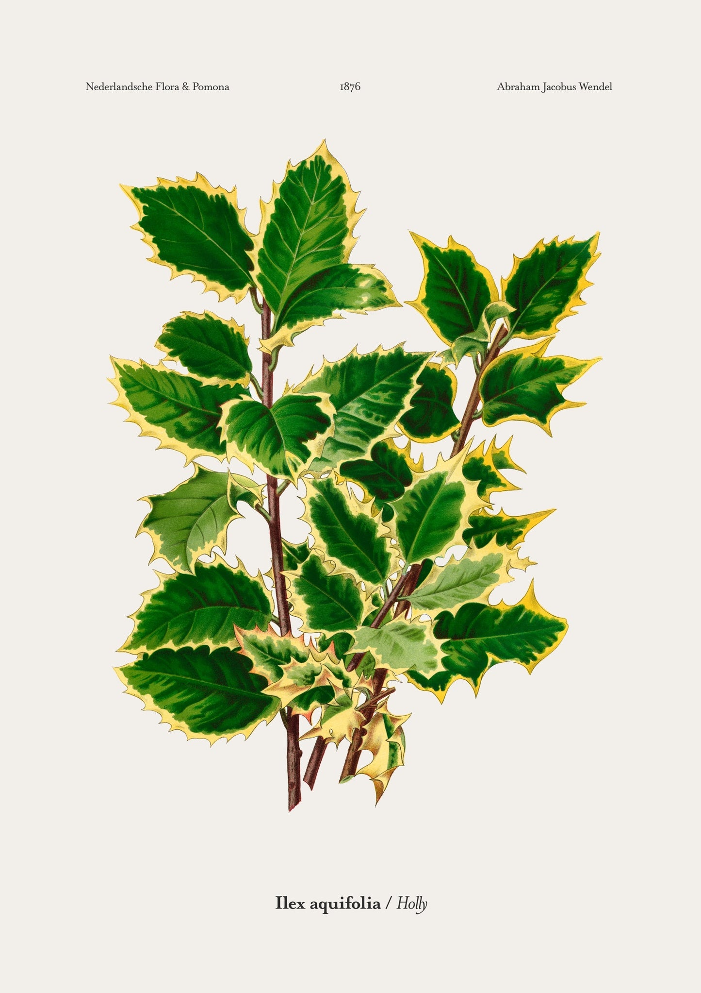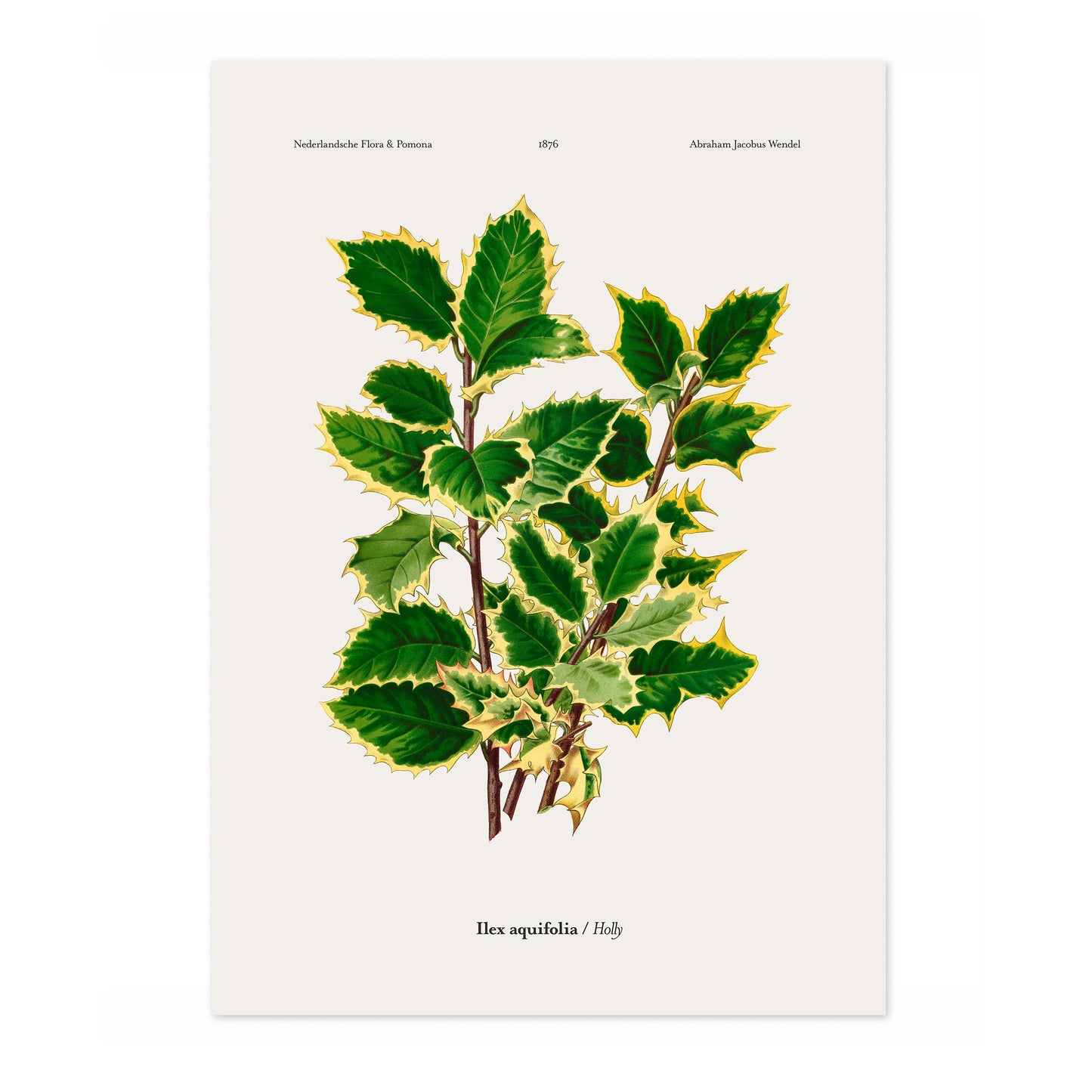 The "Holly" botanical poster by A. J. Wendel features a detailed vintage illustration of the Ilex aquifolia plant. With its vibrant green leaves edged in gold, this artwork highlights the natural beauty of holly foliage. Perfect for adding a touch of nature to any space, this exhibition-style print blends classic botanical art with timeless elegance.