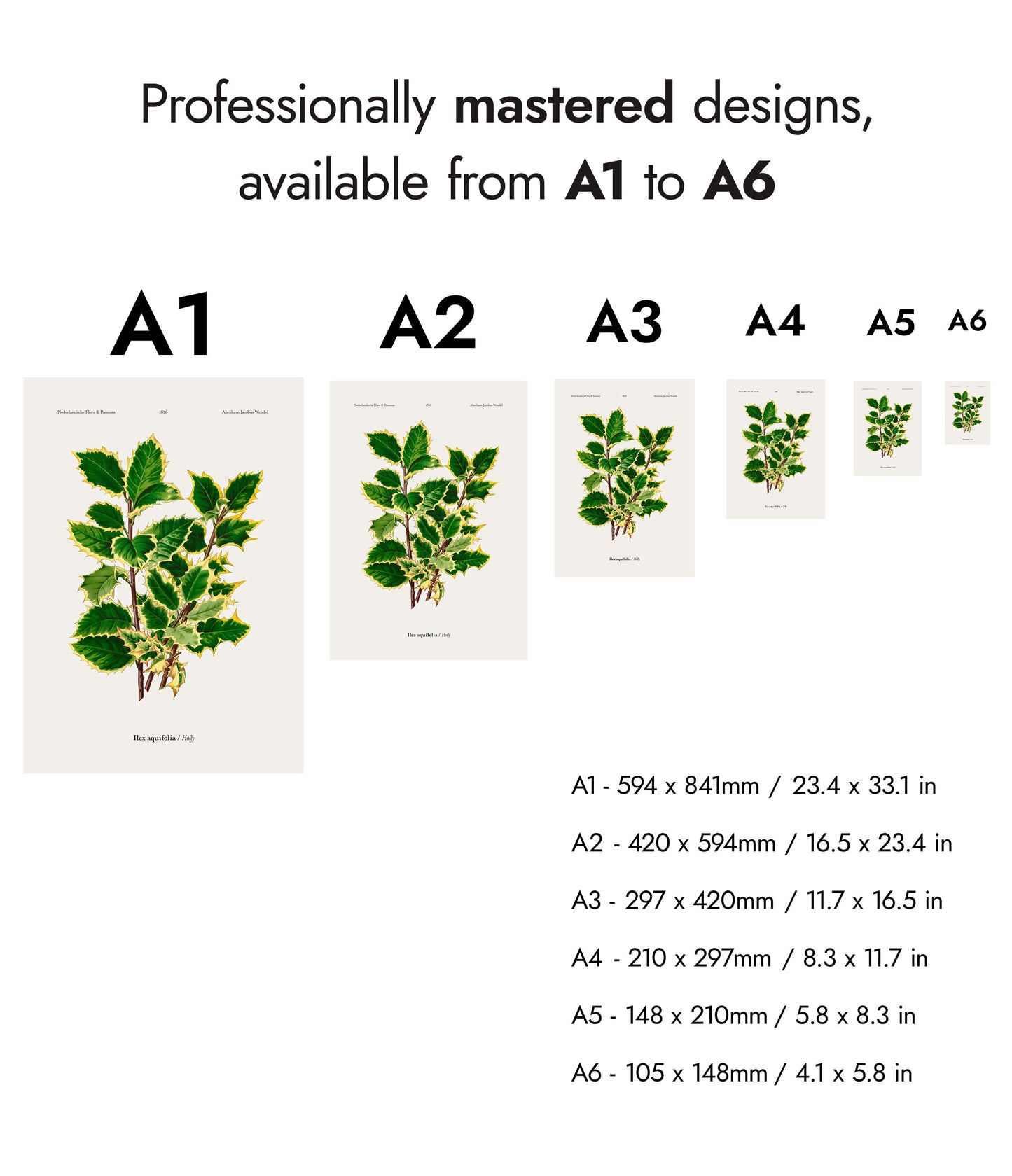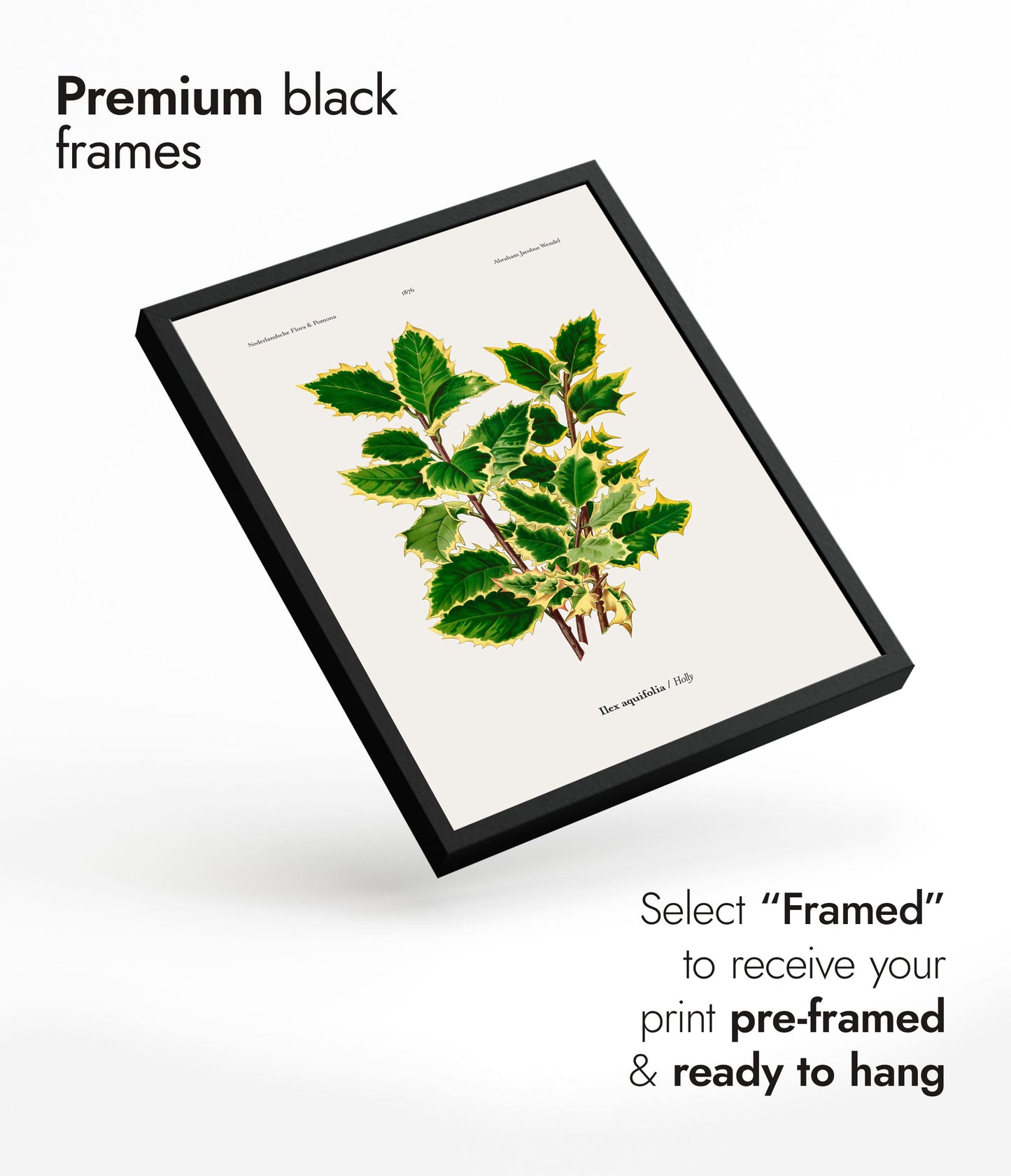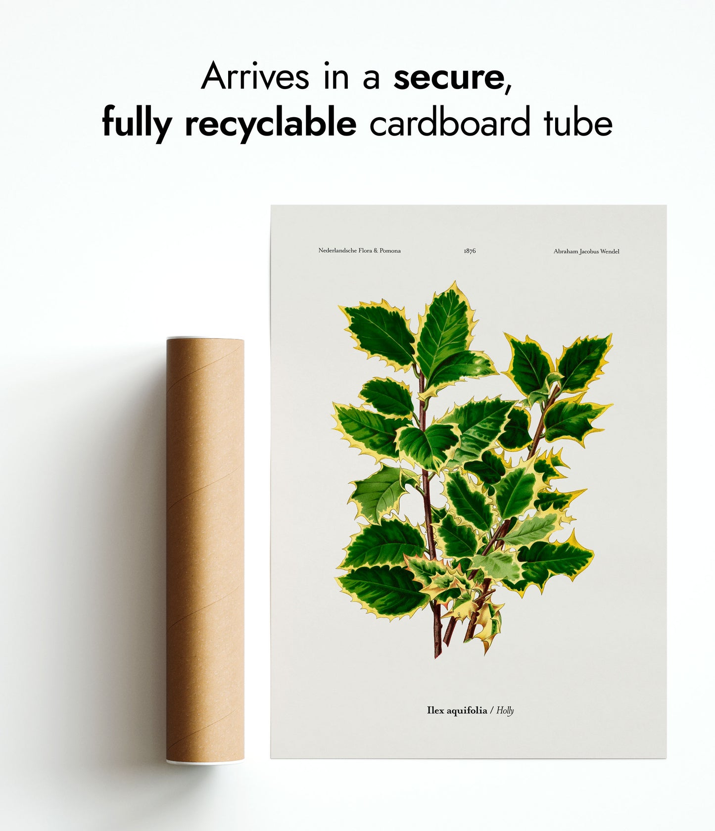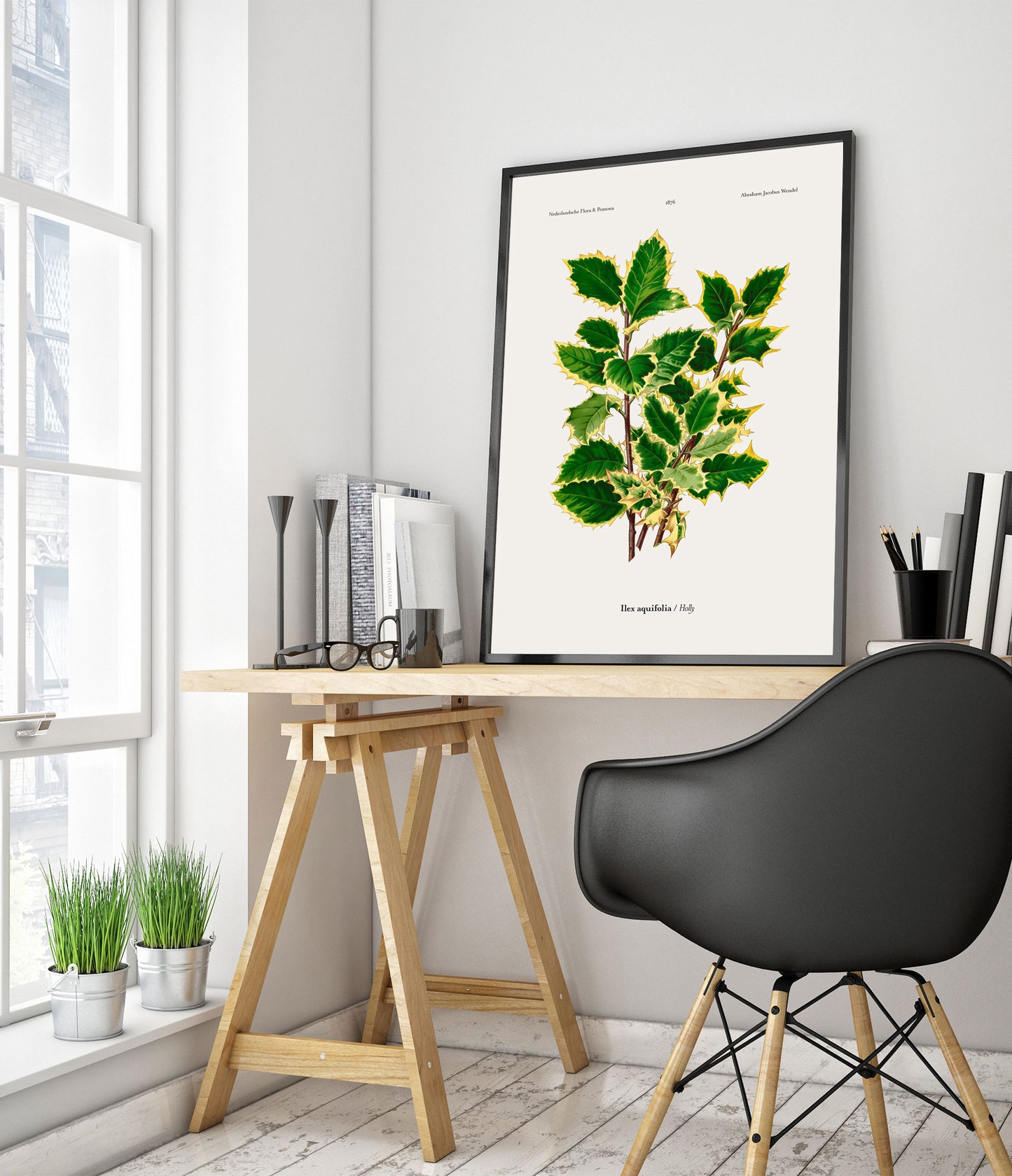 The "Holly" botanical poster by A. J. Wendel features a detailed vintage illustration of the Ilex aquifolia plant. With its vibrant green leaves edged in gold, this artwork highlights the natural beauty of holly foliage. Perfect for adding a touch of nature to any space, this exhibition-style print blends classic botanical art with timeless elegance.