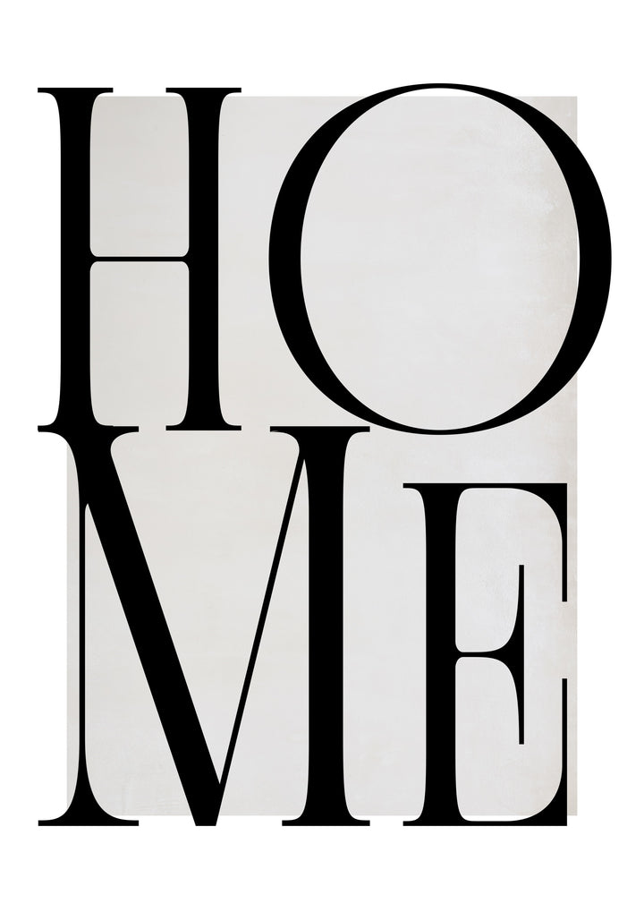The "Home" Typography Poster features the word "HOME" in bold, black serif letters against a muted grey background. This minimalist and graphic-style portrait print emphasizes clean lines and modern design, making it a perfect addition to any contemporary living space. Ideal for those who appreciate simple yet impactful home decor.