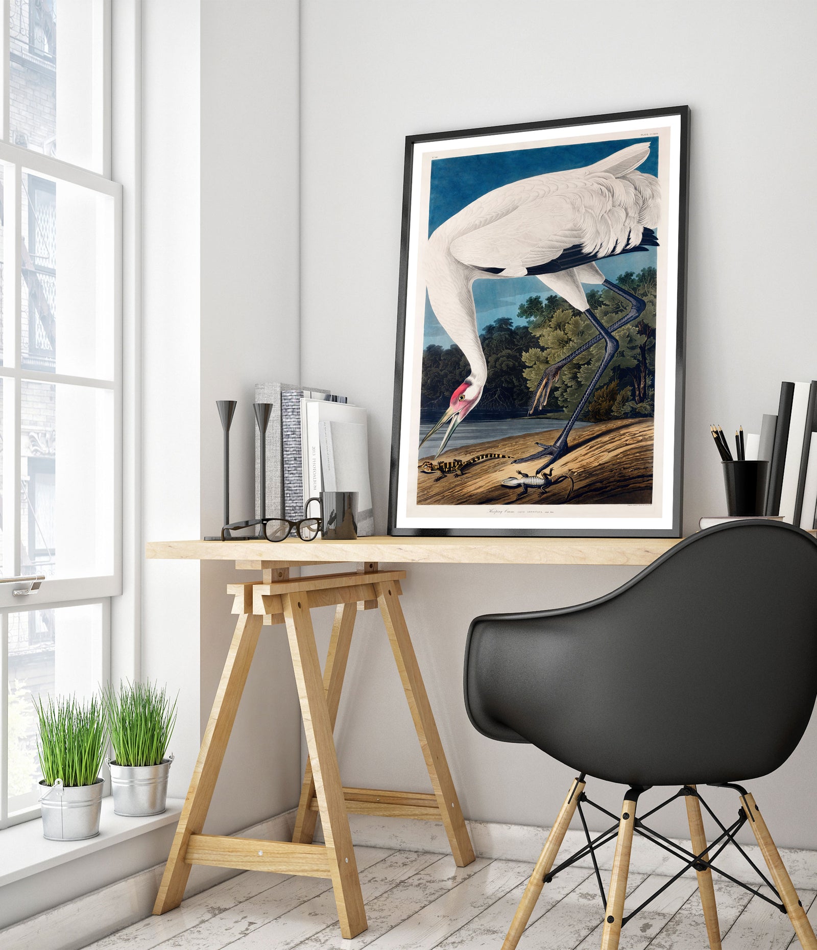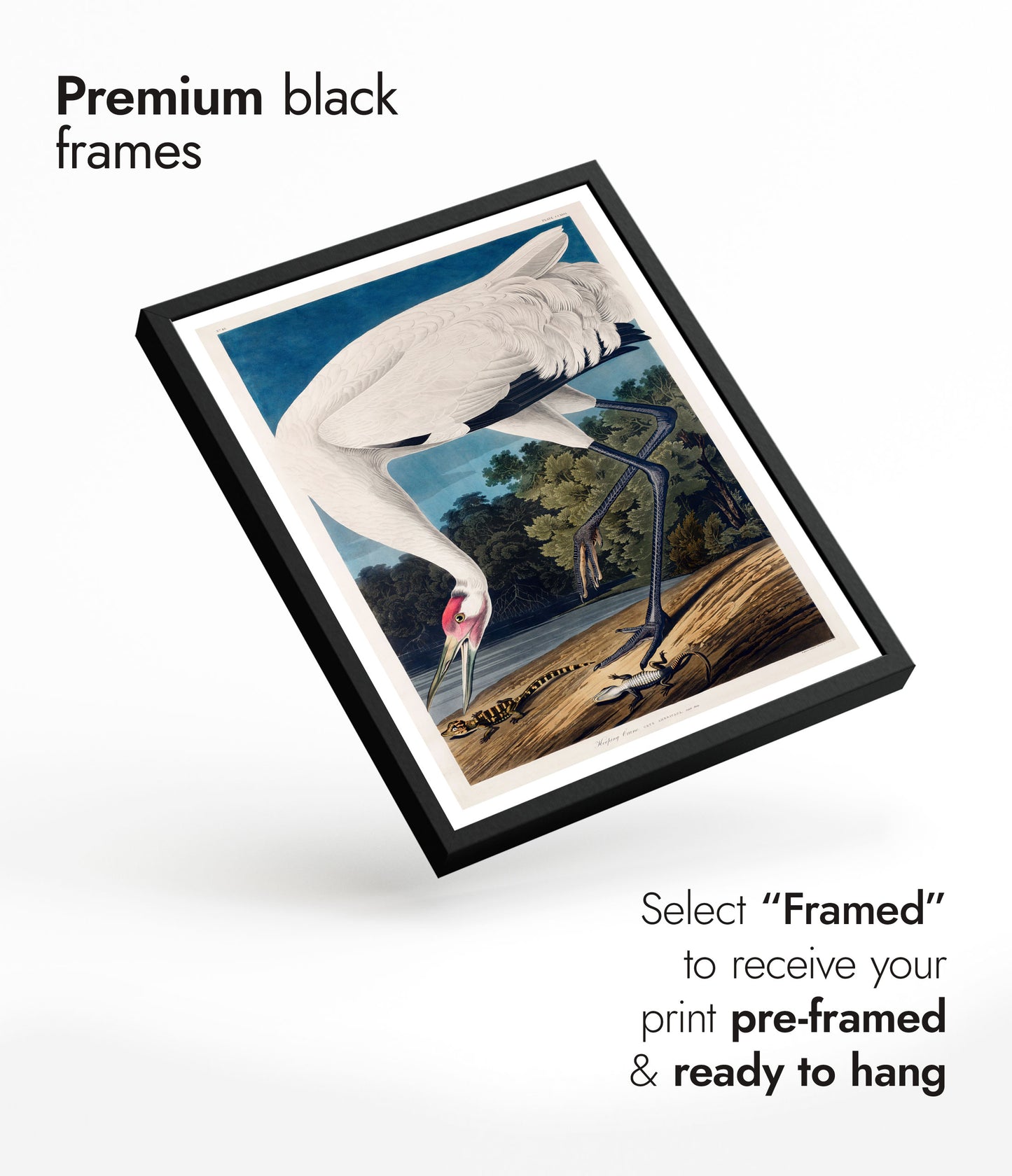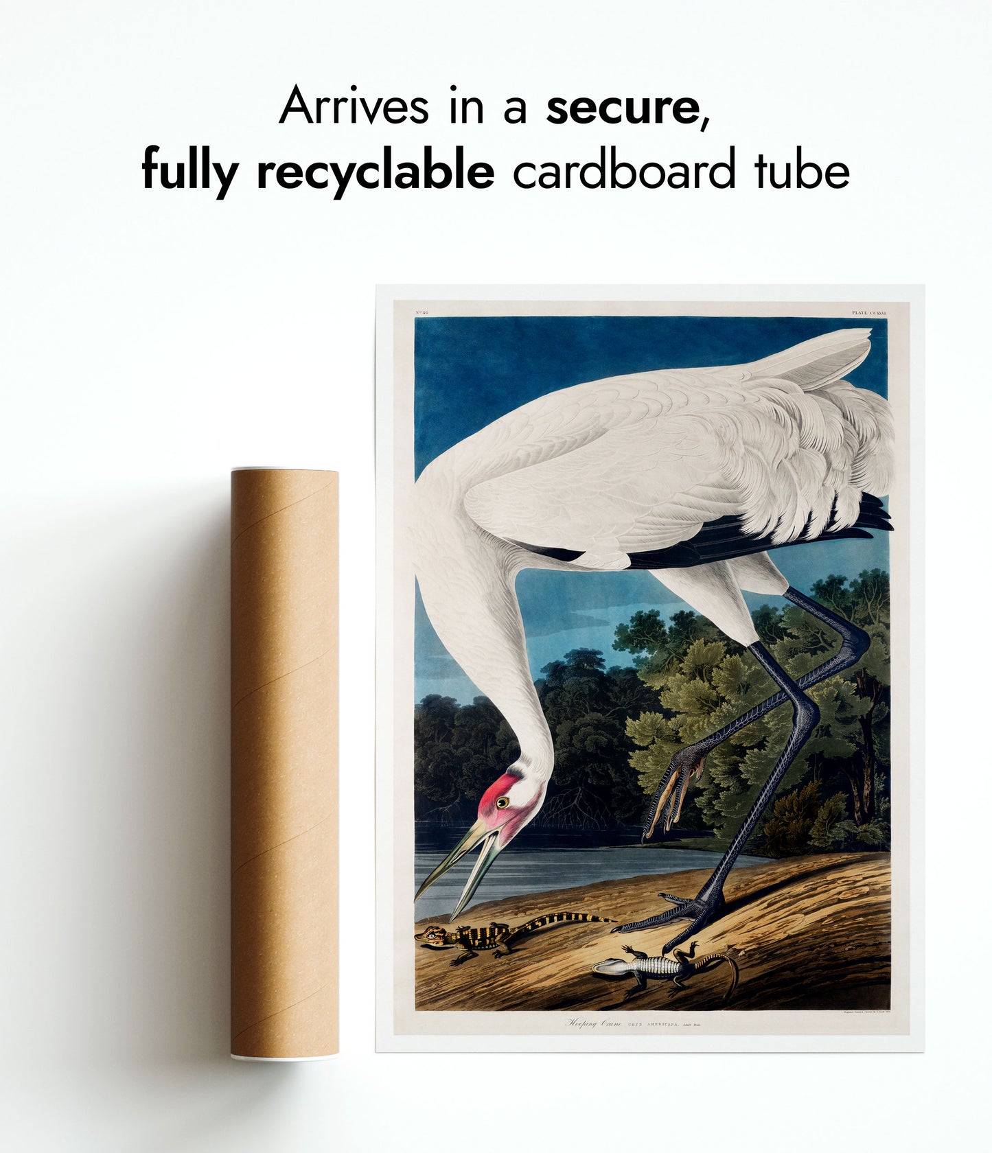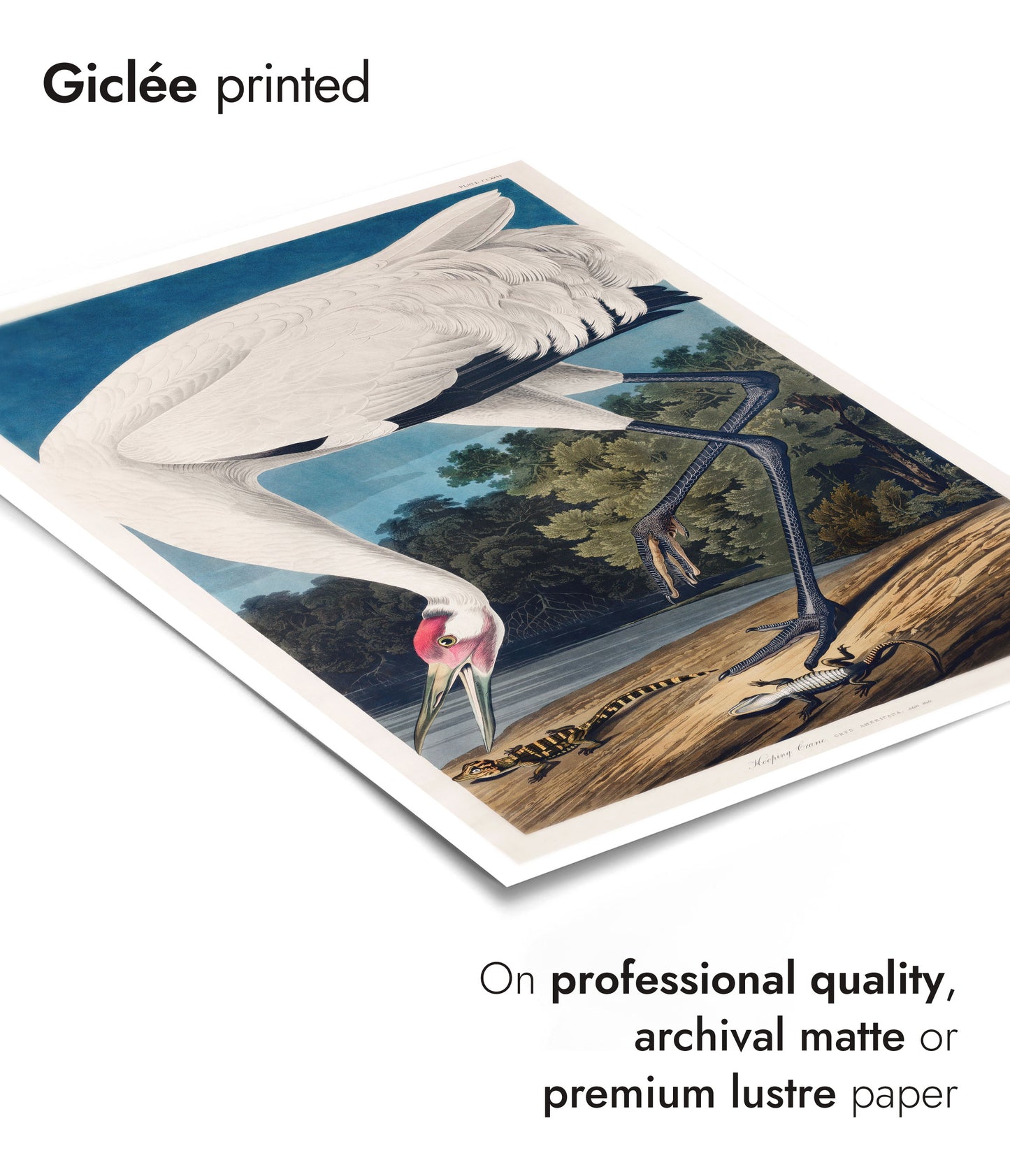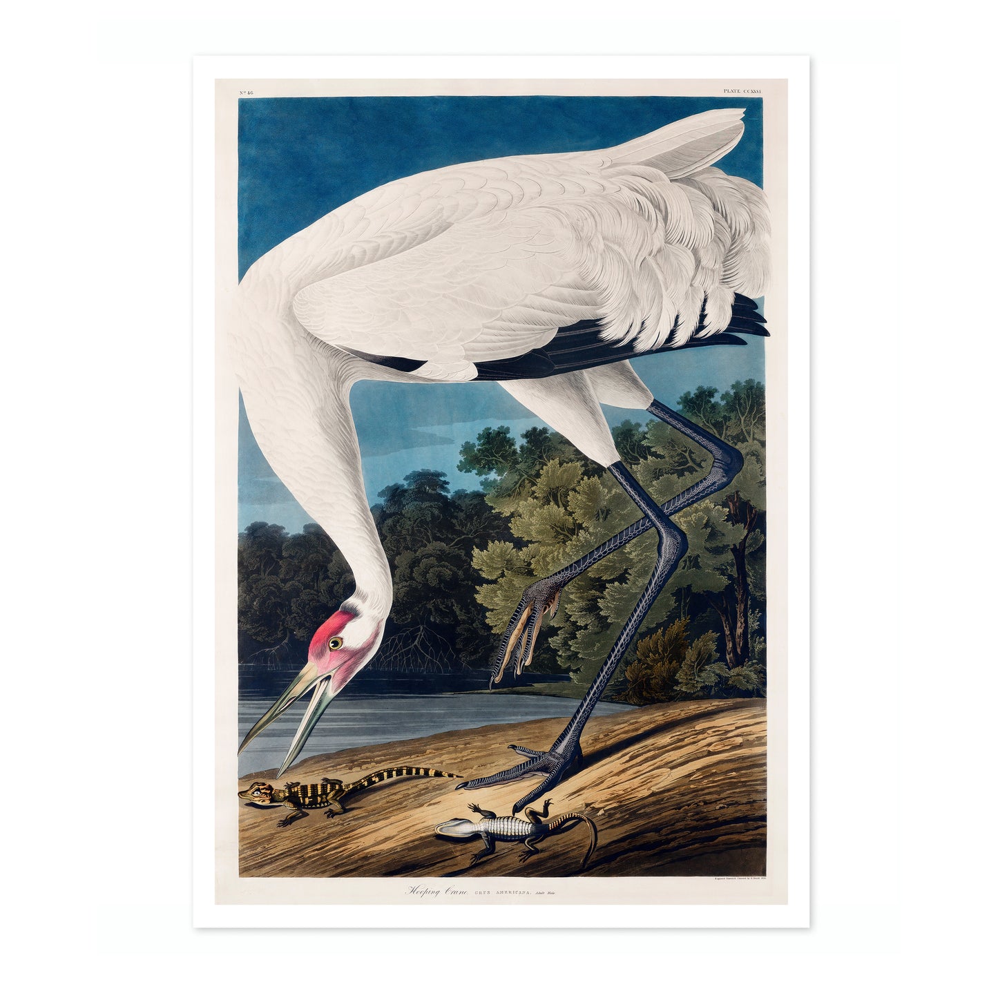 This "Hooping Crane" poster by John James Audubon captures a majestic crane standing gracefully by a serene lake, surrounded by lush forest foliage. The vintage illustration features intricate details in the bird's plumage and the natural environment, creating a timeless work of art. Perfect for nature and bird enthusiasts, this poster adds an elegant touch to any space.
