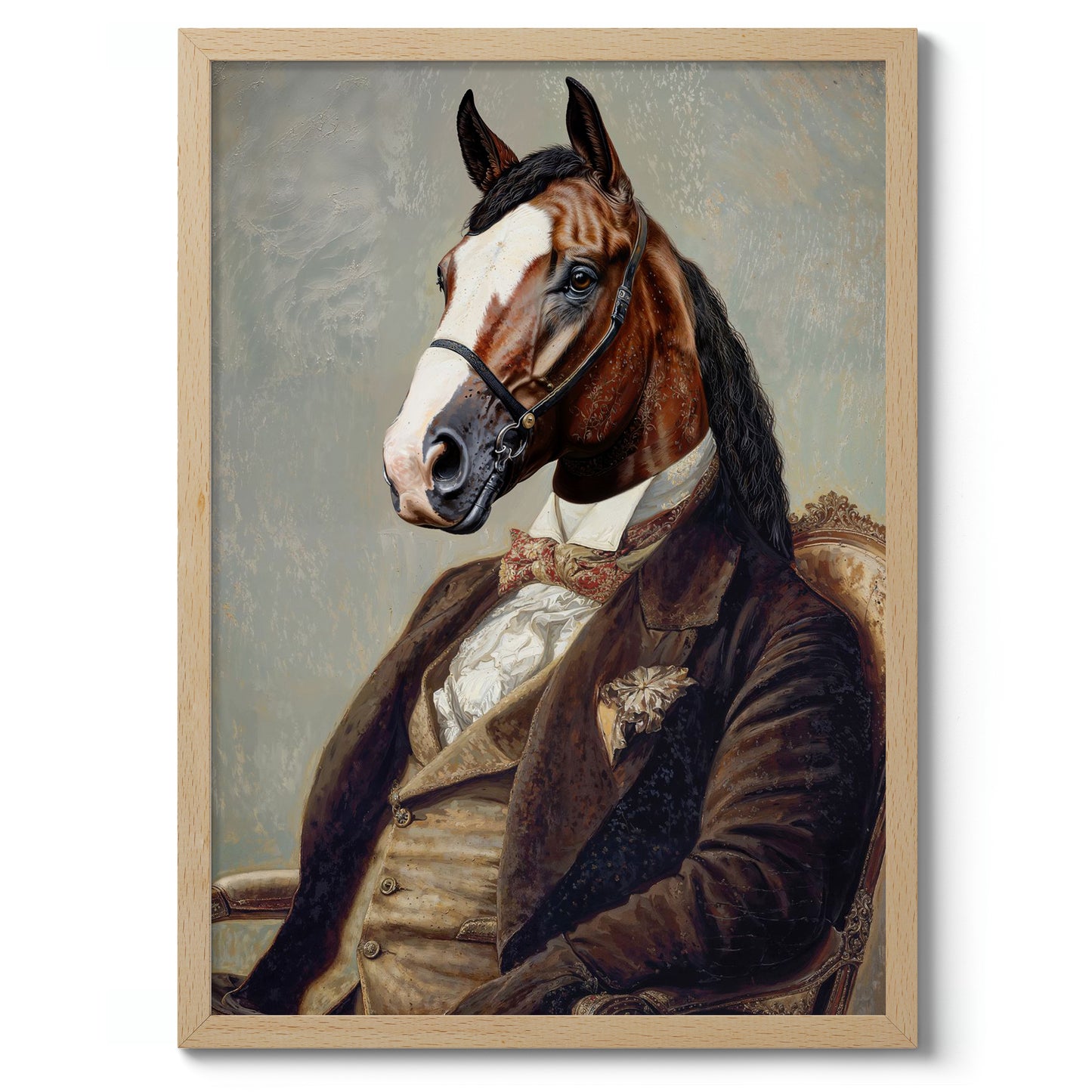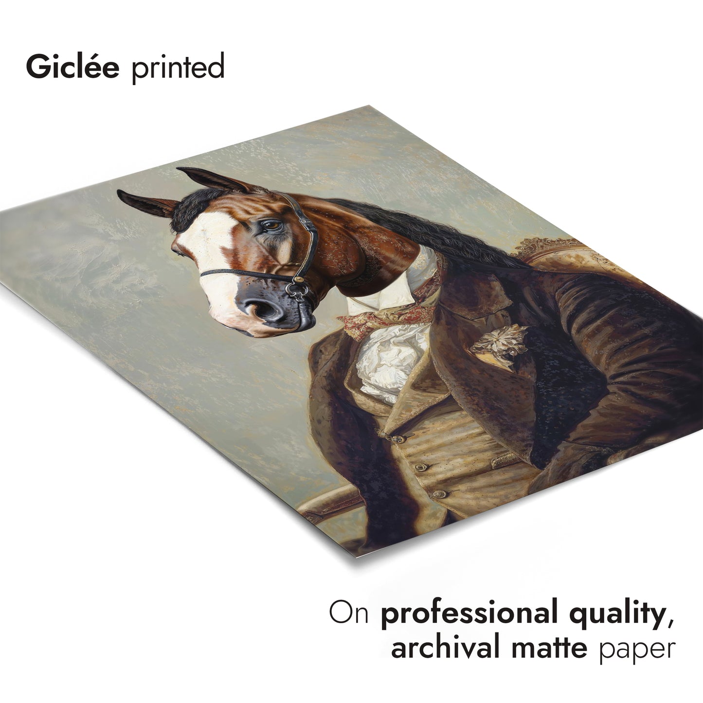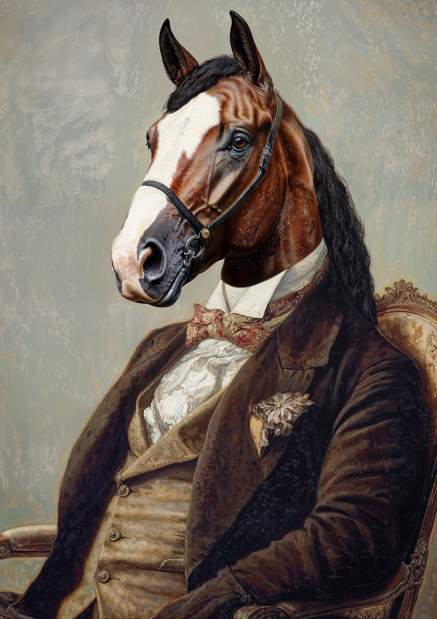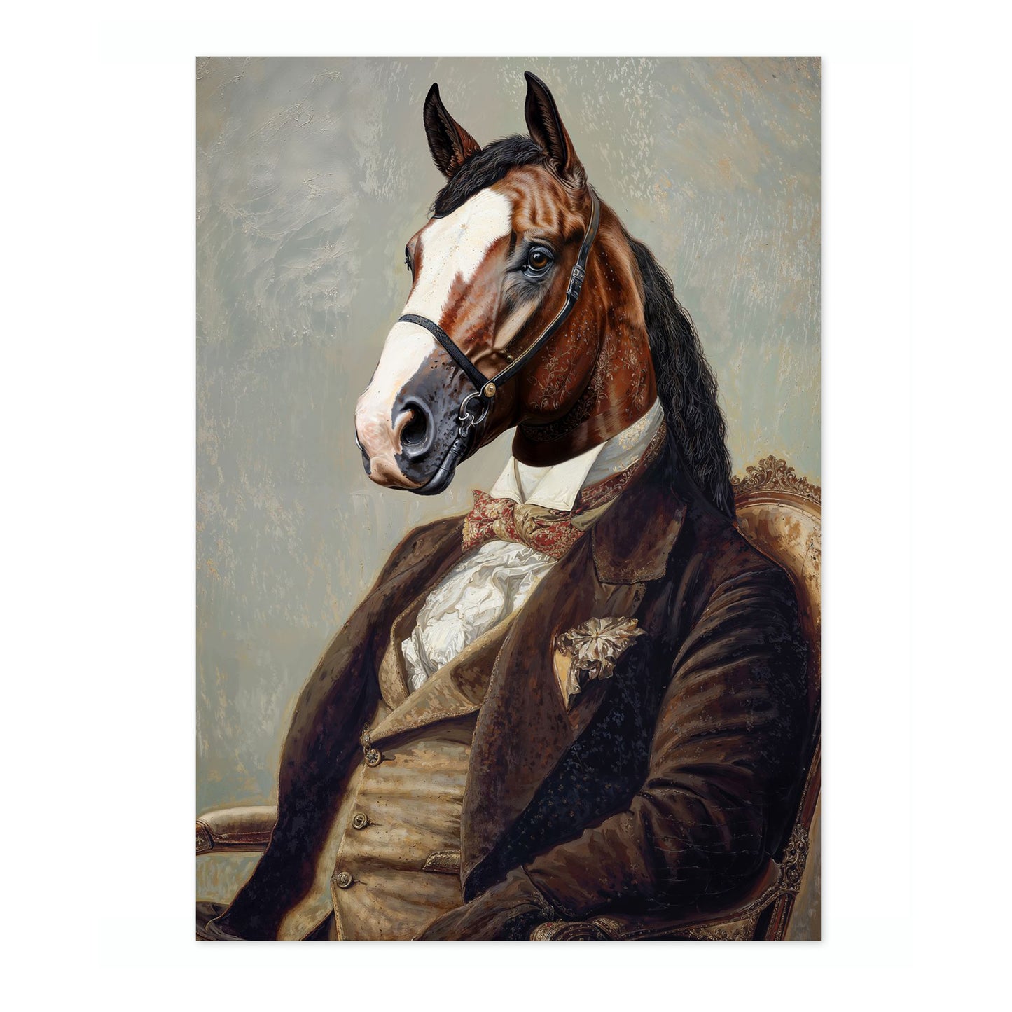 This whimsical poster features an illustration of a horse with a human body dressed in vintage attire. The historical costume includes an elegant suit and bow tie, creating an amusing fusion of human and animal characteristics. With detailed brushwork and rich browns, this unique art print is perfect for those who appreciate both humor and historical themes. Ideal for animal and vintage enthusiasts.