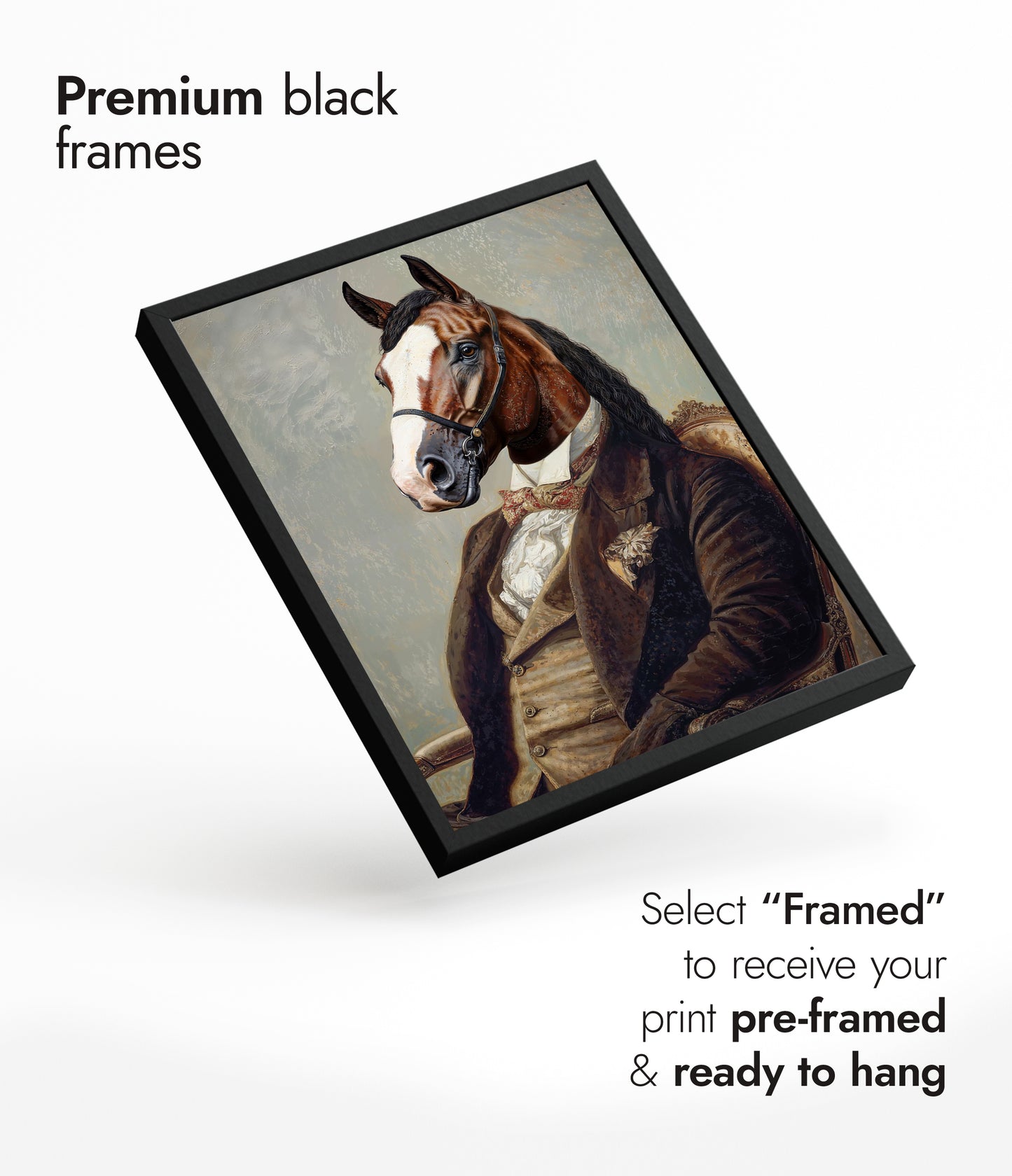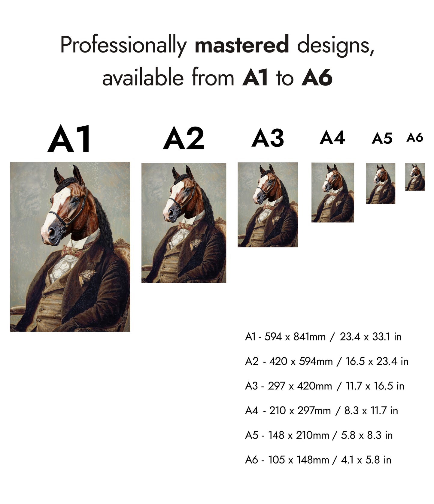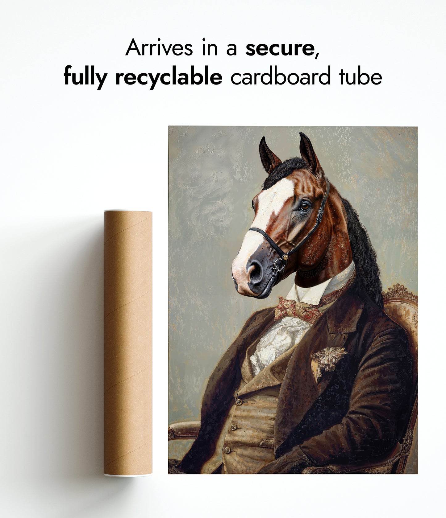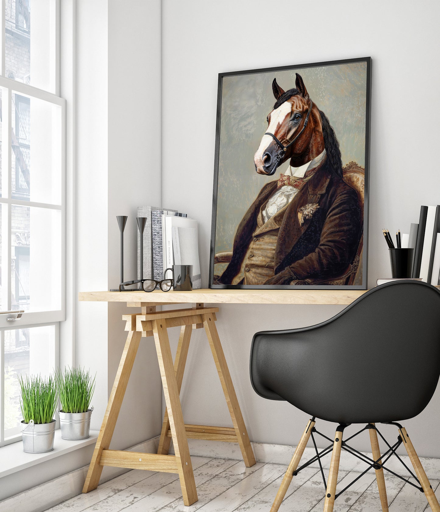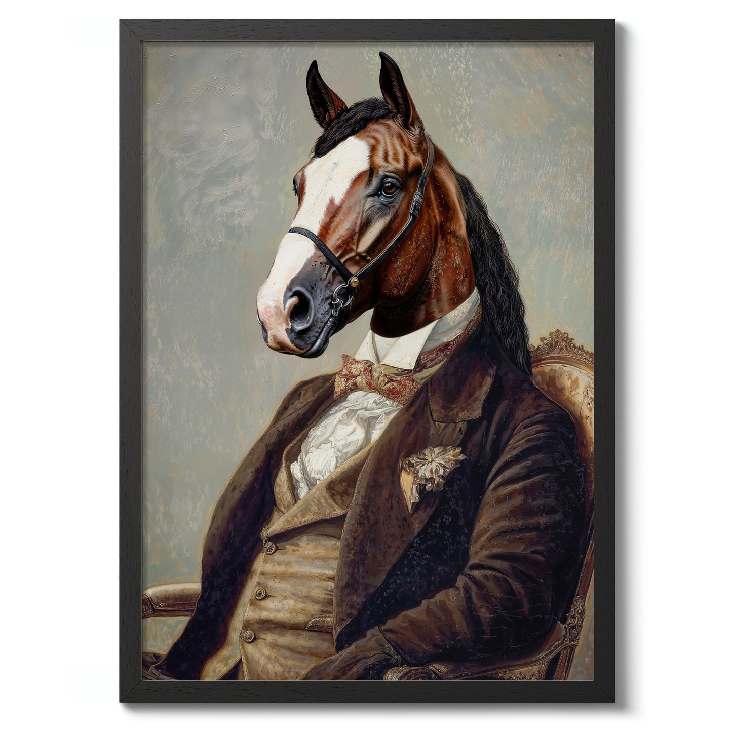 This whimsical poster features an illustration of a horse with a human body dressed in vintage attire. The historical costume includes an elegant suit and bow tie, creating an amusing fusion of human and animal characteristics. With detailed brushwork and rich browns, this unique art print is perfect for those who appreciate both humor and historical themes. Ideal for animal and vintage enthusiasts.