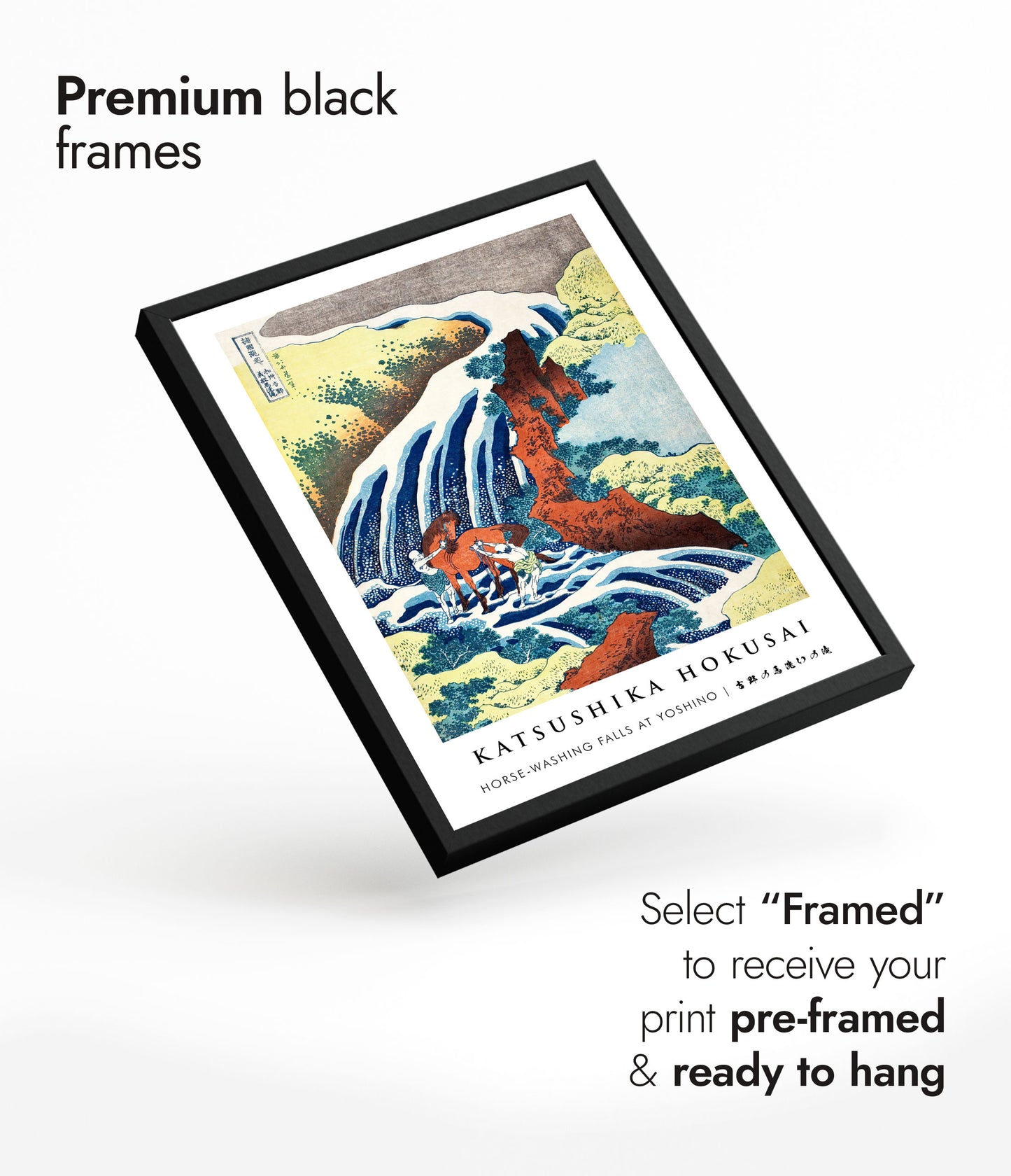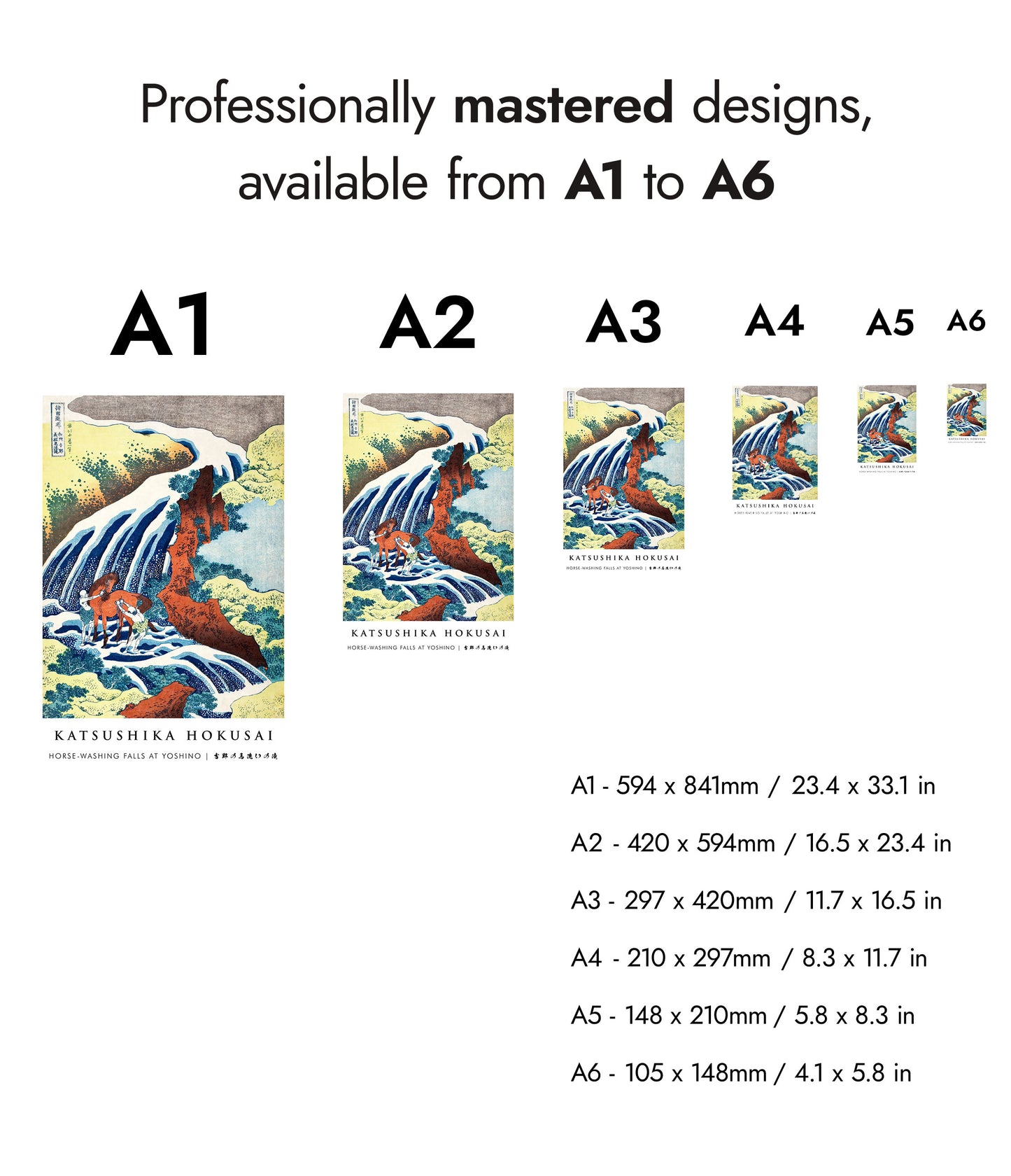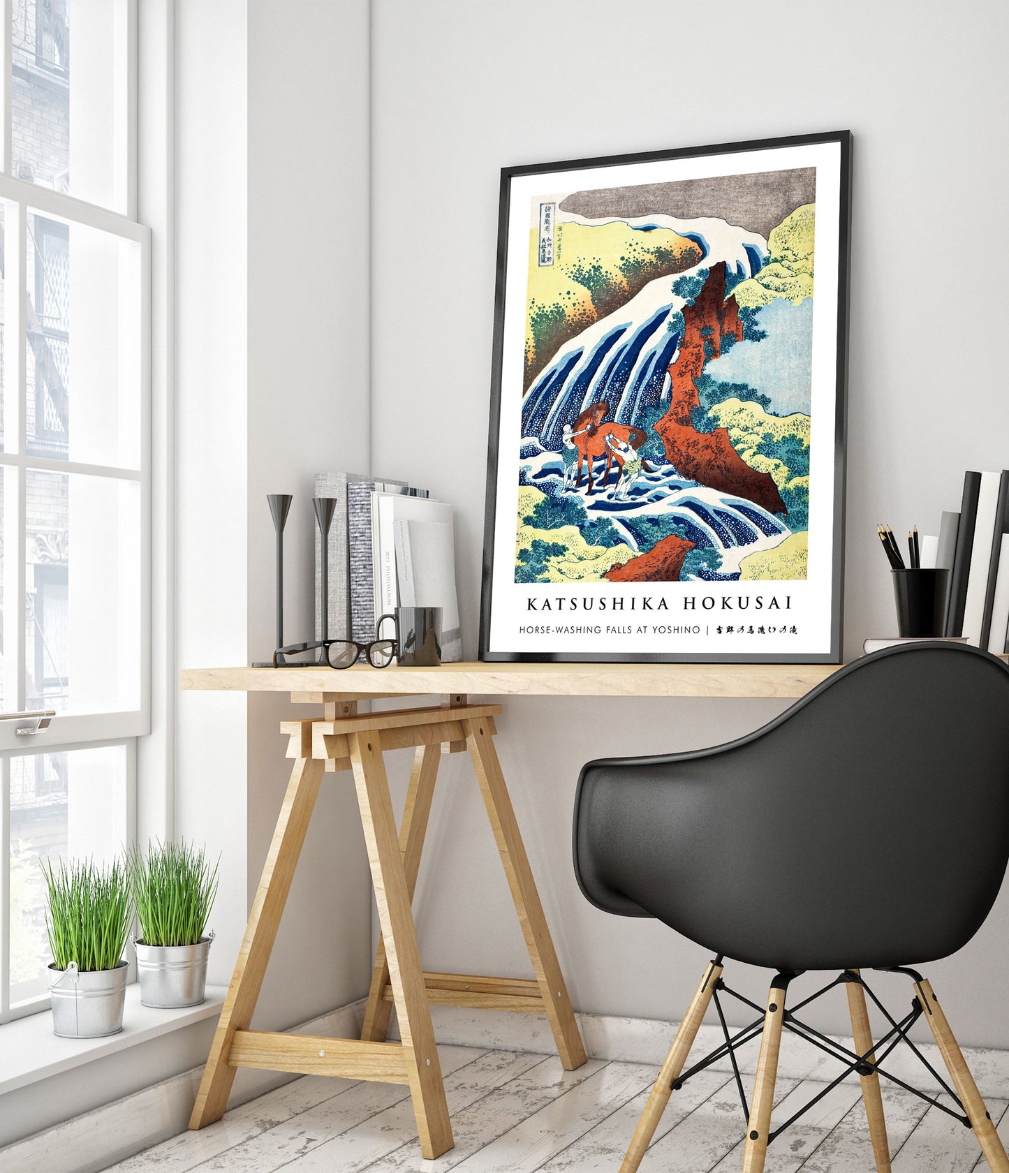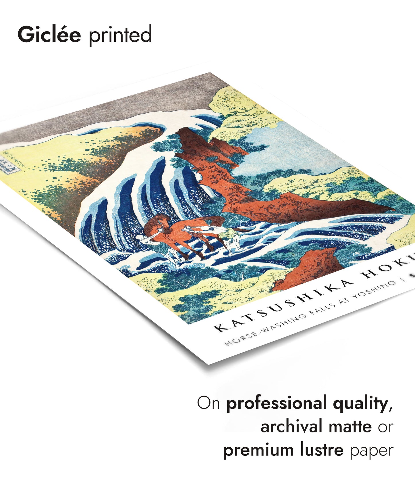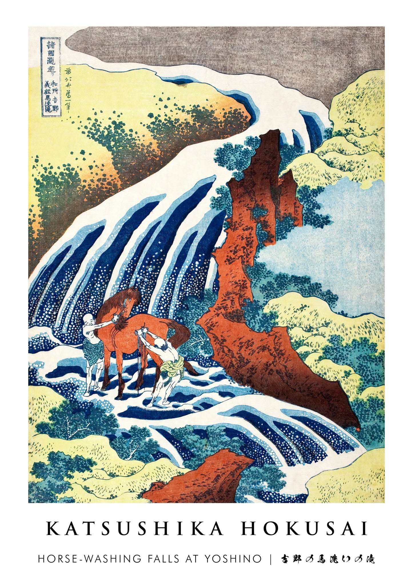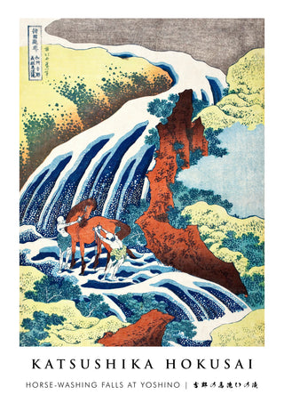 This poster features Katsushika Hokusai's "Horse-Washing Falls at Yoshino," showcasing a stunning traditional woodblock print from the Ukiyo-E genre. It captures a vibrant waterfall cascading over red cliffs, with a horse and a handler in the foreground. Ideal for lovers of Japanese art, this landscape piece emphasizes nature's beauty and fluid motion.