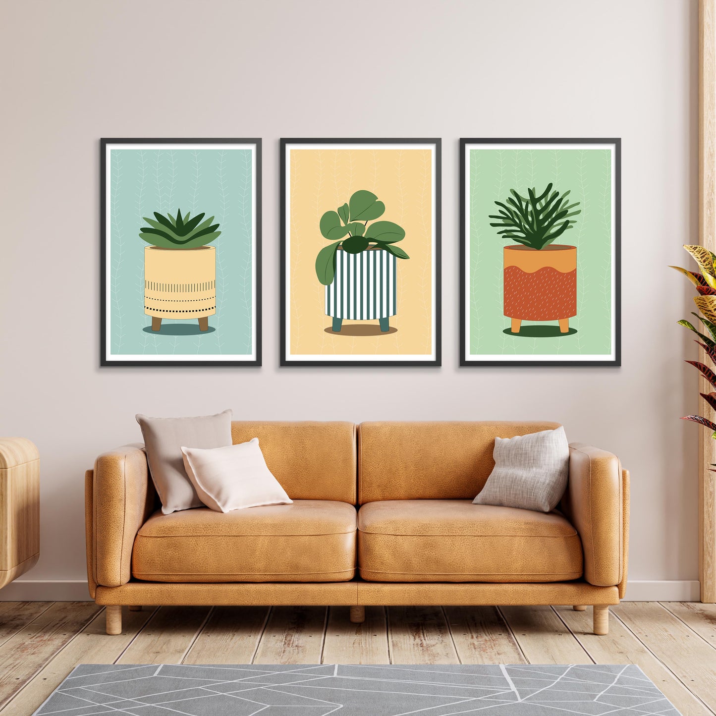 This vibrant houseplants triptych features modern graphic illustrations of potted plants against soothing green and yellow backdrops. Each plant poster showcases unique leaf shapes and colors, expertly blending contemporary design with a touch of nature's charm. This nature-inspired artwork brings a refreshing botanical essence to any space, appealing to fans of modern illustration and plant motifs.
