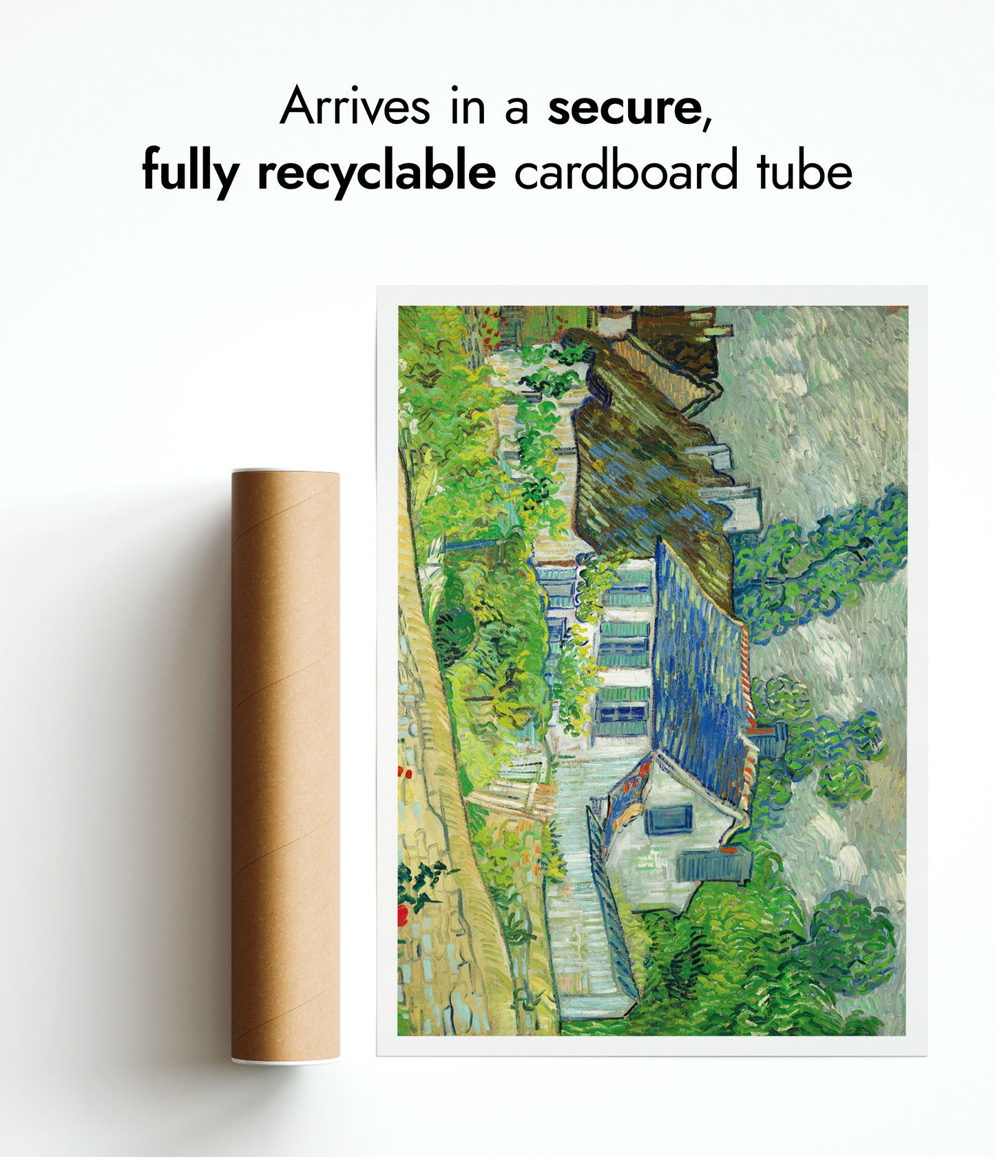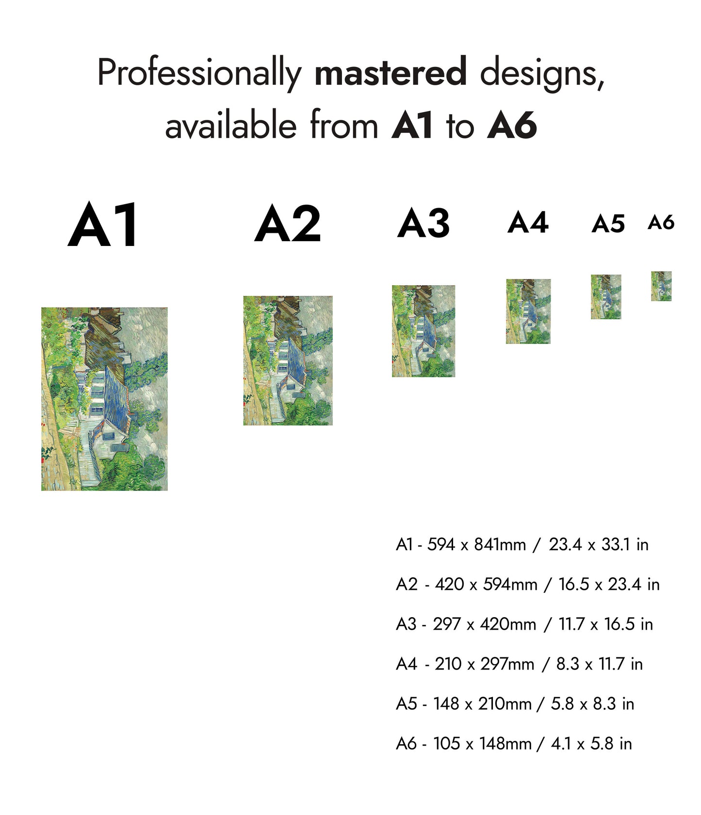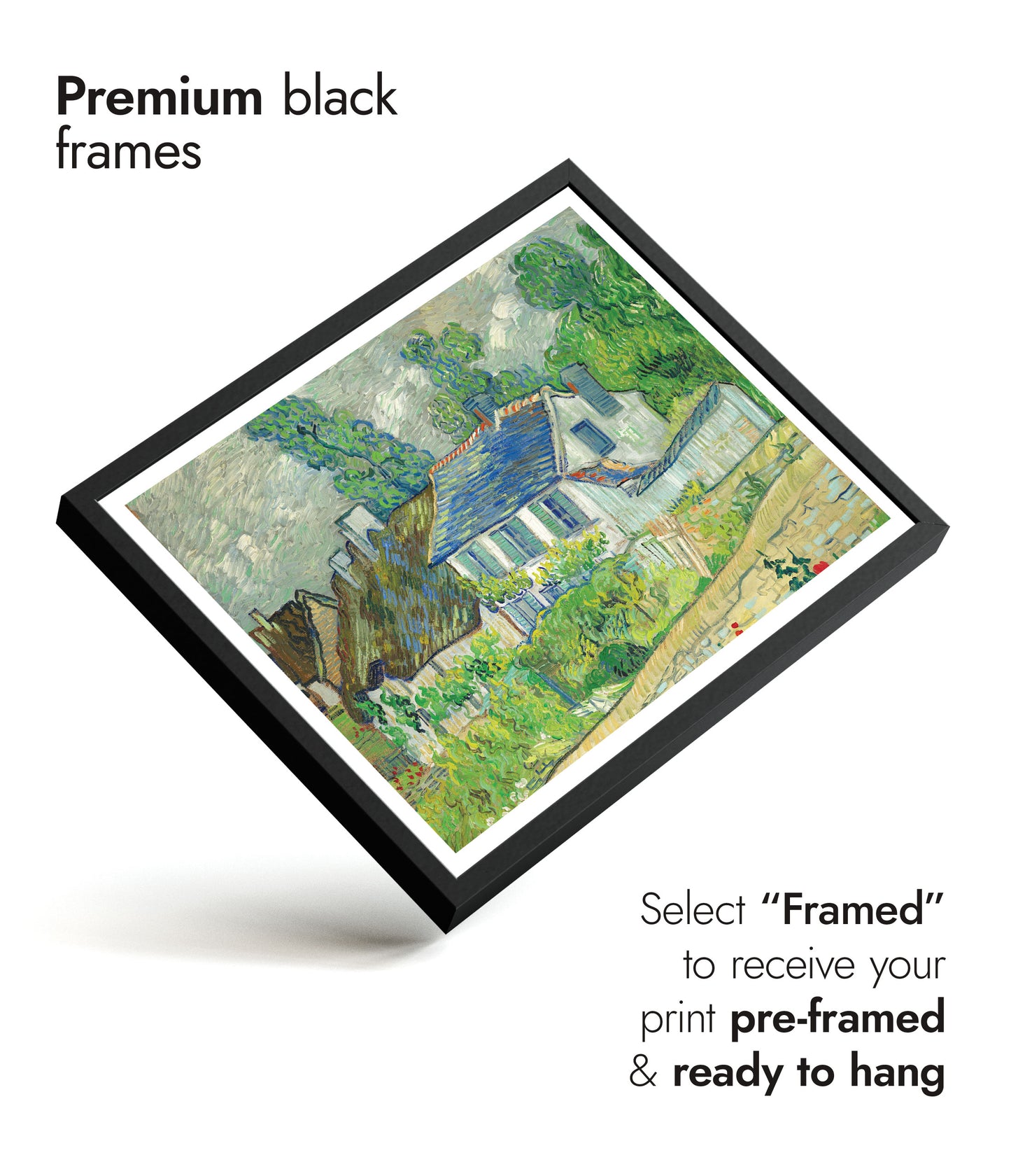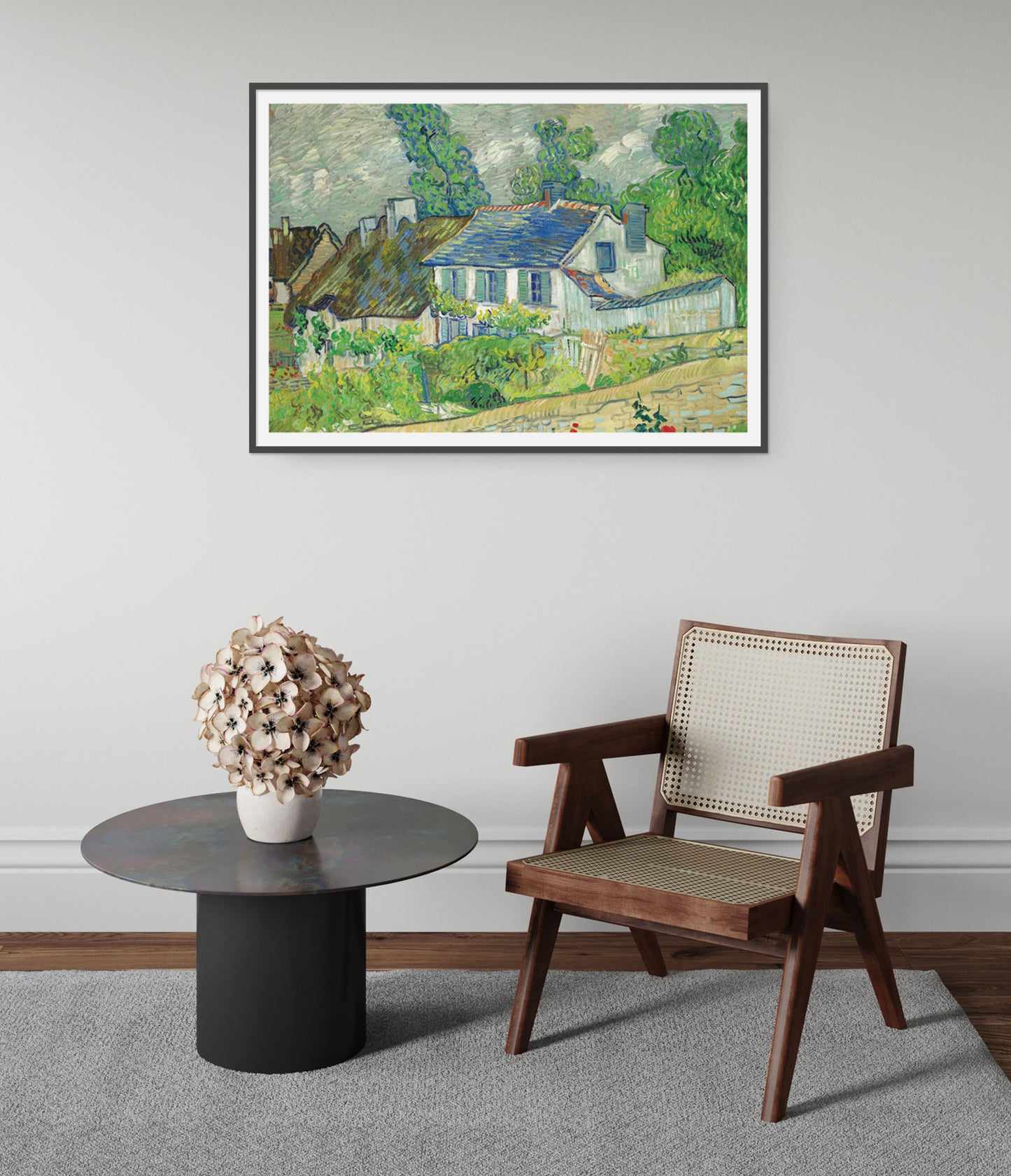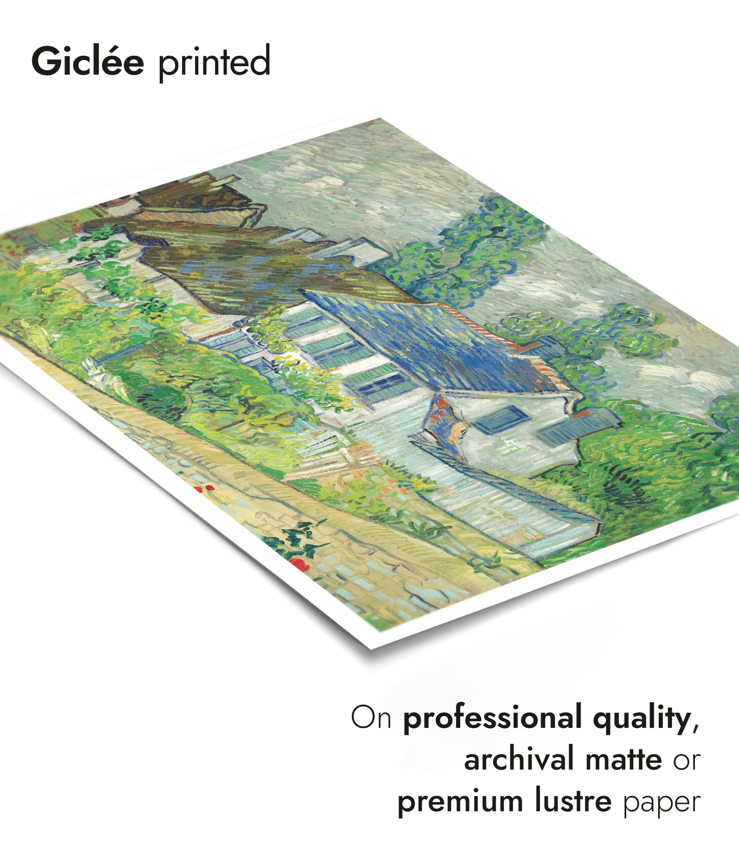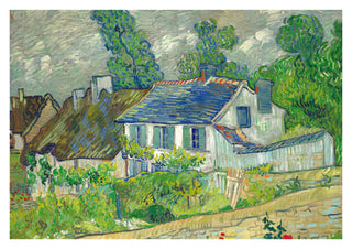 Capture the essence of Post-Impressionism with Vincent Van Gogh's "Houses at Auvers" poster. This artwork features rustic village houses surrounded by lush greenery under a swirling, textured sky. The vibrant, expressive strokes embody Van Gogh's signature style, bringing the tranquil village scene to life. Ideal for art enthusiasts and admirers of classic landscapes.
