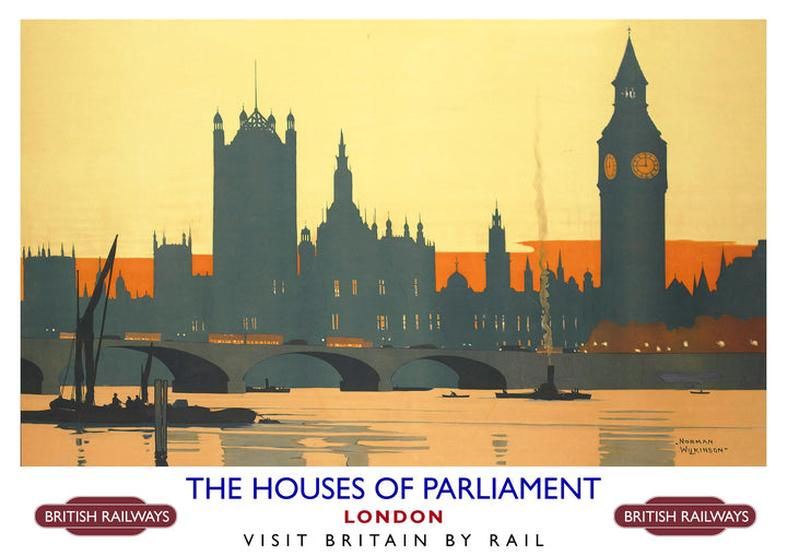 This vintage-style landscape poster titled "Houses of Parliament" captures the iconic silhouette of London's Westminster against a sunset sky. The scene, elevated by British Railways branding, prominently features Big Ben, the River Thames, and commuter boats, offering a nostalgic view of England's capital. Perfect for enthusiasts of travel illustration and London landmarks.
