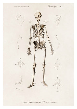 This vintage portrait poster by Charles D'Orbigny intricately depicts the human skeleton. Showcasing a detailed anatomical illustration, the skeletal structure is complemented by various bone sketches surrounding it. Ideal for those with an interest in human anatomy and vintage art, this poster blends scientific precision with artistic elegance, making it a captivating piece for study or decor.
