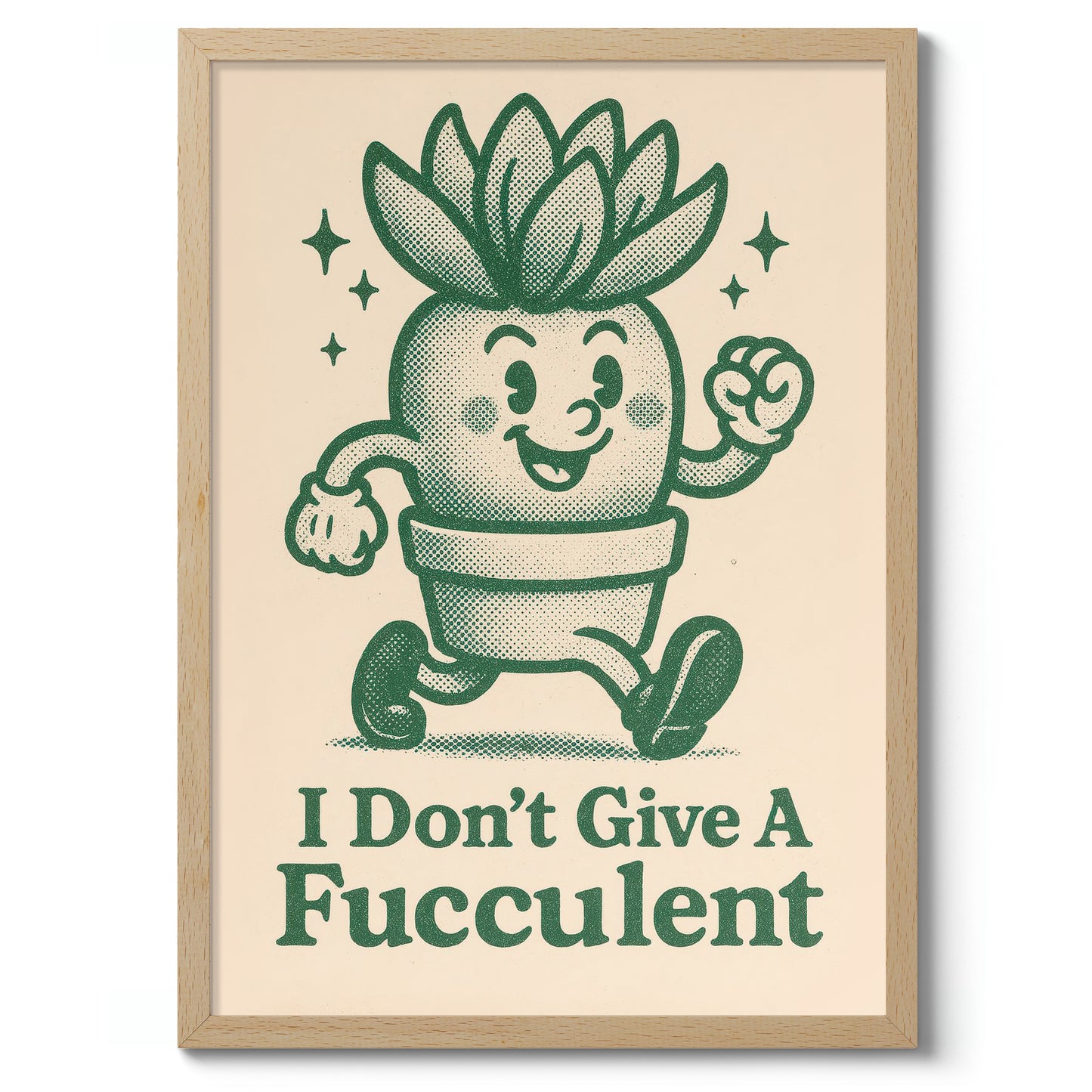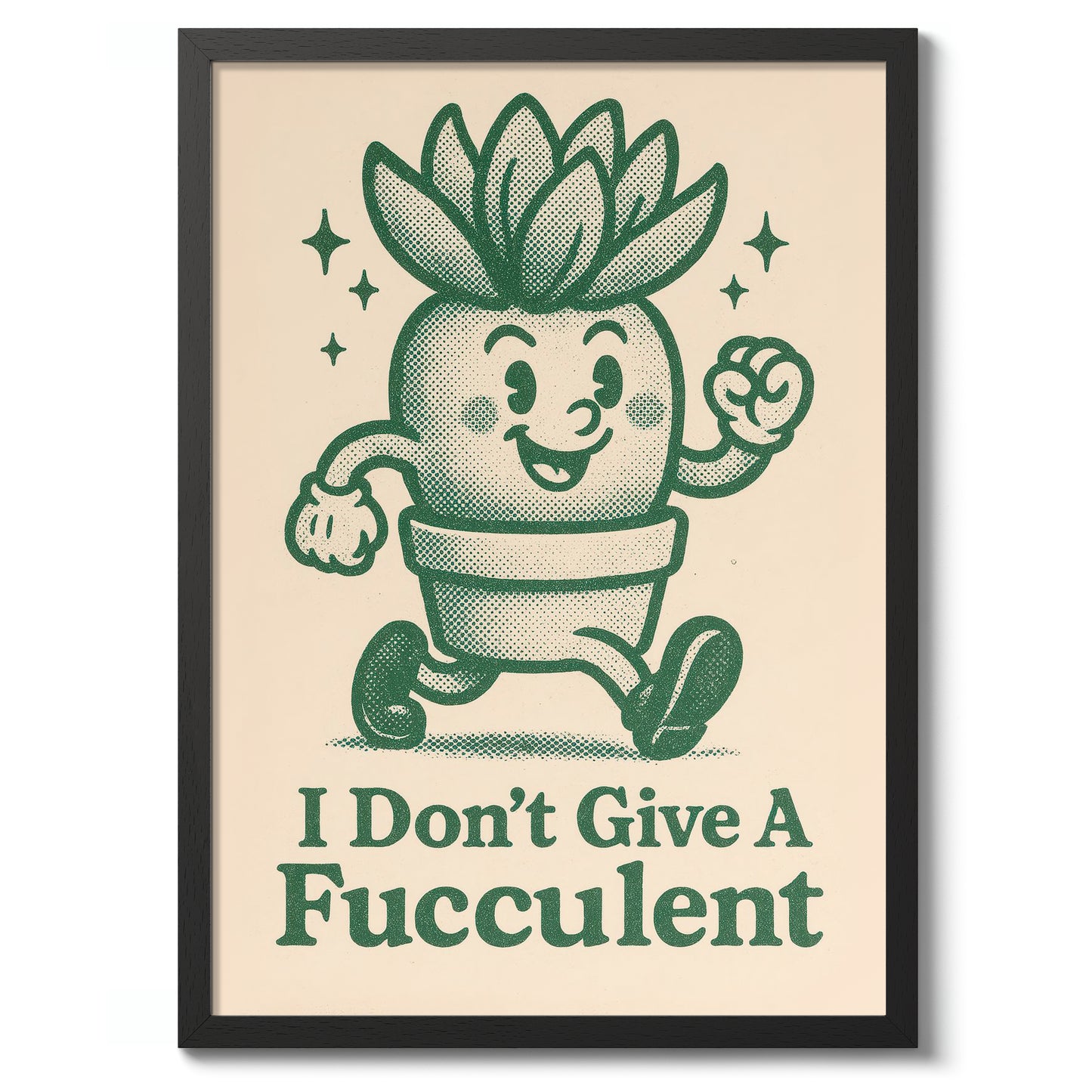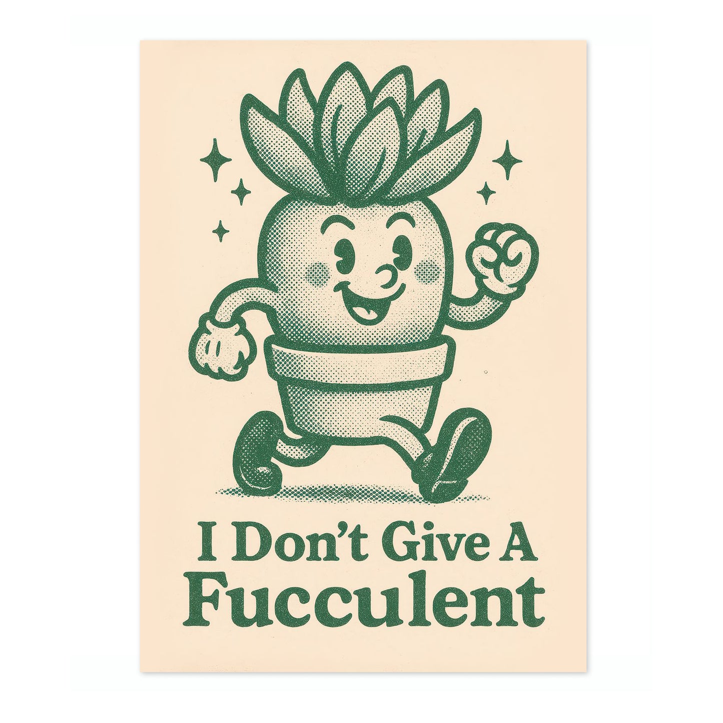This whimsical poster features a vintage-style illustration of a cheerful cactus mascot with a wry twist on a classic phrase: "I Don't Give A Fucculent." The playful design, paired with bold typography, adds humor and charm, ideal for plant enthusiasts or fans of quirky art. The retro aesthetic and delightful character make this a standout piece for any space.