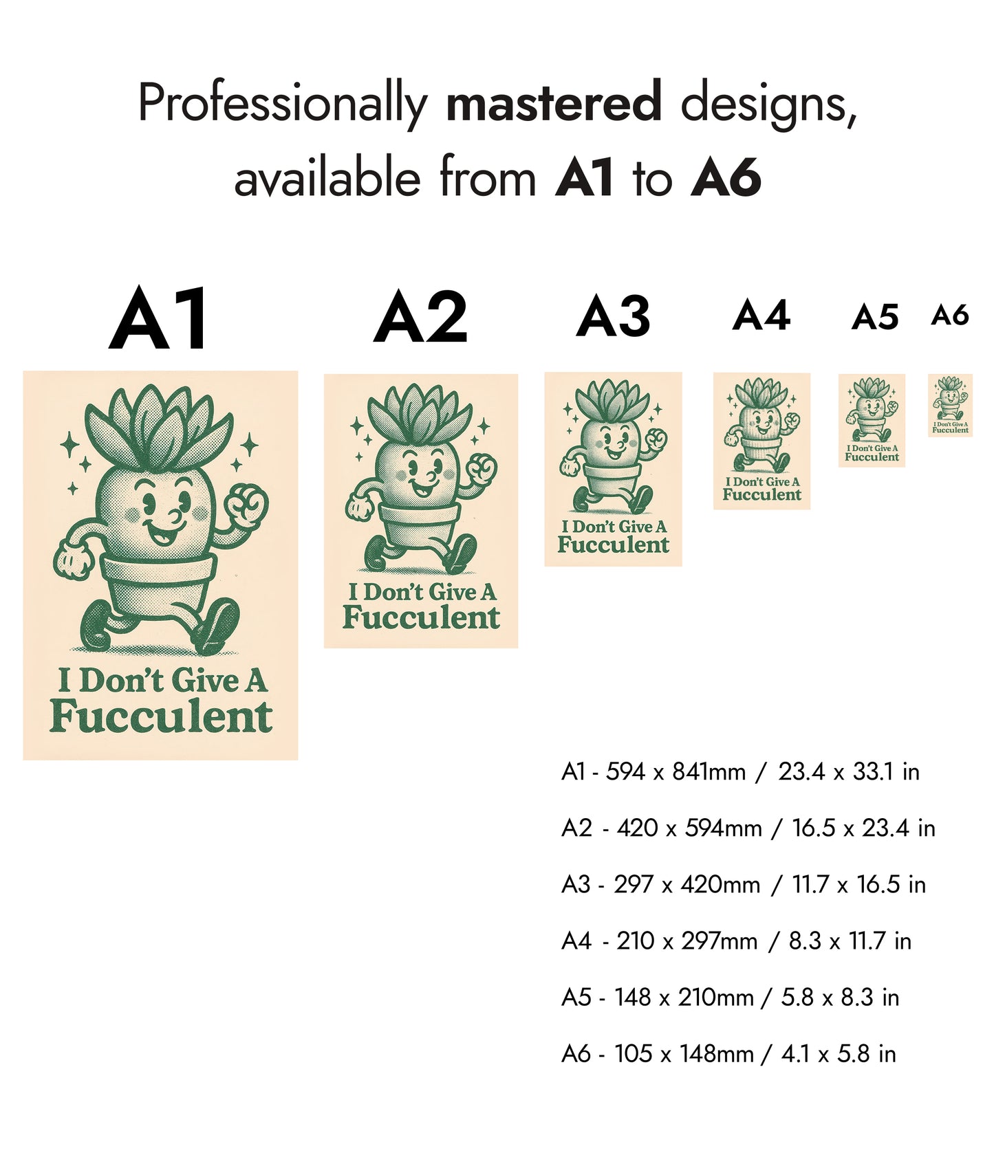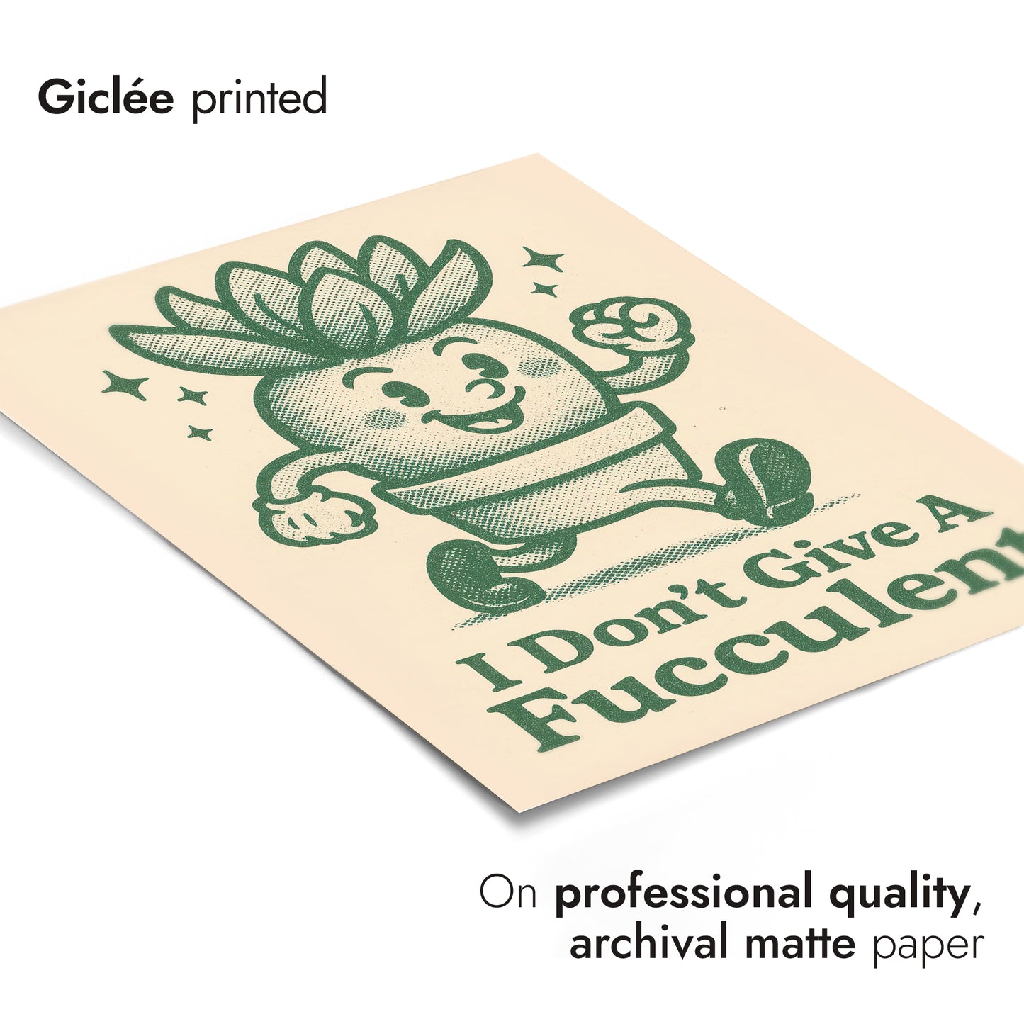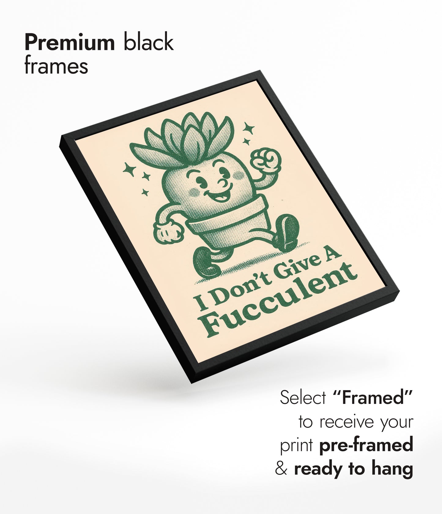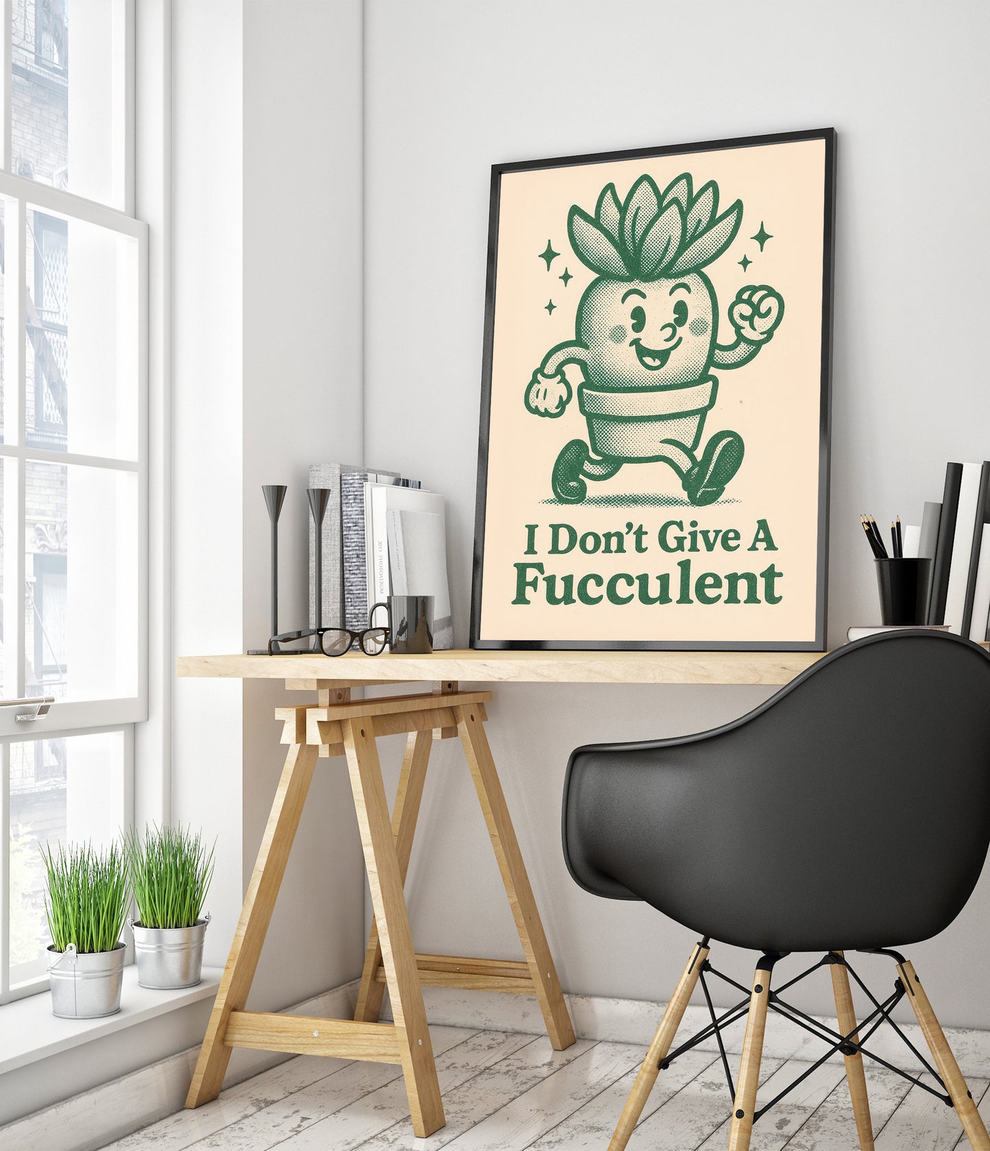 This whimsical poster features a vintage-style illustration of a cheerful cactus mascot with a wry twist on a classic phrase: "I Don't Give A Fucculent." The playful design, paired with bold typography, adds humor and charm, ideal for plant enthusiasts or fans of quirky art. The retro aesthetic and delightful character make this a standout piece for any space.